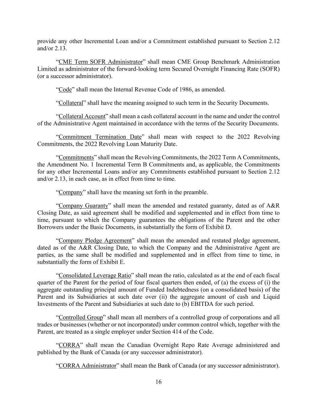 16 provide any other Incremental Loan and/or a Commitment established pursuant to Section 2.12 and/or 2.13. “CME Term SOFR Administrator” shall mean CME Group Benchmark Administration Limited as administrator of the forward-looking term Secured Overnight Financing Rate (SOFR) (or a successor administrator). “Code” shall mean the Internal Revenue Code of 1986, as amended. “Collateral” shall have the meaning assigned to such term in the Security Documents. “Collateral Account” shall mean a cash collateral account in the name and under the control of the Administrative Agent maintained in accordance with the terms of the Security Documents. “Commitment Termination Date” shall mean with respect to the 2022 Revolving Commitments, the 2022 Revolving Loan Maturity Date. “Commitments” shall mean the Revolving Commitments, the 2022 Term A Commitments, the Amendment No. 1 Incremental Term B Commitments and, as applicable, the Commitments for any other Incremental Loans and/or any Commitments established pursuant to Section 2.12 and/or 2.13, in each case, as in effect from time to time. “Company” shall have the meaning set forth in the preamble. “Company Guaranty” shall mean the amended and restated guaranty, dated as of A&R Closing Date, as said agreement shall be modified and supplemented and in effect from time to time, pursuant to which the Company guarantees the obligations of the Parent and the other Borrowers under the Basic Documents, in substantially the form of Exhibit D. “Company Pledge Agreement” shall mean the amended and restated pledge agreement, dated as of the A&R Closing Date, to which the Company and the Administrative Agent are parties, as the same shall be modified and supplemented and in effect from time to time, in substantially the form of Exhibit E. “Consolidated Leverage Ratio” shall mean the ratio, calculated as at the end of each fiscal quarter of the Parent for the period of four fiscal quarters then ended, of (a) the excess of (i) the aggregate outstanding principal amount of Funded Indebtedness (on a consolidated basis) of the Parent and its Subsidiaries at such date over (ii) the aggregate amount of cash and Liquid Investments of the Parent and Subsidiaries at such date to (b) EBITDA for such period. “Controlled Group” shall mean all members of a controlled group of corporations and all trades or businesses (whether or not incorporated) under common control which, together with the Parent, are treated as a single employer under Section 414 of the Code. “CORRA” shall mean the Canadian Overnight Repo Rate Average administered and published by the Bank of Canada (or any successor administrator). “CORRA Administrator” shall mean the Bank of Canada (or any successor administrator).