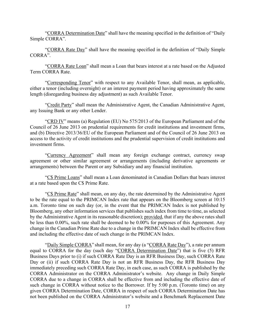 17 “CORRA Determination Date” shall have the meaning specified in the definition of “Daily Simple CORRA”. “CORRA Rate Day” shall have the meaning specified in the definition of “Daily Simple CORRA”. “CORRA Rate Loan” shall mean a Loan that bears interest at a rate based on the Adjusted Term CORRA Rate. “Corresponding Tenor” with respect to any Available Tenor, shall mean, as applicable, either a tenor (including overnight) or an interest payment period having approximately the same length (disregarding business day adjustment) as such Available Tenor. “Credit Party” shall mean the Administrative Agent, the Canadian Administrative Agent, any Issuing Bank or any other Lender. “CRD IV” means (a) Regulation (EU) No 575/2013 of the European Parliament and of the Council of 26 June 2013 on prudential requirements for credit institutions and investment firms, and (b) Directive 2013/36/EU of the European Parliament and of the Council of 26 June 2013 on access to the activity of credit institutions and the prudential supervision of credit institutions and investment firms. “Currency Agreement” shall mean any foreign exchange contract, currency swap agreement or other similar agreement or arrangements (including derivative agreements or arrangements) between the Parent or any Subsidiary and any financial institution. “C$ Prime Loans” shall mean a Loan denominated in Canadian Dollars that bears interest at a rate based upon the C$ Prime Rate. “C$ Prime Rate” shall mean, on any day, the rate determined by the Administrative Agent to be the rate equal to the PRIMCAN Index rate that appears on the Bloomberg screen at 10:15 a.m. Toronto time on such day (or, in the event that the PRIMCAN Index is not published by Bloomberg, any other information services that publishes such index from time to time, as selected by the Administrative Agent in its reasonable discretion); provided, that if any the above rates shall be less than 0.00%, such rate shall be deemed to be 0.00% for purposes of this Agreement. Any change in the Canadian Prime Rate due to a change in the PRIMCAN Index shall be effective from and including the effective date of such change in the PRIMCAN Index. “Daily Simple CORRA” shall mean, for any day (a “CORRA Rate Day”), a rate per annum equal to CORRA for the day (such day “CORRA Determination Date”) that is five (5) RFR Business Days prior to (i) if such CORRA Rate Day is an RFR Business Day, such CORRA Rate Day or (ii) if such CORRA Rate Day is not an RFR Business Day, the RFR Business Day immediately preceding such CORRA Rate Day, in each case, as such CORRA is published by the CORRA Administrator on the CORRA Administrator’s website. Any change in Daily Simple CORRA due to a change in CORRA shall be effective from and including the effective date of such change in CORRA without notice to the Borrower. If by 5:00 p.m. (Toronto time) on any given CORRA Determination Date, CORRA in respect of such CORRA Determination Date has not been published on the CORRA Administrator’s website and a Benchmark Replacement Date