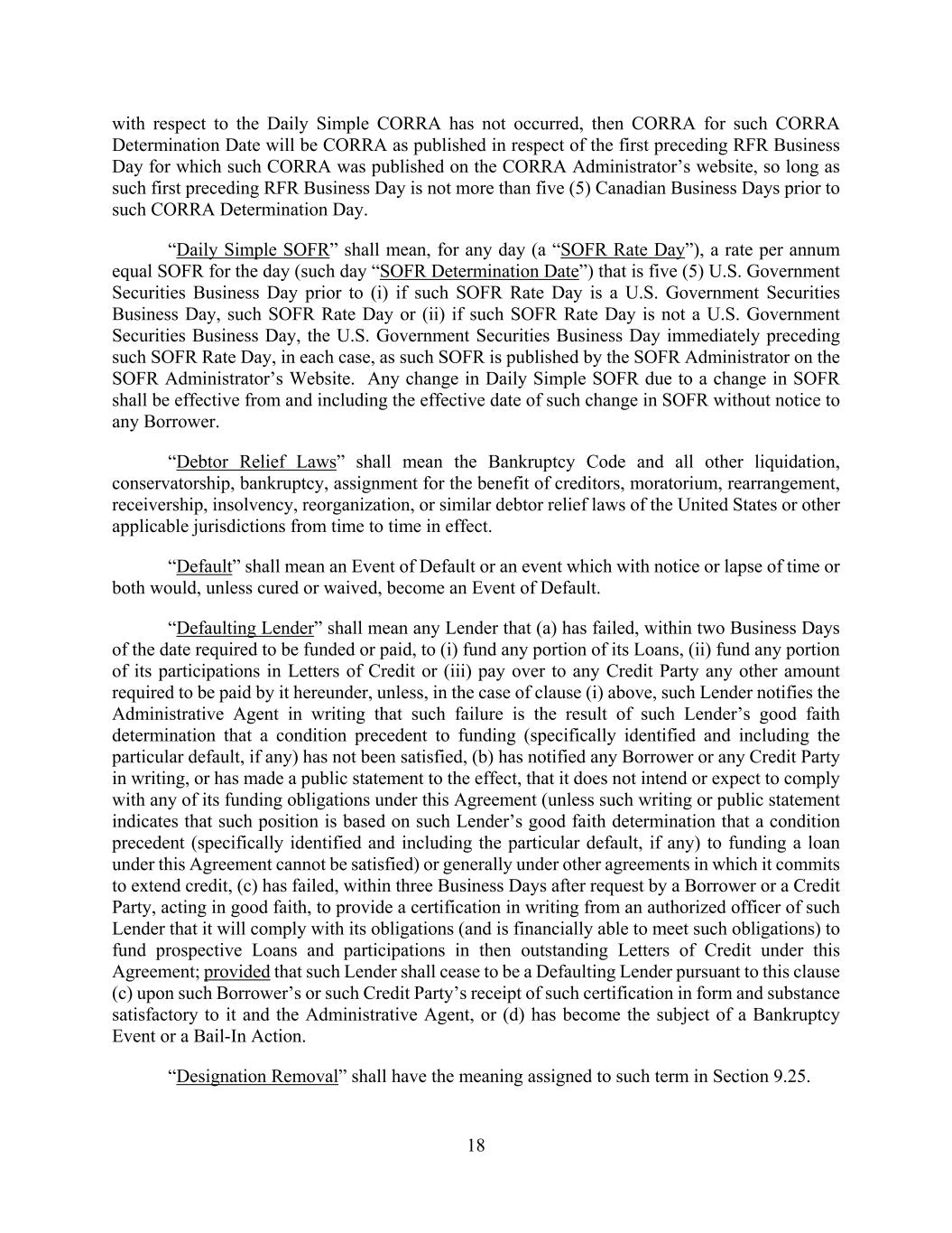 18 with respect to the Daily Simple CORRA has not occurred, then CORRA for such CORRA Determination Date will be CORRA as published in respect of the first preceding RFR Business Day for which such CORRA was published on the CORRA Administrator’s website, so long as such first preceding RFR Business Day is not more than five (5) Canadian Business Days prior to such CORRA Determination Day. “Daily Simple SOFR” shall mean, for any day (a “SOFR Rate Day”), a rate per annum equal SOFR for the day (such day “SOFR Determination Date”) that is five (5) U.S. Government Securities Business Day prior to (i) if such SOFR Rate Day is a U.S. Government Securities Business Day, such SOFR Rate Day or (ii) if such SOFR Rate Day is not a U.S. Government Securities Business Day, the U.S. Government Securities Business Day immediately preceding such SOFR Rate Day, in each case, as such SOFR is published by the SOFR Administrator on the SOFR Administrator’s Website. Any change in Daily Simple SOFR due to a change in SOFR shall be effective from and including the effective date of such change in SOFR without notice to any Borrower. “Debtor Relief Laws” shall mean the Bankruptcy Code and all other liquidation, conservatorship, bankruptcy, assignment for the benefit of creditors, moratorium, rearrangement, receivership, insolvency, reorganization, or similar debtor relief laws of the United States or other applicable jurisdictions from time to time in effect. “Default” shall mean an Event of Default or an event which with notice or lapse of time or both would, unless cured or waived, become an Event of Default. “Defaulting Lender” shall mean any Lender that (a) has failed, within two Business Days of the date required to be funded or paid, to (i) fund any portion of its Loans, (ii) fund any portion of its participations in Letters of Credit or (iii) pay over to any Credit Party any other amount required to be paid by it hereunder, unless, in the case of clause (i) above, such Lender notifies the Administrative Agent in writing that such failure is the result of such Lender’s good faith determination that a condition precedent to funding (specifically identified and including the particular default, if any) has not been satisfied, (b) has notified any Borrower or any Credit Party in writing, or has made a public statement to the effect, that it does not intend or expect to comply with any of its funding obligations under this Agreement (unless such writing or public statement indicates that such position is based on such Lender’s good faith determination that a condition precedent (specifically identified and including the particular default, if any) to funding a loan under this Agreement cannot be satisfied) or generally under other agreements in which it commits to extend credit, (c) has failed, within three Business Days after request by a Borrower or a Credit Party, acting in good faith, to provide a certification in writing from an authorized officer of such Lender that it will comply with its obligations (and is financially able to meet such obligations) to fund prospective Loans and participations in then outstanding Letters of Credit under this Agreement; provided that such Lender shall cease to be a Defaulting Lender pursuant to this clause (c) upon such Borrower’s or such Credit Party’s receipt of such certification in form and substance satisfactory to it and the Administrative Agent, or (d) has become the subject of a Bankruptcy Event or a Bail-In Action. “Designation Removal” shall have the meaning assigned to such term in Section 9.25.