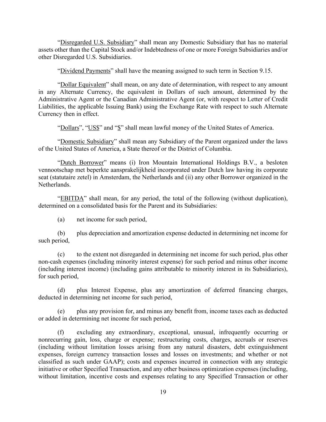 19 “Disregarded U.S. Subsidiary” shall mean any Domestic Subsidiary that has no material assets other than the Capital Stock and/or Indebtedness of one or more Foreign Subsidiaries and/or other Disregarded U.S. Subsidiaries. “Dividend Payments” shall have the meaning assigned to such term in Section 9.15. “Dollar Equivalent” shall mean, on any date of determination, with respect to any amount in any Alternate Currency, the equivalent in Dollars of such amount, determined by the Administrative Agent or the Canadian Administrative Agent (or, with respect to Letter of Credit Liabilities, the applicable Issuing Bank) using the Exchange Rate with respect to such Alternate Currency then in effect. “Dollars”, “US$” and “$” shall mean lawful money of the United States of America. “Domestic Subsidiary” shall mean any Subsidiary of the Parent organized under the laws of the United States of America, a State thereof or the District of Columbia. “Dutch Borrower” means (i) Iron Mountain International Holdings B.V., a besloten vennootschap met beperkte aansprakelijkheid incorporated under Dutch law having its corporate seat (statutaire zetel) in Amsterdam, the Netherlands and (ii) any other Borrower organized in the Netherlands. “EBITDA” shall mean, for any period, the total of the following (without duplication), determined on a consolidated basis for the Parent and its Subsidiaries: (a) net income for such period, (b) plus depreciation and amortization expense deducted in determining net income for such period, (c) to the extent not disregarded in determining net income for such period, plus other non-cash expenses (including minority interest expense) for such period and minus other income (including interest income) (including gains attributable to minority interest in its Subsidiaries), for such period, (d) plus Interest Expense, plus any amortization of deferred financing charges, deducted in determining net income for such period, (e) plus any provision for, and minus any benefit from, income taxes each as deducted or added in determining net income for such period, (f) excluding any extraordinary, exceptional, unusual, infrequently occurring or nonrecurring gain, loss, charge or expense; restructuring costs, charges, accruals or reserves (including without limitation losses arising from any natural disasters, debt extinguishment expenses, foreign currency transaction losses and losses on investments; and whether or not classified as such under GAAP); costs and expenses incurred in connection with any strategic initiative or other Specified Transaction, and any other business optimization expenses (including, without limitation, incentive costs and expenses relating to any Specified Transaction or other