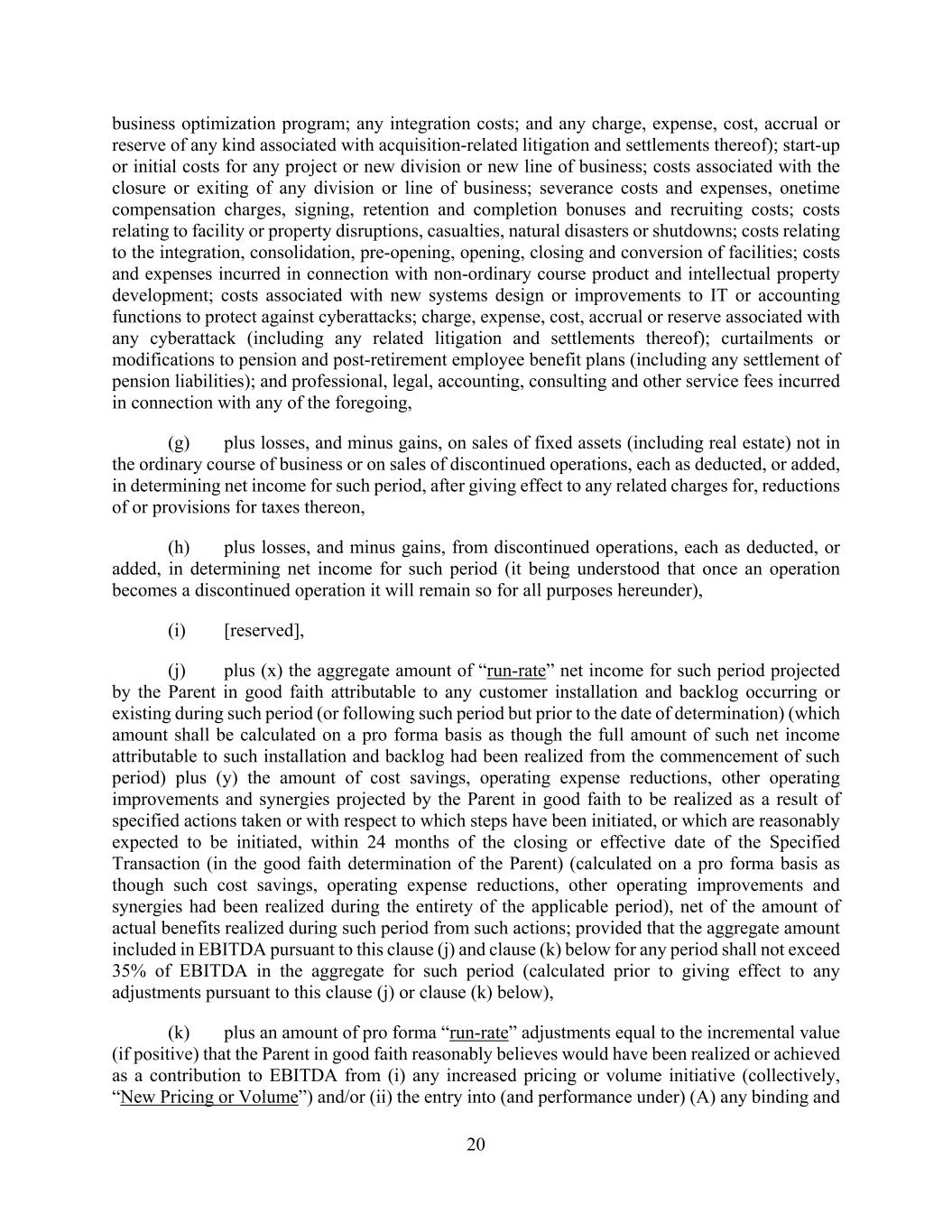 20 business optimization program; any integration costs; and any charge, expense, cost, accrual or reserve of any kind associated with acquisition-related litigation and settlements thereof); start-up or initial costs for any project or new division or new line of business; costs associated with the closure or exiting of any division or line of business; severance costs and expenses, onetime compensation charges, signing, retention and completion bonuses and recruiting costs; costs relating to facility or property disruptions, casualties, natural disasters or shutdowns; costs relating to the integration, consolidation, pre-opening, opening, closing and conversion of facilities; costs and expenses incurred in connection with non-ordinary course product and intellectual property development; costs associated with new systems design or improvements to IT or accounting functions to protect against cyberattacks; charge, expense, cost, accrual or reserve associated with any cyberattack (including any related litigation and settlements thereof); curtailments or modifications to pension and post-retirement employee benefit plans (including any settlement of pension liabilities); and professional, legal, accounting, consulting and other service fees incurred in connection with any of the foregoing, (g) plus losses, and minus gains, on sales of fixed assets (including real estate) not in the ordinary course of business or on sales of discontinued operations, each as deducted, or added, in determining net income for such period, after giving effect to any related charges for, reductions of or provisions for taxes thereon, (h) plus losses, and minus gains, from discontinued operations, each as deducted, or added, in determining net income for such period (it being understood that once an operation becomes a discontinued operation it will remain so for all purposes hereunder), (i) [reserved], (j) plus (x) the aggregate amount of “run-rate” net income for such period projected by the Parent in good faith attributable to any customer installation and backlog occurring or existing during such period (or following such period but prior to the date of determination) (which amount shall be calculated on a pro forma basis as though the full amount of such net income attributable to such installation and backlog had been realized from the commencement of such period) plus (y) the amount of cost savings, operating expense reductions, other operating improvements and synergies projected by the Parent in good faith to be realized as a result of specified actions taken or with respect to which steps have been initiated, or which are reasonably expected to be initiated, within 24 months of the closing or effective date of the Specified Transaction (in the good faith determination of the Parent) (calculated on a pro forma basis as though such cost savings, operating expense reductions, other operating improvements and synergies had been realized during the entirety of the applicable period), net of the amount of actual benefits realized during such period from such actions; provided that the aggregate amount included in EBITDA pursuant to this clause (j) and clause (k) below for any period shall not exceed 35% of EBITDA in the aggregate for such period (calculated prior to giving effect to any adjustments pursuant to this clause (j) or clause (k) below), (k) plus an amount of pro forma “run-rate” adjustments equal to the incremental value (if positive) that the Parent in good faith reasonably believes would have been realized or achieved as a contribution to EBITDA from (i) any increased pricing or volume initiative (collectively, “New Pricing or Volume”) and/or (ii) the entry into (and performance under) (A) any binding and
