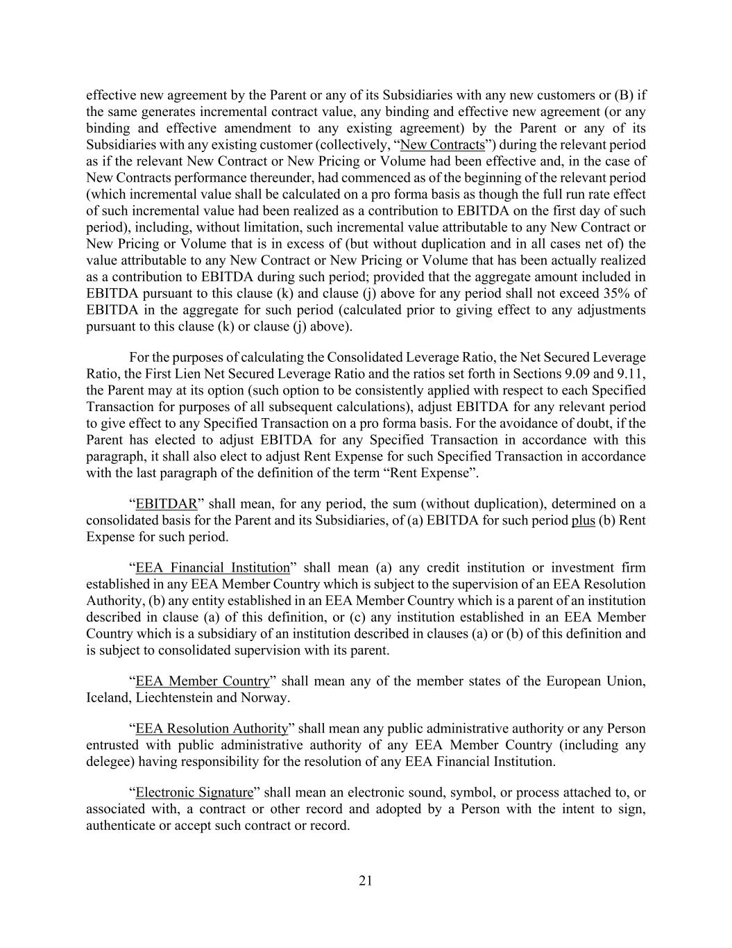 21 effective new agreement by the Parent or any of its Subsidiaries with any new customers or (B) if the same generates incremental contract value, any binding and effective new agreement (or any binding and effective amendment to any existing agreement) by the Parent or any of its Subsidiaries with any existing customer (collectively, “New Contracts”) during the relevant period as if the relevant New Contract or New Pricing or Volume had been effective and, in the case of New Contracts performance thereunder, had commenced as of the beginning of the relevant period (which incremental value shall be calculated on a pro forma basis as though the full run rate effect of such incremental value had been realized as a contribution to EBITDA on the first day of such period), including, without limitation, such incremental value attributable to any New Contract or New Pricing or Volume that is in excess of (but without duplication and in all cases net of) the value attributable to any New Contract or New Pricing or Volume that has been actually realized as a contribution to EBITDA during such period; provided that the aggregate amount included in EBITDA pursuant to this clause (k) and clause (j) above for any period shall not exceed 35% of EBITDA in the aggregate for such period (calculated prior to giving effect to any adjustments pursuant to this clause (k) or clause (j) above). For the purposes of calculating the Consolidated Leverage Ratio, the Net Secured Leverage Ratio, the First Lien Net Secured Leverage Ratio and the ratios set forth in Sections 9.09 and 9.11, the Parent may at its option (such option to be consistently applied with respect to each Specified Transaction for purposes of all subsequent calculations), adjust EBITDA for any relevant period to give effect to any Specified Transaction on a pro forma basis. For the avoidance of doubt, if the Parent has elected to adjust EBITDA for any Specified Transaction in accordance with this paragraph, it shall also elect to adjust Rent Expense for such Specified Transaction in accordance with the last paragraph of the definition of the term “Rent Expense”. “EBITDAR” shall mean, for any period, the sum (without duplication), determined on a consolidated basis for the Parent and its Subsidiaries, of (a) EBITDA for such period plus (b) Rent Expense for such period. “EEA Financial Institution” shall mean (a) any credit institution or investment firm established in any EEA Member Country which is subject to the supervision of an EEA Resolution Authority, (b) any entity established in an EEA Member Country which is a parent of an institution described in clause (a) of this definition, or (c) any institution established in an EEA Member Country which is a subsidiary of an institution described in clauses (a) or (b) of this definition and is subject to consolidated supervision with its parent. “EEA Member Country” shall mean any of the member states of the European Union, Iceland, Liechtenstein and Norway. “EEA Resolution Authority” shall mean any public administrative authority or any Person entrusted with public administrative authority of any EEA Member Country (including any delegee) having responsibility for the resolution of any EEA Financial Institution. “Electronic Signature” shall mean an electronic sound, symbol, or process attached to, or associated with, a contract or other record and adopted by a Person with the intent to sign, authenticate or accept such contract or record.