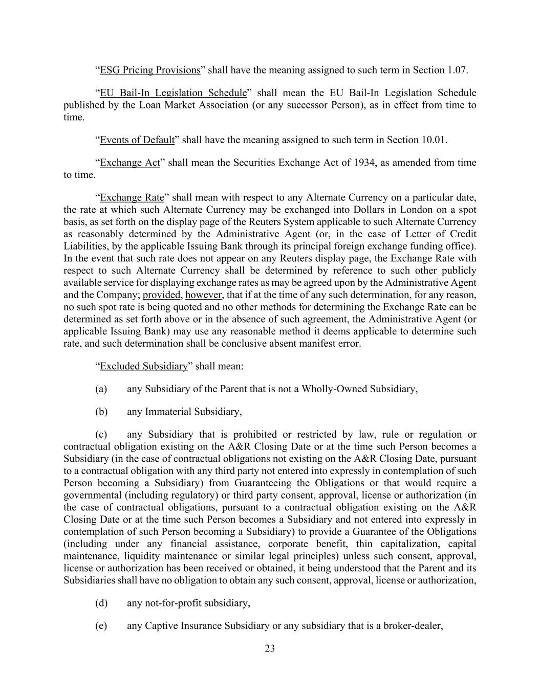 23 “ESG Pricing Provisions” shall have the meaning assigned to such term in Section 1.07. “EU Bail-In Legislation Schedule” shall mean the EU Bail-In Legislation Schedule published by the Loan Market Association (or any successor Person), as in effect from time to time. “Events of Default” shall have the meaning assigned to such term in Section 10.01. “Exchange Act” shall mean the Securities Exchange Act of 1934, as amended from time to time. “Exchange Rate” shall mean with respect to any Alternate Currency on a particular date, the rate at which such Alternate Currency may be exchanged into Dollars in London on a spot basis, as set forth on the display page of the Reuters System applicable to such Alternate Currency as reasonably determined by the Administrative Agent (or, in the case of Letter of Credit Liabilities, by the applicable Issuing Bank through its principal foreign exchange funding office). In the event that such rate does not appear on any Reuters display page, the Exchange Rate with respect to such Alternate Currency shall be determined by reference to such other publicly available service for displaying exchange rates as may be agreed upon by the Administrative Agent and the Company; provided, however, that if at the time of any such determination, for any reason, no such spot rate is being quoted and no other methods for determining the Exchange Rate can be determined as set forth above or in the absence of such agreement, the Administrative Agent (or applicable Issuing Bank) may use any reasonable method it deems applicable to determine such rate, and such determination shall be conclusive absent manifest error. “Excluded Subsidiary” shall mean: (a) any Subsidiary of the Parent that is not a Wholly-Owned Subsidiary, (b) any Immaterial Subsidiary, (c) any Subsidiary that is prohibited or restricted by law, rule or regulation or contractual obligation existing on the A&R Closing Date or at the time such Person becomes a Subsidiary (in the case of contractual obligations not existing on the A&R Closing Date, pursuant to a contractual obligation with any third party not entered into expressly in contemplation of such Person becoming a Subsidiary) from Guaranteeing the Obligations or that would require a governmental (including regulatory) or third party consent, approval, license or authorization (in the case of contractual obligations, pursuant to a contractual obligation existing on the A&R Closing Date or at the time such Person becomes a Subsidiary and not entered into expressly in contemplation of such Person becoming a Subsidiary) to provide a Guarantee of the Obligations (including under any financial assistance, corporate benefit, thin capitalization, capital maintenance, liquidity maintenance or similar legal principles) unless such consent, approval, license or authorization has been received or obtained, it being understood that the Parent and its Subsidiaries shall have no obligation to obtain any such consent, approval, license or authorization, (d) any not-for-profit subsidiary, (e) any Captive Insurance Subsidiary or any subsidiary that is a broker-dealer,