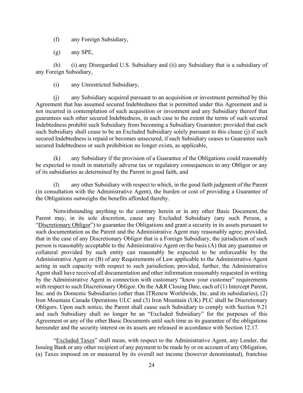24 (f) any Foreign Subsidiary, (g) any SPE, (h) (i) any Disregarded U.S. Subsidiary and (ii) any Subsidiary that is a subsidiary of any Foreign Subsidiary, (i) any Unrestricted Subsidiary, (j) any Subsidiary acquired pursuant to an acquisition or investment permitted by this Agreement that has assumed secured Indebtedness that is permitted under this Agreement and is not incurred in contemplation of such acquisition or investment and any Subsidiary thereof that guarantees such other secured Indebtedness, in each case to the extent the terms of such secured Indebtedness prohibit such Subsidiary from becoming a Subsidiary Guarantor; provided that each such Subsidiary shall cease to be an Excluded Subsidiary solely pursuant to this clause (j) if such secured Indebtedness is repaid or becomes unsecured, if such Subsidiary ceases to Guarantee such secured Indebtedness or such prohibition no longer exists, as applicable, (k) any Subsidiary if the provision of a Guarantee of the Obligations could reasonably be expected to result in materially adverse tax or regulatory consequences to any Obligor or any of its subsidiaries as determined by the Parent in good faith, and (l) any other Subsidiary with respect to which, in the good faith judgment of the Parent (in consultation with the Administrative Agent), the burden or cost of providing a Guarantee of the Obligations outweighs the benefits afforded thereby. Notwithstanding anything to the contrary herein or in any other Basic Document, the Parent may, in its sole discretion, cause any Excluded Subsidiary (any such Person, a “Discretionary Obligor”) to guarantee the Obligations and grant a security in its assets pursuant to such documentation as the Parent and the Administrative Agent may reasonably agree; provided, that in the case of any Discretionary Obligor that is a Foreign Subsidiary, the jurisdiction of such person is reasonably acceptable to the Administrative Agent on the basis (A) that any guarantee or collateral provided by such entity can reasonably be expected to be enforceable by the Administrative Agent or (B) of any Requirements of Law applicable to the Administrative Agent acting in such capacity with respect to such jurisdiction; provided, further, the Administrative Agent shall have received all documentation and other information reasonably requested in writing by the Administrative Agent in connection with customary “know your customer” requirements with respect to such Discretionary Obligor. On the A&R Closing Date, each of (1) Intercept Parent, Inc. and its Domestic Subsidiaries (other than ITRenew Worldwide, Inc. and its subsidiaries), (2) Iron Mountain Canada Operations ULC and (3) Iron Mountain (UK) PLC shall be Discretionary Obligors. Upon such notice, the Parent shall cause such Subsidiary to comply with Section 9.21 and such Subsidiary shall no longer be an “Excluded Subsidiary” for the purposes of this Agreement or any of the other Basic Documents until such time as its guarantee of the obligations hereunder and the security interest on its assets are released in accordance with Section 12.17. “Excluded Taxes” shall mean, with respect to the Administrative Agent, any Lender, the Issuing Bank or any other recipient of any payment to be made by or on account of any Obligation, (a) Taxes imposed on or measured by its overall net income (however denominated), franchise