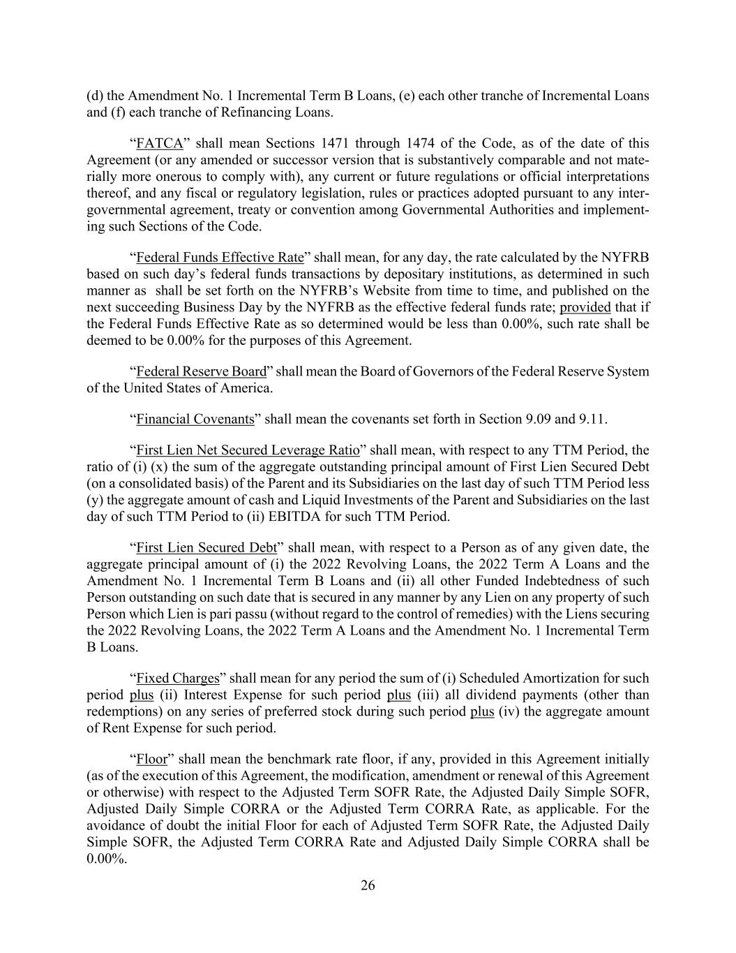26 (d) the Amendment No. 1 Incremental Term B Loans, (e) each other tranche of Incremental Loans and (f) each tranche of Refinancing Loans. “FATCA” shall mean Sections 1471 through 1474 of the Code, as of the date of this Agreement (or any amended or successor version that is substantively comparable and not mate- rially more onerous to comply with), any current or future regulations or official interpretations thereof, and any fiscal or regulatory legislation, rules or practices adopted pursuant to any inter- governmental agreement, treaty or convention among Governmental Authorities and implement- ing such Sections of the Code. “Federal Funds Effective Rate” shall mean, for any day, the rate calculated by the NYFRB based on such day’s federal funds transactions by depositary institutions, as determined in such manner as shall be set forth on the NYFRB’s Website from time to time, and published on the next succeeding Business Day by the NYFRB as the effective federal funds rate; provided that if the Federal Funds Effective Rate as so determined would be less than 0.00%, such rate shall be deemed to be 0.00% for the purposes of this Agreement. “Federal Reserve Board” shall mean the Board of Governors of the Federal Reserve System of the United States of America. “Financial Covenants” shall mean the covenants set forth in Section 9.09 and 9.11. “First Lien Net Secured Leverage Ratio” shall mean, with respect to any TTM Period, the ratio of (i) (x) the sum of the aggregate outstanding principal amount of First Lien Secured Debt (on a consolidated basis) of the Parent and its Subsidiaries on the last day of such TTM Period less (y) the aggregate amount of cash and Liquid Investments of the Parent and Subsidiaries on the last day of such TTM Period to (ii) EBITDA for such TTM Period. “First Lien Secured Debt” shall mean, with respect to a Person as of any given date, the aggregate principal amount of (i) the 2022 Revolving Loans, the 2022 Term A Loans and the Amendment No. 1 Incremental Term B Loans and (ii) all other Funded Indebtedness of such Person outstanding on such date that is secured in any manner by any Lien on any property of such Person which Lien is pari passu (without regard to the control of remedies) with the Liens securing the 2022 Revolving Loans, the 2022 Term A Loans and the Amendment No. 1 Incremental Term B Loans. “Fixed Charges” shall mean for any period the sum of (i) Scheduled Amortization for such period plus (ii) Interest Expense for such period plus (iii) all dividend payments (other than redemptions) on any series of preferred stock during such period plus (iv) the aggregate amount of Rent Expense for such period. “Floor” shall mean the benchmark rate floor, if any, provided in this Agreement initially (as of the execution of this Agreement, the modification, amendment or renewal of this Agreement or otherwise) with respect to the Adjusted Term SOFR Rate, the Adjusted Daily Simple SOFR, Adjusted Daily Simple CORRA or the Adjusted Term CORRA Rate, as applicable. For the avoidance of doubt the initial Floor for each of Adjusted Term SOFR Rate, the Adjusted Daily Simple SOFR, the Adjusted Term CORRA Rate and Adjusted Daily Simple CORRA shall be 0.00%.