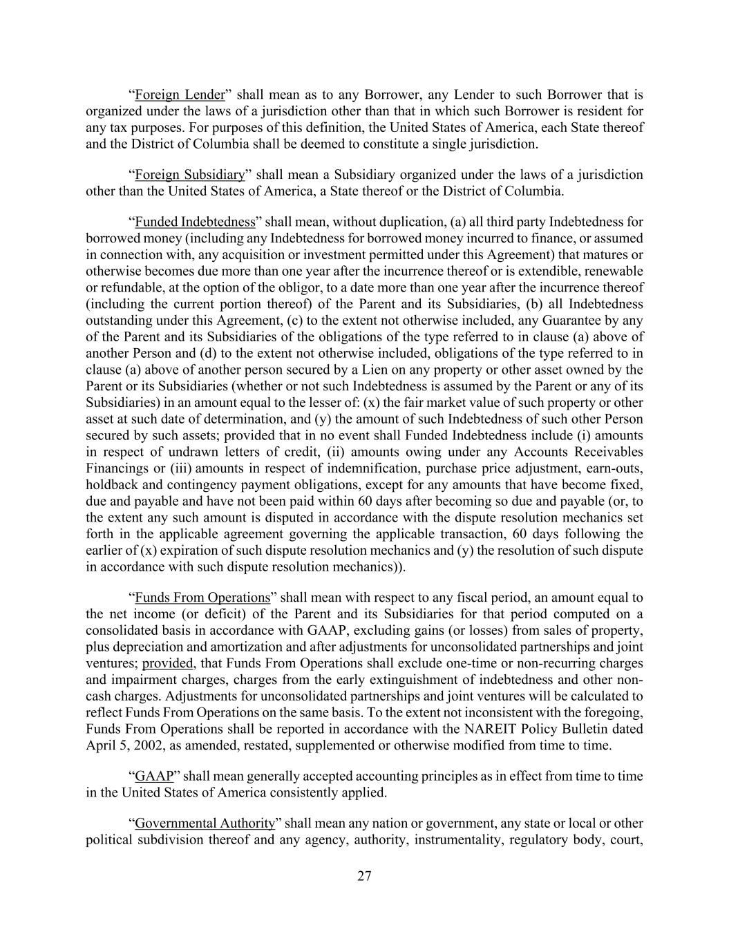27 “Foreign Lender” shall mean as to any Borrower, any Lender to such Borrower that is organized under the laws of a jurisdiction other than that in which such Borrower is resident for any tax purposes. For purposes of this definition, the United States of America, each State thereof and the District of Columbia shall be deemed to constitute a single jurisdiction. “Foreign Subsidiary” shall mean a Subsidiary organized under the laws of a jurisdiction other than the United States of America, a State thereof or the District of Columbia. “Funded Indebtedness” shall mean, without duplication, (a) all third party Indebtedness for borrowed money (including any Indebtedness for borrowed money incurred to finance, or assumed in connection with, any acquisition or investment permitted under this Agreement) that matures or otherwise becomes due more than one year after the incurrence thereof or is extendible, renewable or refundable, at the option of the obligor, to a date more than one year after the incurrence thereof (including the current portion thereof) of the Parent and its Subsidiaries, (b) all Indebtedness outstanding under this Agreement, (c) to the extent not otherwise included, any Guarantee by any of the Parent and its Subsidiaries of the obligations of the type referred to in clause (a) above of another Person and (d) to the extent not otherwise included, obligations of the type referred to in clause (a) above of another person secured by a Lien on any property or other asset owned by the Parent or its Subsidiaries (whether or not such Indebtedness is assumed by the Parent or any of its Subsidiaries) in an amount equal to the lesser of: (x) the fair market value of such property or other asset at such date of determination, and (y) the amount of such Indebtedness of such other Person secured by such assets; provided that in no event shall Funded Indebtedness include (i) amounts in respect of undrawn letters of credit, (ii) amounts owing under any Accounts Receivables Financings or (iii) amounts in respect of indemnification, purchase price adjustment, earn-outs, holdback and contingency payment obligations, except for any amounts that have become fixed, due and payable and have not been paid within 60 days after becoming so due and payable (or, to the extent any such amount is disputed in accordance with the dispute resolution mechanics set forth in the applicable agreement governing the applicable transaction, 60 days following the earlier of (x) expiration of such dispute resolution mechanics and (y) the resolution of such dispute in accordance with such dispute resolution mechanics)). “Funds From Operations” shall mean with respect to any fiscal period, an amount equal to the net income (or deficit) of the Parent and its Subsidiaries for that period computed on a consolidated basis in accordance with GAAP, excluding gains (or losses) from sales of property, plus depreciation and amortization and after adjustments for unconsolidated partnerships and joint ventures; provided, that Funds From Operations shall exclude one-time or non-recurring charges and impairment charges, charges from the early extinguishment of indebtedness and other non- cash charges. Adjustments for unconsolidated partnerships and joint ventures will be calculated to reflect Funds From Operations on the same basis. To the extent not inconsistent with the foregoing, Funds From Operations shall be reported in accordance with the NAREIT Policy Bulletin dated April 5, 2002, as amended, restated, supplemented or otherwise modified from time to time. “GAAP” shall mean generally accepted accounting principles as in effect from time to time in the United States of America consistently applied. “Governmental Authority” shall mean any nation or government, any state or local or other political subdivision thereof and any agency, authority, instrumentality, regulatory body, court,
