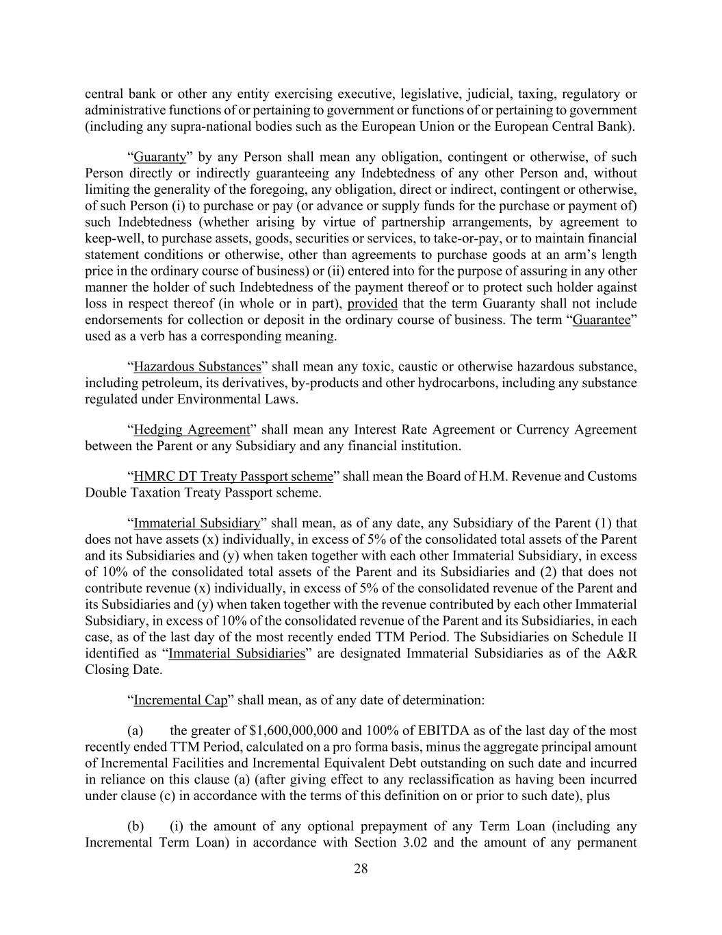 28 central bank or other any entity exercising executive, legislative, judicial, taxing, regulatory or administrative functions of or pertaining to government or functions of or pertaining to government (including any supra-national bodies such as the European Union or the European Central Bank). “Guaranty” by any Person shall mean any obligation, contingent or otherwise, of such Person directly or indirectly guaranteeing any Indebtedness of any other Person and, without limiting the generality of the foregoing, any obligation, direct or indirect, contingent or otherwise, of such Person (i) to purchase or pay (or advance or supply funds for the purchase or payment of) such Indebtedness (whether arising by virtue of partnership arrangements, by agreement to keep-well, to purchase assets, goods, securities or services, to take-or-pay, or to maintain financial statement conditions or otherwise, other than agreements to purchase goods at an arm’s length price in the ordinary course of business) or (ii) entered into for the purpose of assuring in any other manner the holder of such Indebtedness of the payment thereof or to protect such holder against loss in respect thereof (in whole or in part), provided that the term Guaranty shall not include endorsements for collection or deposit in the ordinary course of business. The term “Guarantee” used as a verb has a corresponding meaning. “Hazardous Substances” shall mean any toxic, caustic or otherwise hazardous substance, including petroleum, its derivatives, by-products and other hydrocarbons, including any substance regulated under Environmental Laws. “Hedging Agreement” shall mean any Interest Rate Agreement or Currency Agreement between the Parent or any Subsidiary and any financial institution. “HMRC DT Treaty Passport scheme” shall mean the Board of H.M. Revenue and Customs Double Taxation Treaty Passport scheme. “Immaterial Subsidiary” shall mean, as of any date, any Subsidiary of the Parent (1) that does not have assets (x) individually, in excess of 5% of the consolidated total assets of the Parent and its Subsidiaries and (y) when taken together with each other Immaterial Subsidiary, in excess of 10% of the consolidated total assets of the Parent and its Subsidiaries and (2) that does not contribute revenue (x) individually, in excess of 5% of the consolidated revenue of the Parent and its Subsidiaries and (y) when taken together with the revenue contributed by each other Immaterial Subsidiary, in excess of 10% of the consolidated revenue of the Parent and its Subsidiaries, in each case, as of the last day of the most recently ended TTM Period. The Subsidiaries on Schedule II identified as “Immaterial Subsidiaries” are designated Immaterial Subsidiaries as of the A&R Closing Date. “Incremental Cap” shall mean, as of any date of determination: (a) the greater of $1,600,000,000 and 100% of EBITDA as of the last day of the most recently ended TTM Period, calculated on a pro forma basis, minus the aggregate principal amount of Incremental Facilities and Incremental Equivalent Debt outstanding on such date and incurred in reliance on this clause (a) (after giving effect to any reclassification as having been incurred under clause (c) in accordance with the terms of this definition on or prior to such date), plus (b) (i) the amount of any optional prepayment of any Term Loan (including any Incremental Term Loan) in accordance with Section 3.02 and the amount of any permanent