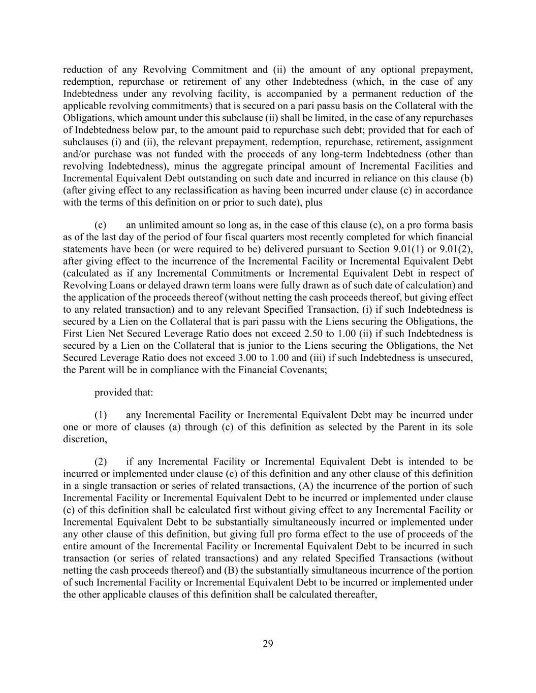 29 reduction of any Revolving Commitment and (ii) the amount of any optional prepayment, redemption, repurchase or retirement of any other Indebtedness (which, in the case of any Indebtedness under any revolving facility, is accompanied by a permanent reduction of the applicable revolving commitments) that is secured on a pari passu basis on the Collateral with the Obligations, which amount under this subclause (ii) shall be limited, in the case of any repurchases of Indebtedness below par, to the amount paid to repurchase such debt; provided that for each of subclauses (i) and (ii), the relevant prepayment, redemption, repurchase, retirement, assignment and/or purchase was not funded with the proceeds of any long-term Indebtedness (other than revolving Indebtedness), minus the aggregate principal amount of Incremental Facilities and Incremental Equivalent Debt outstanding on such date and incurred in reliance on this clause (b) (after giving effect to any reclassification as having been incurred under clause (c) in accordance with the terms of this definition on or prior to such date), plus (c) an unlimited amount so long as, in the case of this clause (c), on a pro forma basis as of the last day of the period of four fiscal quarters most recently completed for which financial statements have been (or were required to be) delivered pursuant to Section 9.01(1) or 9.01(2), after giving effect to the incurrence of the Incremental Facility or Incremental Equivalent Debt (calculated as if any Incremental Commitments or Incremental Equivalent Debt in respect of Revolving Loans or delayed drawn term loans were fully drawn as of such date of calculation) and the application of the proceeds thereof (without netting the cash proceeds thereof, but giving effect to any related transaction) and to any relevant Specified Transaction, (i) if such Indebtedness is secured by a Lien on the Collateral that is pari passu with the Liens securing the Obligations, the First Lien Net Secured Leverage Ratio does not exceed 2.50 to 1.00 (ii) if such Indebtedness is secured by a Lien on the Collateral that is junior to the Liens securing the Obligations, the Net Secured Leverage Ratio does not exceed 3.00 to 1.00 and (iii) if such Indebtedness is unsecured, the Parent will be in compliance with the Financial Covenants; provided that: (1) any Incremental Facility or Incremental Equivalent Debt may be incurred under one or more of clauses (a) through (c) of this definition as selected by the Parent in its sole discretion, (2) if any Incremental Facility or Incremental Equivalent Debt is intended to be incurred or implemented under clause (c) of this definition and any other clause of this definition in a single transaction or series of related transactions, (A) the incurrence of the portion of such Incremental Facility or Incremental Equivalent Debt to be incurred or implemented under clause (c) of this definition shall be calculated first without giving effect to any Incremental Facility or Incremental Equivalent Debt to be substantially simultaneously incurred or implemented under any other clause of this definition, but giving full pro forma effect to the use of proceeds of the entire amount of the Incremental Facility or Incremental Equivalent Debt to be incurred in such transaction (or series of related transactions) and any related Specified Transactions (without netting the cash proceeds thereof) and (B) the substantially simultaneous incurrence of the portion of such Incremental Facility or Incremental Equivalent Debt to be incurred or implemented under the other applicable clauses of this definition shall be calculated thereafter,