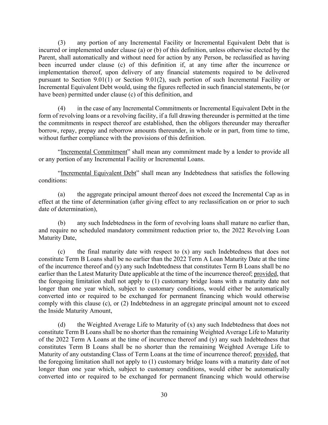 30 (3) any portion of any Incremental Facility or Incremental Equivalent Debt that is incurred or implemented under clause (a) or (b) of this definition, unless otherwise elected by the Parent, shall automatically and without need for action by any Person, be reclassified as having been incurred under clause (c) of this definition if, at any time after the incurrence or implementation thereof, upon delivery of any financial statements required to be delivered pursuant to Section 9.01(1) or Section 9.01(2), such portion of such Incremental Facility or Incremental Equivalent Debt would, using the figures reflected in such financial statements, be (or have been) permitted under clause (c) of this definition, and (4) in the case of any Incremental Commitments or Incremental Equivalent Debt in the form of revolving loans or a revolving facility, if a full drawing thereunder is permitted at the time the commitments in respect thereof are established, then the obligors thereunder may thereafter borrow, repay, prepay and reborrow amounts thereunder, in whole or in part, from time to time, without further compliance with the provisions of this definition. “Incremental Commitment” shall mean any commitment made by a lender to provide all or any portion of any Incremental Facility or Incremental Loans. “Incremental Equivalent Debt” shall mean any Indebtedness that satisfies the following conditions: (a) the aggregate principal amount thereof does not exceed the Incremental Cap as in effect at the time of determination (after giving effect to any reclassification on or prior to such date of determination), (b) any such Indebtedness in the form of revolving loans shall mature no earlier than, and require no scheduled mandatory commitment reduction prior to, the 2022 Revolving Loan Maturity Date, (c) the final maturity date with respect to (x) any such Indebtedness that does not constitute Term B Loans shall be no earlier than the 2022 Term A Loan Maturity Date at the time of the incurrence thereof and (y) any such Indebtedness that constitutes Term B Loans shall be no earlier than the Latest Maturity Date applicable at the time of the incurrence thereof; provided, that the foregoing limitation shall not apply to (1) customary bridge loans with a maturity date not longer than one year which, subject to customary conditions, would either be automatically converted into or required to be exchanged for permanent financing which would otherwise comply with this clause (c), or (2) Indebtedness in an aggregate principal amount not to exceed the Inside Maturity Amount, (d) the Weighted Average Life to Maturity of (x) any such Indebtedness that does not constitute Term B Loans shall be no shorter than the remaining Weighted Average Life to Maturity of the 2022 Term A Loans at the time of incurrence thereof and (y) any such Indebtedness that constitutes Term B Loans shall be no shorter than the remaining Weighted Average Life to Maturity of any outstanding Class of Term Loans at the time of incurrence thereof; provided, that the foregoing limitation shall not apply to (1) customary bridge loans with a maturity date of not longer than one year which, subject to customary conditions, would either be automatically converted into or required to be exchanged for permanent financing which would otherwise