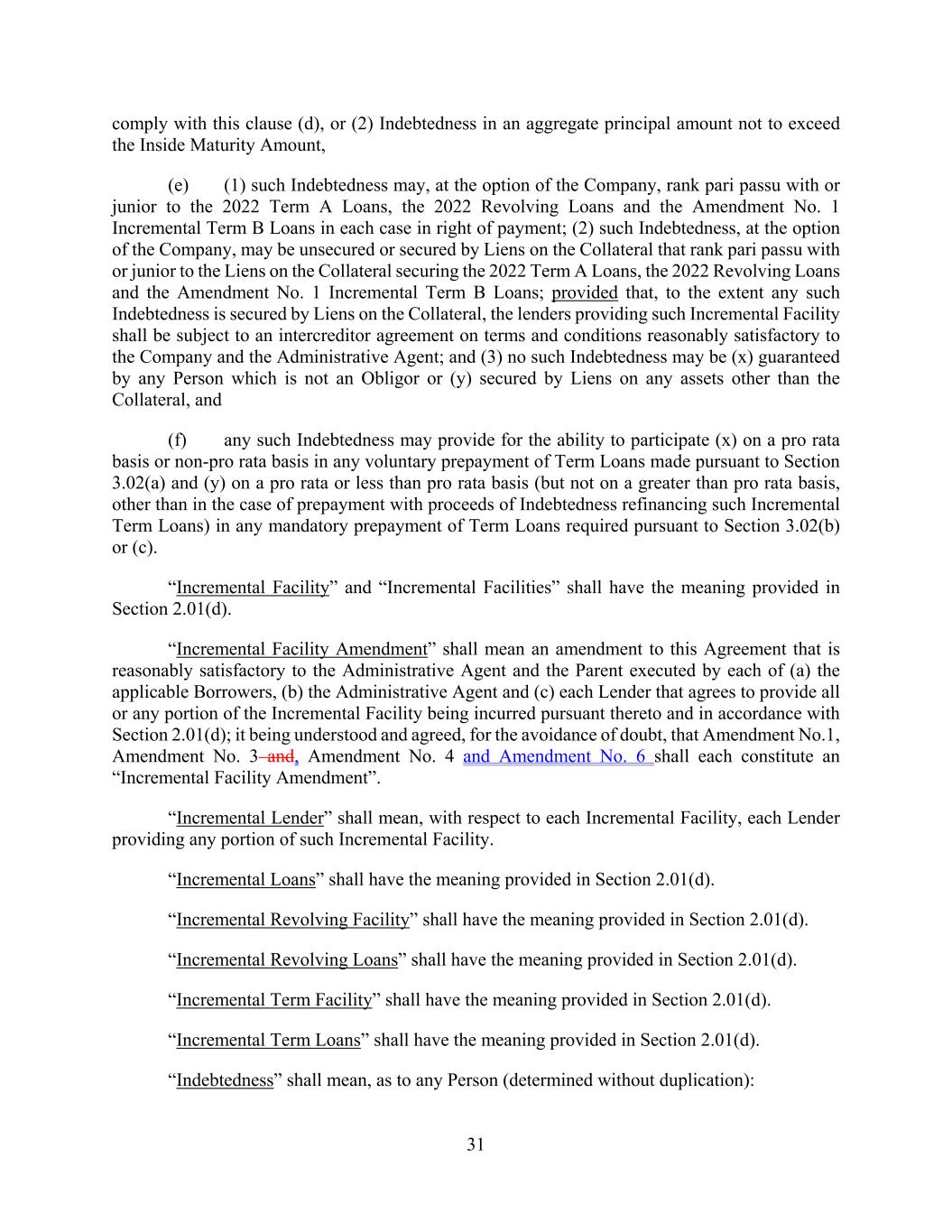 31 comply with this clause (d), or (2) Indebtedness in an aggregate principal amount not to exceed the Inside Maturity Amount, (e) (1) such Indebtedness may, at the option of the Company, rank pari passu with or junior to the 2022 Term A Loans, the 2022 Revolving Loans and the Amendment No. 1 Incremental Term B Loans in each case in right of payment; (2) such Indebtedness, at the option of the Company, may be unsecured or secured by Liens on the Collateral that rank pari passu with or junior to the Liens on the Collateral securing the 2022 Term A Loans, the 2022 Revolving Loans and the Amendment No. 1 Incremental Term B Loans; provided that, to the extent any such Indebtedness is secured by Liens on the Collateral, the lenders providing such Incremental Facility shall be subject to an intercreditor agreement on terms and conditions reasonably satisfactory to the Company and the Administrative Agent; and (3) no such Indebtedness may be (x) guaranteed by any Person which is not an Obligor or (y) secured by Liens on any assets other than the Collateral, and (f) any such Indebtedness may provide for the ability to participate (x) on a pro rata basis or non-pro rata basis in any voluntary prepayment of Term Loans made pursuant to Section 3.02(a) and (y) on a pro rata or less than pro rata basis (but not on a greater than pro rata basis, other than in the case of prepayment with proceeds of Indebtedness refinancing such Incremental Term Loans) in any mandatory prepayment of Term Loans required pursuant to Section 3.02(b) or (c). “Incremental Facility” and “Incremental Facilities” shall have the meaning provided in Section 2.01(d). “Incremental Facility Amendment” shall mean an amendment to this Agreement that is reasonably satisfactory to the Administrative Agent and the Parent executed by each of (a) the applicable Borrowers, (b) the Administrative Agent and (c) each Lender that agrees to provide all or any portion of the Incremental Facility being incurred pursuant thereto and in accordance with Section 2.01(d); it being understood and agreed, for the avoidance of doubt, that Amendment No.1, Amendment No. 3 and, Amendment No. 4 and Amendment No. 6 shall each constitute an “Incremental Facility Amendment”. “Incremental Lender” shall mean, with respect to each Incremental Facility, each Lender providing any portion of such Incremental Facility. “Incremental Loans” shall have the meaning provided in Section 2.01(d). “Incremental Revolving Facility” shall have the meaning provided in Section 2.01(d). “Incremental Revolving Loans” shall have the meaning provided in Section 2.01(d). “Incremental Term Facility” shall have the meaning provided in Section 2.01(d). “Incremental Term Loans” shall have the meaning provided in Section 2.01(d). “Indebtedness” shall mean, as to any Person (determined without duplication):