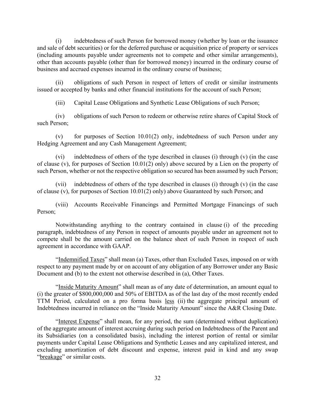 32 (i) indebtedness of such Person for borrowed money (whether by loan or the issuance and sale of debt securities) or for the deferred purchase or acquisition price of property or services (including amounts payable under agreements not to compete and other similar arrangements), other than accounts payable (other than for borrowed money) incurred in the ordinary course of business and accrued expenses incurred in the ordinary course of business; (ii) obligations of such Person in respect of letters of credit or similar instruments issued or accepted by banks and other financial institutions for the account of such Person; (iii) Capital Lease Obligations and Synthetic Lease Obligations of such Person; (iv) obligations of such Person to redeem or otherwise retire shares of Capital Stock of such Person; (v) for purposes of Section 10.01(2) only, indebtedness of such Person under any Hedging Agreement and any Cash Management Agreement; (vi) indebtedness of others of the type described in clauses (i) through (v) (in the case of clause (v), for purposes of Section 10.01(2) only) above secured by a Lien on the property of such Person, whether or not the respective obligation so secured has been assumed by such Person; (vii) indebtedness of others of the type described in clauses (i) through (v) (in the case of clause (v), for purposes of Section 10.01(2) only) above Guaranteed by such Person; and (viii) Accounts Receivable Financings and Permitted Mortgage Financings of such Person; Notwithstanding anything to the contrary contained in clause (i) of the preceding paragraph, indebtedness of any Person in respect of amounts payable under an agreement not to compete shall be the amount carried on the balance sheet of such Person in respect of such agreement in accordance with GAAP. “Indemnified Taxes” shall mean (a) Taxes, other than Excluded Taxes, imposed on or with respect to any payment made by or on account of any obligation of any Borrower under any Basic Document and (b) to the extent not otherwise described in (a), Other Taxes. “Inside Maturity Amount” shall mean as of any date of determination, an amount equal to (i) the greater of $800,000,000 and 50% of EBITDA as of the last day of the most recently ended TTM Period, calculated on a pro forma basis less (ii) the aggregate principal amount of Indebtedness incurred in reliance on the “Inside Maturity Amount” since the A&R Closing Date. “Interest Expense” shall mean, for any period, the sum (determined without duplication) of the aggregate amount of interest accruing during such period on Indebtedness of the Parent and its Subsidiaries (on a consolidated basis), including the interest portion of rental or similar payments under Capital Lease Obligations and Synthetic Leases and any capitalized interest, and excluding amortization of debt discount and expense, interest paid in kind and any swap “breakage” or similar costs.
