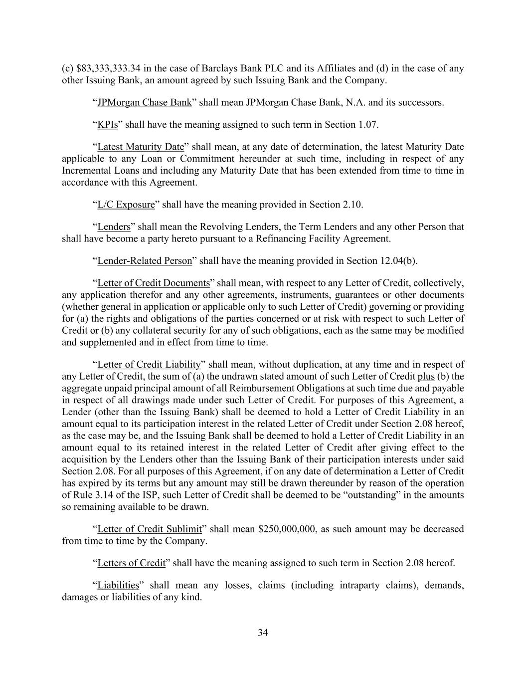 34 (c) $83,333,333.34 in the case of Barclays Bank PLC and its Affiliates and (d) in the case of any other Issuing Bank, an amount agreed by such Issuing Bank and the Company. “JPMorgan Chase Bank” shall mean JPMorgan Chase Bank, N.A. and its successors. “KPIs” shall have the meaning assigned to such term in Section 1.07. “Latest Maturity Date” shall mean, at any date of determination, the latest Maturity Date applicable to any Loan or Commitment hereunder at such time, including in respect of any Incremental Loans and including any Maturity Date that has been extended from time to time in accordance with this Agreement. “L/C Exposure” shall have the meaning provided in Section 2.10. “Lenders” shall mean the Revolving Lenders, the Term Lenders and any other Person that shall have become a party hereto pursuant to a Refinancing Facility Agreement. “Lender-Related Person” shall have the meaning provided in Section 12.04(b). “Letter of Credit Documents” shall mean, with respect to any Letter of Credit, collectively, any application therefor and any other agreements, instruments, guarantees or other documents (whether general in application or applicable only to such Letter of Credit) governing or providing for (a) the rights and obligations of the parties concerned or at risk with respect to such Letter of Credit or (b) any collateral security for any of such obligations, each as the same may be modified and supplemented and in effect from time to time. “Letter of Credit Liability” shall mean, without duplication, at any time and in respect of any Letter of Credit, the sum of (a) the undrawn stated amount of such Letter of Credit plus (b) the aggregate unpaid principal amount of all Reimbursement Obligations at such time due and payable in respect of all drawings made under such Letter of Credit. For purposes of this Agreement, a Lender (other than the Issuing Bank) shall be deemed to hold a Letter of Credit Liability in an amount equal to its participation interest in the related Letter of Credit under Section 2.08 hereof, as the case may be, and the Issuing Bank shall be deemed to hold a Letter of Credit Liability in an amount equal to its retained interest in the related Letter of Credit after giving effect to the acquisition by the Lenders other than the Issuing Bank of their participation interests under said Section 2.08. For all purposes of this Agreement, if on any date of determination a Letter of Credit has expired by its terms but any amount may still be drawn thereunder by reason of the operation of Rule 3.14 of the ISP, such Letter of Credit shall be deemed to be “outstanding” in the amounts so remaining available to be drawn. “Letter of Credit Sublimit” shall mean $250,000,000, as such amount may be decreased from time to time by the Company. “Letters of Credit” shall have the meaning assigned to such term in Section 2.08 hereof. “Liabilities” shall mean any losses, claims (including intraparty claims), demands, damages or liabilities of any kind.