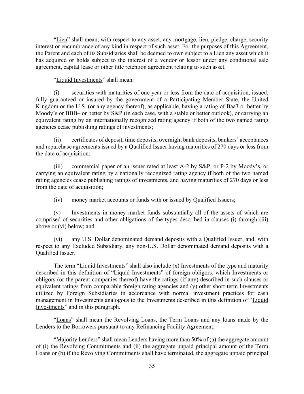 35 “Lien” shall mean, with respect to any asset, any mortgage, lien, pledge, charge, security interest or encumbrance of any kind in respect of such asset. For the purposes of this Agreement, the Parent and each of its Subsidiaries shall be deemed to own subject to a Lien any asset which it has acquired or holds subject to the interest of a vendor or lessor under any conditional sale agreement, capital lease or other title retention agreement relating to such asset. “Liquid Investments” shall mean: (i) securities with maturities of one year or less from the date of acquisition, issued, fully guaranteed or insured by the government of a Participating Member State, the United Kingdom or the U.S. (or any agency thereof), as applicable, having a rating of Baa3 or better by Moody’s or BBB– or better by S&P (in each case, with a stable or better outlook), or carrying an equivalent rating by an internationally recognized rating agency if both of the two named rating agencies cease publishing ratings of investments; (ii) certificates of deposit, time deposits, overnight bank deposits, bankers’ acceptances and repurchase agreements issued by a Qualified Issuer having maturities of 270 days or less from the date of acquisition; (iii) commercial paper of an issuer rated at least A-2 by S&P, or P-2 by Moody’s, or carrying an equivalent rating by a nationally recognized rating agency if both of the two named rating agencies cease publishing ratings of investments, and having maturities of 270 days or less from the date of acquisition; (iv) money market accounts or funds with or issued by Qualified Issuers; (v) Investments in money market funds substantially all of the assets of which are comprised of securities and other obligations of the types described in clauses (i) through (iii) above or (vi) below; and (vi) any U.S. Dollar denominated demand deposits with a Qualified Issuer, and, with respect to any Excluded Subsidiary, any non-U.S. Dollar denominated demand deposits with a Qualified Issuer. The term “Liquid Investments” shall also include (x) Investments of the type and maturity described in this definition of “Liquid Investments” of foreign obligors, which Investments or obligors (or the parent companies thereof) have the ratings (if any) described in such clauses or equivalent ratings from comparable foreign rating agencies and (y) other short-term Investments utilized by Foreign Subsidiaries in accordance with normal investment practices for cash management in Investments analogous to the Investments described in this definition of “Liquid Investments” and in this paragraph. “Loans” shall mean the Revolving Loans, the Term Loans and any loans made by the Lenders to the Borrowers pursuant to any Refinancing Facility Agreement. “Majority Lenders” shall mean Lenders having more than 50% of (a) the aggregate amount of (i) the Revolving Commitments and (ii) the aggregate unpaid principal amount of the Term Loans or (b) if the Revolving Commitments shall have terminated, the aggregate unpaid principal