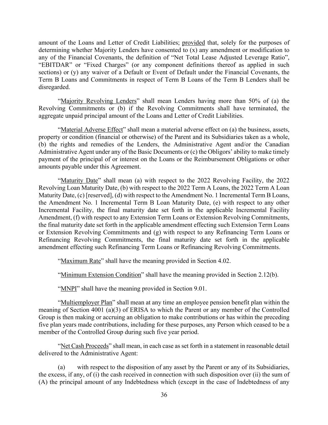 36 amount of the Loans and Letter of Credit Liabilities; provided that, solely for the purposes of determining whether Majority Lenders have consented to (x) any amendment or modification to any of the Financial Covenants, the definition of “Net Total Lease Adjusted Leverage Ratio”, “EBITDAR” or “Fixed Charges” (or any component definitions thereof as applied in such sections) or (y) any waiver of a Default or Event of Default under the Financial Covenants, the Term B Loans and Commitments in respect of Term B Loans of the Term B Lenders shall be disregarded. “Majority Revolving Lenders” shall mean Lenders having more than 50% of (a) the Revolving Commitments or (b) if the Revolving Commitments shall have terminated, the aggregate unpaid principal amount of the Loans and Letter of Credit Liabilities. “Material Adverse Effect” shall mean a material adverse effect on (a) the business, assets, property or condition (financial or otherwise) of the Parent and its Subsidiaries taken as a whole, (b) the rights and remedies of the Lenders, the Administrative Agent and/or the Canadian Administrative Agent under any of the Basic Documents or (c) the Obligors’ ability to make timely payment of the principal of or interest on the Loans or the Reimbursement Obligations or other amounts payable under this Agreement. “Maturity Date” shall mean (a) with respect to the 2022 Revolving Facility, the 2022 Revolving Loan Maturity Date, (b) with respect to the 2022 Term A Loans, the 2022 Term A Loan Maturity Date, (c) [reserved], (d) with respect to the Amendment No. 1 Incremental Term B Loans, the Amendment No. 1 Incremental Term B Loan Maturity Date, (e) with respect to any other Incremental Facility, the final maturity date set forth in the applicable Incremental Facility Amendment, (f) with respect to any Extension Term Loans or Extension Revolving Commitments, the final maturity date set forth in the applicable amendment effecting such Extension Term Loans or Extension Revolving Commitments and (g) with respect to any Refinancing Term Loans or Refinancing Revolving Commitments, the final maturity date set forth in the applicable amendment effecting such Refinancing Term Loans or Refinancing Revolving Commitments. “Maximum Rate” shall have the meaning provided in Section 4.02. “Minimum Extension Condition” shall have the meaning provided in Section 2.12(b). “MNPI” shall have the meaning provided in Section 9.01. “Multiemployer Plan” shall mean at any time an employee pension benefit plan within the meaning of Section 4001 (a)(3) of ERISA to which the Parent or any member of the Controlled Group is then making or accruing an obligation to make contributions or has within the preceding five plan years made contributions, including for these purposes, any Person which ceased to be a member of the Controlled Group during such five year period. “Net Cash Proceeds” shall mean, in each case as set forth in a statement in reasonable detail delivered to the Administrative Agent: (a) with respect to the disposition of any asset by the Parent or any of its Subsidiaries, the excess, if any, of (i) the cash received in connection with such disposition over (ii) the sum of (A) the principal amount of any Indebtedness which (except in the case of Indebtedness of any