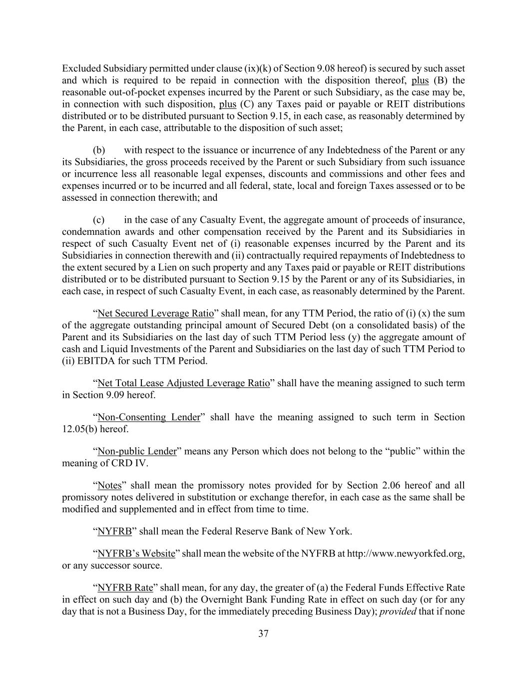 37 Excluded Subsidiary permitted under clause (ix)(k) of Section 9.08 hereof) is secured by such asset and which is required to be repaid in connection with the disposition thereof, plus (B) the reasonable out-of-pocket expenses incurred by the Parent or such Subsidiary, as the case may be, in connection with such disposition, plus (C) any Taxes paid or payable or REIT distributions distributed or to be distributed pursuant to Section 9.15, in each case, as reasonably determined by the Parent, in each case, attributable to the disposition of such asset; (b) with respect to the issuance or incurrence of any Indebtedness of the Parent or any its Subsidiaries, the gross proceeds received by the Parent or such Subsidiary from such issuance or incurrence less all reasonable legal expenses, discounts and commissions and other fees and expenses incurred or to be incurred and all federal, state, local and foreign Taxes assessed or to be assessed in connection therewith; and (c) in the case of any Casualty Event, the aggregate amount of proceeds of insurance, condemnation awards and other compensation received by the Parent and its Subsidiaries in respect of such Casualty Event net of (i) reasonable expenses incurred by the Parent and its Subsidiaries in connection therewith and (ii) contractually required repayments of Indebtedness to the extent secured by a Lien on such property and any Taxes paid or payable or REIT distributions distributed or to be distributed pursuant to Section 9.15 by the Parent or any of its Subsidiaries, in each case, in respect of such Casualty Event, in each case, as reasonably determined by the Parent. “Net Secured Leverage Ratio” shall mean, for any TTM Period, the ratio of (i) (x) the sum of the aggregate outstanding principal amount of Secured Debt (on a consolidated basis) of the Parent and its Subsidiaries on the last day of such TTM Period less (y) the aggregate amount of cash and Liquid Investments of the Parent and Subsidiaries on the last day of such TTM Period to (ii) EBITDA for such TTM Period. “Net Total Lease Adjusted Leverage Ratio” shall have the meaning assigned to such term in Section 9.09 hereof. “Non-Consenting Lender” shall have the meaning assigned to such term in Section 12.05(b) hereof. “Non-public Lender” means any Person which does not belong to the “public” within the meaning of CRD IV. “Notes” shall mean the promissory notes provided for by Section 2.06 hereof and all promissory notes delivered in substitution or exchange therefor, in each case as the same shall be modified and supplemented and in effect from time to time. “NYFRB” shall mean the Federal Reserve Bank of New York. “NYFRB’s Website” shall mean the website of the NYFRB at http://www.newyorkfed.org, or any successor source. “NYFRB Rate” shall mean, for any day, the greater of (a) the Federal Funds Effective Rate in effect on such day and (b) the Overnight Bank Funding Rate in effect on such day (or for any day that is not a Business Day, for the immediately preceding Business Day); provided that if none