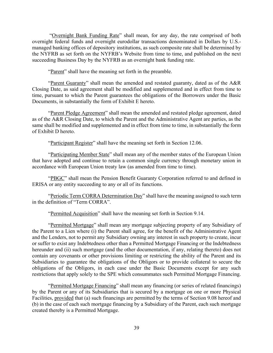 39 “Overnight Bank Funding Rate” shall mean, for any day, the rate comprised of both overnight federal funds and overnight eurodollar transactions denominated in Dollars by U.S.- managed banking offices of depository institutions, as such composite rate shall be determined by the NYFRB as set forth on the NYFRB’s Website from time to time, and published on the next succeeding Business Day by the NYFRB as an overnight bank funding rate. “Parent” shall have the meaning set forth in the preamble. “Parent Guaranty” shall mean the amended and restated guaranty, dated as of the A&R Closing Date, as said agreement shall be modified and supplemented and in effect from time to time, pursuant to which the Parent guarantees the obligations of the Borrowers under the Basic Documents, in substantially the form of Exhibit E hereto. “Parent Pledge Agreement” shall mean the amended and restated pledge agreement, dated as of the A&R Closing Date, to which the Parent and the Administrative Agent are parties, as the same shall be modified and supplemented and in effect from time to time, in substantially the form of Exhibit D hereto. “Participant Register” shall have the meaning set forth in Section 12.06. “Participating Member State” shall mean any of the member states of the European Union that have adopted and continue to retain a common single currency through monetary union in accordance with European Union treaty law (as amended from time to time). “PBGC” shall mean the Pension Benefit Guaranty Corporation referred to and defined in ERISA or any entity succeeding to any or all of its functions. “Periodic Term CORRA Determination Day” shall have the meaning assigned to such term in the definition of “Term CORRA”. “Permitted Acquisition” shall have the meaning set forth in Section 9.14. “Permitted Mortgage” shall mean any mortgage subjecting property of any Subsidiary of the Parent to a Lien where (i) the Parent shall agree, for the benefit of the Administrative Agent and the Lenders, not to permit any Subsidiary owning any interest in such property to create, incur or suffer to exist any Indebtedness other than a Permitted Mortgage Financing or the Indebtedness hereunder and (ii) such mortgage (and the other documentation, if any, relating thereto) does not contain any covenants or other provisions limiting or restricting the ability of the Parent and its Subsidiaries to guarantee the obligations of the Obligors or to provide collateral to secure the obligations of the Obligors, in each case under the Basic Documents except for any such restrictions that apply solely to the SPE which consummates such Permitted Mortgage Financing. “Permitted Mortgage Financing” shall mean any financing (or series of related financings) by the Parent or any of its Subsidiaries that is secured by a mortgage on one or more Physical Facilities, provided that (a) such financings are permitted by the terms of Section 9.08 hereof and (b) in the case of each such mortgage financing by a Subsidiary of the Parent, each such mortgage created thereby is a Permitted Mortgage.