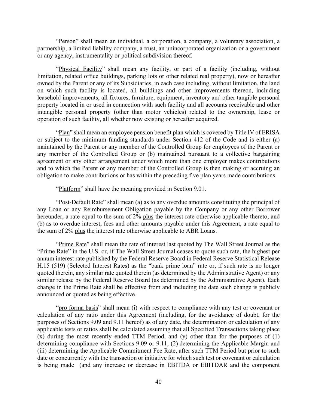 40 “Person” shall mean an individual, a corporation, a company, a voluntary association, a partnership, a limited liability company, a trust, an unincorporated organization or a government or any agency, instrumentality or political subdivision thereof. “Physical Facility” shall mean any facility, or part of a facility (including, without limitation, related office buildings, parking lots or other related real property), now or hereafter owned by the Parent or any of its Subsidiaries, in each case including, without limitation, the land on which such facility is located, all buildings and other improvements thereon, including leasehold improvements, all fixtures, furniture, equipment, inventory and other tangible personal property located in or used in connection with such facility and all accounts receivable and other intangible personal property (other than motor vehicles) related to the ownership, lease or operation of such facility, all whether now existing or hereafter acquired. “Plan” shall mean an employee pension benefit plan which is covered by Title IV of ERISA or subject to the minimum funding standards under Section 412 of the Code and is either (a) maintained by the Parent or any member of the Controlled Group for employees of the Parent or any member of the Controlled Group or (b) maintained pursuant to a collective bargaining agreement or any other arrangement under which more than one employer makes contributions and to which the Parent or any member of the Controlled Group is then making or accruing an obligation to make contributions or has within the preceding five plan years made contributions. “Platform” shall have the meaning provided in Section 9.01. “Post-Default Rate” shall mean (a) as to any overdue amounts constituting the principal of any Loan or any Reimbursement Obligation payable by the Company or any other Borrower hereunder, a rate equal to the sum of 2% plus the interest rate otherwise applicable thereto, and (b) as to overdue interest, fees and other amounts payable under this Agreement, a rate equal to the sum of 2% plus the interest rate otherwise applicable to ABR Loans. “Prime Rate” shall mean the rate of interest last quoted by The Wall Street Journal as the “Prime Rate” in the U.S. or, if The Wall Street Journal ceases to quote such rate, the highest per annum interest rate published by the Federal Reserve Board in Federal Reserve Statistical Release H.15 (519) (Selected Interest Rates) as the “bank prime loan” rate or, if such rate is no longer quoted therein, any similar rate quoted therein (as determined by the Administrative Agent) or any similar release by the Federal Reserve Board (as determined by the Administrative Agent). Each change in the Prime Rate shall be effective from and including the date such change is publicly announced or quoted as being effective. “pro forma basis” shall mean (i) with respect to compliance with any test or covenant or calculation of any ratio under this Agreement (including, for the avoidance of doubt, for the purposes of Sections 9.09 and 9.11 hereof) as of any date, the determination or calculation of any applicable tests or ratios shall be calculated assuming that all Specified Transactions taking place (x) during the most recently ended TTM Period, and (y) other than for the purposes of (1) determining compliance with Sections 9.09 or 9.11, (2) determining the Applicable Margin and (iii) determining the Applicable Commitment Fee Rate, after such TTM Period but prior to such date or concurrently with the transaction or initiative for which such test or covenant or calculation is being made (and any increase or decrease in EBITDA or EBITDAR and the component