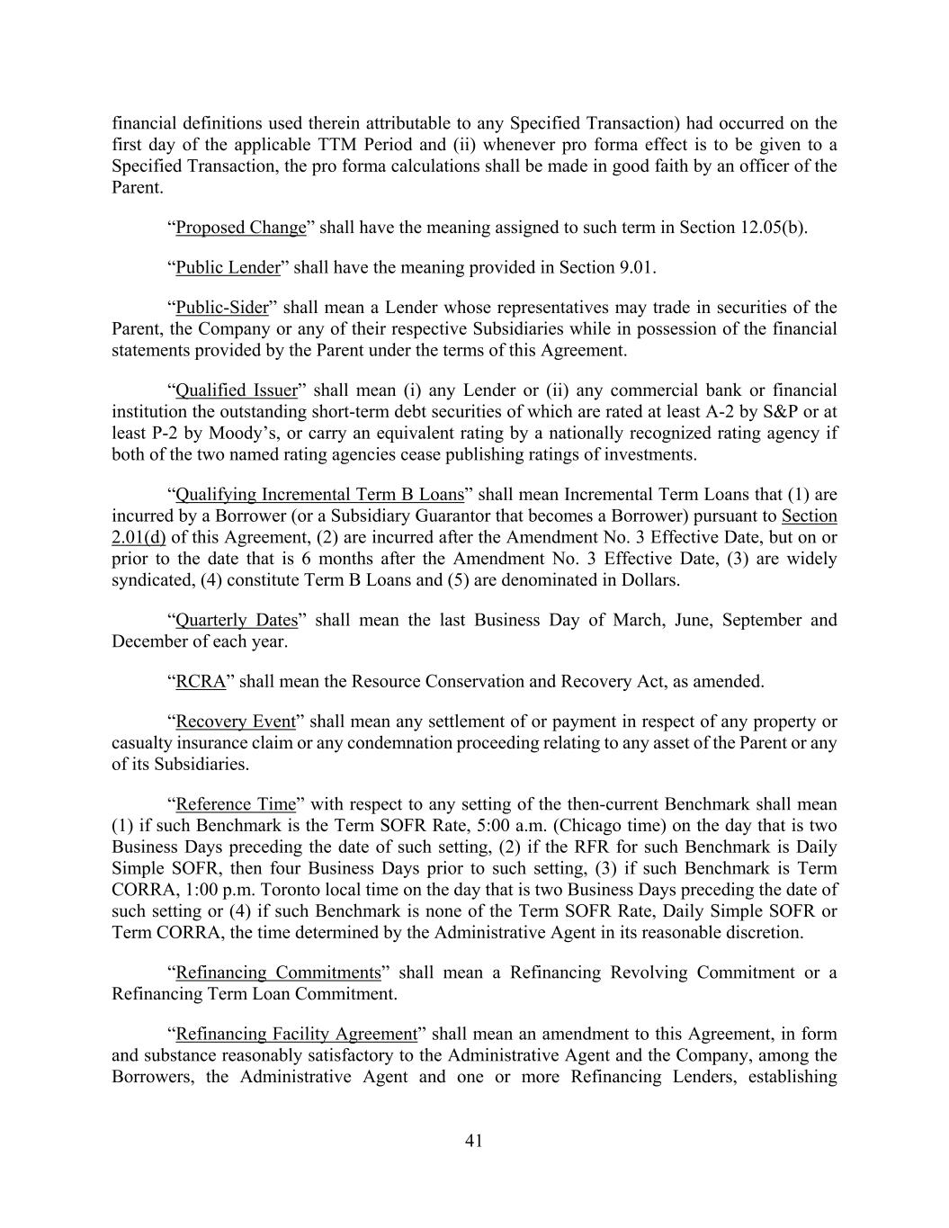 41 financial definitions used therein attributable to any Specified Transaction) had occurred on the first day of the applicable TTM Period and (ii) whenever pro forma effect is to be given to a Specified Transaction, the pro forma calculations shall be made in good faith by an officer of the Parent. “Proposed Change” shall have the meaning assigned to such term in Section 12.05(b). “Public Lender” shall have the meaning provided in Section 9.01. “Public-Sider” shall mean a Lender whose representatives may trade in securities of the Parent, the Company or any of their respective Subsidiaries while in possession of the financial statements provided by the Parent under the terms of this Agreement. “Qualified Issuer” shall mean (i) any Lender or (ii) any commercial bank or financial institution the outstanding short-term debt securities of which are rated at least A-2 by S&P or at least P-2 by Moody’s, or carry an equivalent rating by a nationally recognized rating agency if both of the two named rating agencies cease publishing ratings of investments. “Qualifying Incremental Term B Loans” shall mean Incremental Term Loans that (1) are incurred by a Borrower (or a Subsidiary Guarantor that becomes a Borrower) pursuant to Section 2.01(d) of this Agreement, (2) are incurred after the Amendment No. 3 Effective Date, but on or prior to the date that is 6 months after the Amendment No. 3 Effective Date, (3) are widely syndicated, (4) constitute Term B Loans and (5) are denominated in Dollars. “Quarterly Dates” shall mean the last Business Day of March, June, September and December of each year. “RCRA” shall mean the Resource Conservation and Recovery Act, as amended. “Recovery Event” shall mean any settlement of or payment in respect of any property or casualty insurance claim or any condemnation proceeding relating to any asset of the Parent or any of its Subsidiaries. “Reference Time” with respect to any setting of the then-current Benchmark shall mean (1) if such Benchmark is the Term SOFR Rate, 5:00 a.m. (Chicago time) on the day that is two Business Days preceding the date of such setting, (2) if the RFR for such Benchmark is Daily Simple SOFR, then four Business Days prior to such setting, (3) if such Benchmark is Term CORRA, 1:00 p.m. Toronto local time on the day that is two Business Days preceding the date of such setting or (4) if such Benchmark is none of the Term SOFR Rate, Daily Simple SOFR or Term CORRA, the time determined by the Administrative Agent in its reasonable discretion. “Refinancing Commitments” shall mean a Refinancing Revolving Commitment or a Refinancing Term Loan Commitment. “Refinancing Facility Agreement” shall mean an amendment to this Agreement, in form and substance reasonably satisfactory to the Administrative Agent and the Company, among the Borrowers, the Administrative Agent and one or more Refinancing Lenders, establishing