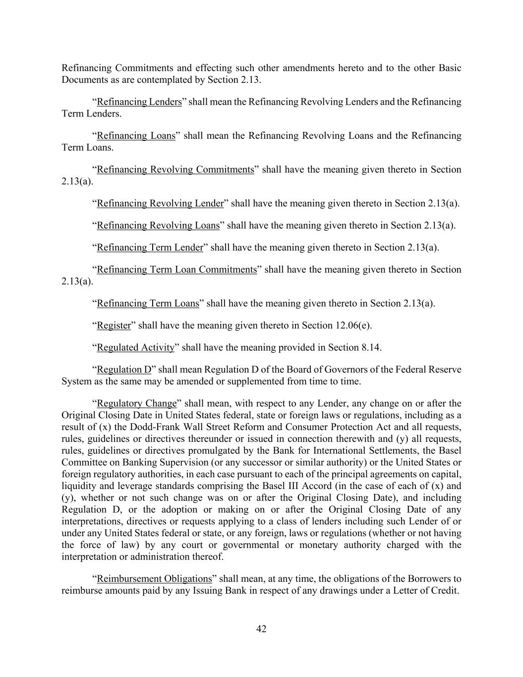 42 Refinancing Commitments and effecting such other amendments hereto and to the other Basic Documents as are contemplated by Section 2.13. “Refinancing Lenders” shall mean the Refinancing Revolving Lenders and the Refinancing Term Lenders. “Refinancing Loans” shall mean the Refinancing Revolving Loans and the Refinancing Term Loans. “Refinancing Revolving Commitments” shall have the meaning given thereto in Section 2.13(a). “Refinancing Revolving Lender” shall have the meaning given thereto in Section 2.13(a). “Refinancing Revolving Loans” shall have the meaning given thereto in Section 2.13(a). “Refinancing Term Lender” shall have the meaning given thereto in Section 2.13(a). “Refinancing Term Loan Commitments” shall have the meaning given thereto in Section 2.13(a). “Refinancing Term Loans” shall have the meaning given thereto in Section 2.13(a). “Register” shall have the meaning given thereto in Section 12.06(e). “Regulated Activity” shall have the meaning provided in Section 8.14. “Regulation D” shall mean Regulation D of the Board of Governors of the Federal Reserve System as the same may be amended or supplemented from time to time. “Regulatory Change” shall mean, with respect to any Lender, any change on or after the Original Closing Date in United States federal, state or foreign laws or regulations, including as a result of (x) the Dodd-Frank Wall Street Reform and Consumer Protection Act and all requests, rules, guidelines or directives thereunder or issued in connection therewith and (y) all requests, rules, guidelines or directives promulgated by the Bank for International Settlements, the Basel Committee on Banking Supervision (or any successor or similar authority) or the United States or foreign regulatory authorities, in each case pursuant to each of the principal agreements on capital, liquidity and leverage standards comprising the Basel III Accord (in the case of each of (x) and (y), whether or not such change was on or after the Original Closing Date), and including Regulation D, or the adoption or making on or after the Original Closing Date of any interpretations, directives or requests applying to a class of lenders including such Lender of or under any United States federal or state, or any foreign, laws or regulations (whether or not having the force of law) by any court or governmental or monetary authority charged with the interpretation or administration thereof. “Reimbursement Obligations” shall mean, at any time, the obligations of the Borrowers to reimburse amounts paid by any Issuing Bank in respect of any drawings under a Letter of Credit.