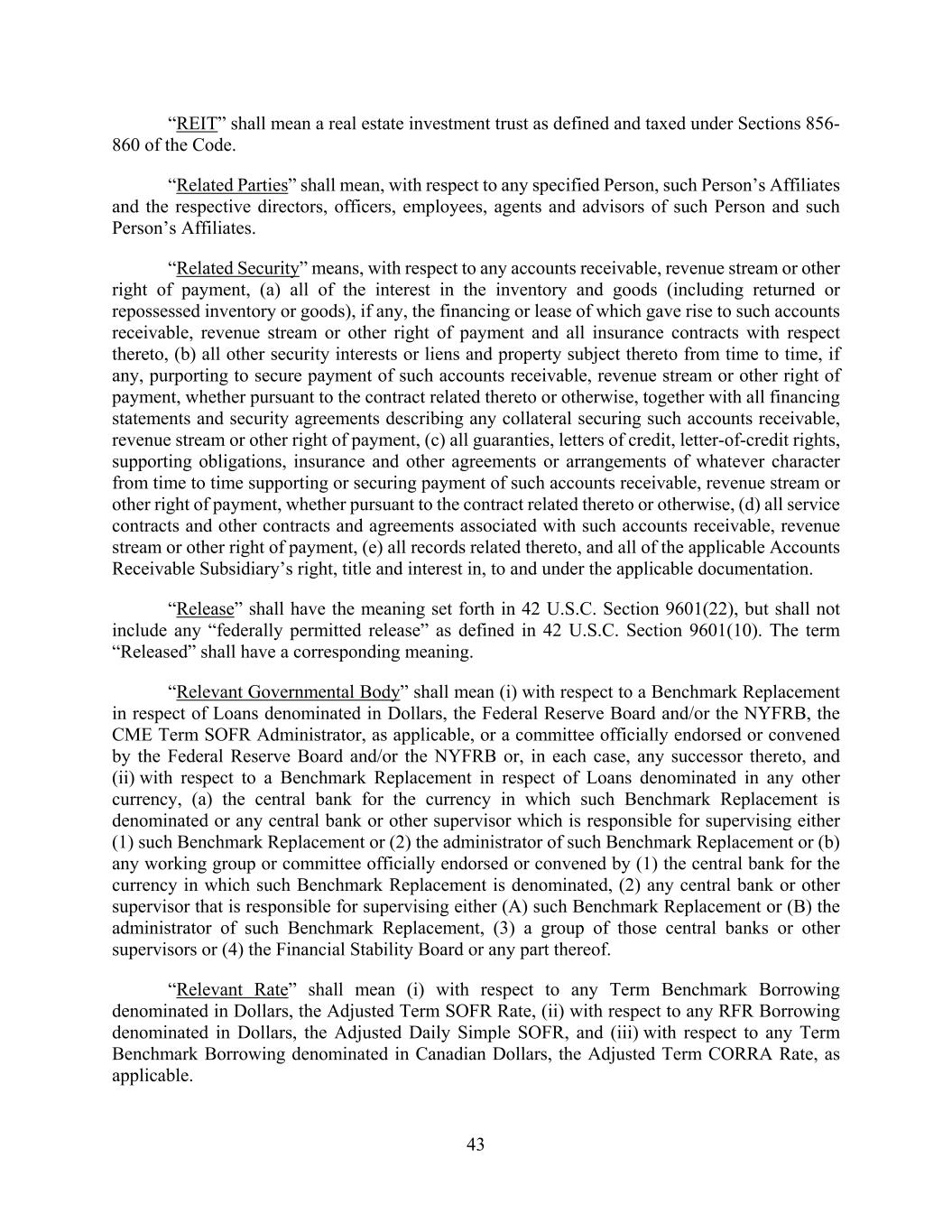 43 “REIT” shall mean a real estate investment trust as defined and taxed under Sections 856- 860 of the Code. “Related Parties” shall mean, with respect to any specified Person, such Person’s Affiliates and the respective directors, officers, employees, agents and advisors of such Person and such Person’s Affiliates. “Related Security” means, with respect to any accounts receivable, revenue stream or other right of payment, (a) all of the interest in the inventory and goods (including returned or repossessed inventory or goods), if any, the financing or lease of which gave rise to such accounts receivable, revenue stream or other right of payment and all insurance contracts with respect thereto, (b) all other security interests or liens and property subject thereto from time to time, if any, purporting to secure payment of such accounts receivable, revenue stream or other right of payment, whether pursuant to the contract related thereto or otherwise, together with all financing statements and security agreements describing any collateral securing such accounts receivable, revenue stream or other right of payment, (c) all guaranties, letters of credit, letter-of-credit rights, supporting obligations, insurance and other agreements or arrangements of whatever character from time to time supporting or securing payment of such accounts receivable, revenue stream or other right of payment, whether pursuant to the contract related thereto or otherwise, (d) all service contracts and other contracts and agreements associated with such accounts receivable, revenue stream or other right of payment, (e) all records related thereto, and all of the applicable Accounts Receivable Subsidiary’s right, title and interest in, to and under the applicable documentation. “Release” shall have the meaning set forth in 42 U.S.C. Section 9601(22), but shall not include any “federally permitted release” as defined in 42 U.S.C. Section 9601(10). The term “Released” shall have a corresponding meaning. “Relevant Governmental Body” shall mean (i) with respect to a Benchmark Replacement in respect of Loans denominated in Dollars, the Federal Reserve Board and/or the NYFRB, the CME Term SOFR Administrator, as applicable, or a committee officially endorsed or convened by the Federal Reserve Board and/or the NYFRB or, in each case, any successor thereto, and (ii) with respect to a Benchmark Replacement in respect of Loans denominated in any other currency, (a) the central bank for the currency in which such Benchmark Replacement is denominated or any central bank or other supervisor which is responsible for supervising either (1) such Benchmark Replacement or (2) the administrator of such Benchmark Replacement or (b) any working group or committee officially endorsed or convened by (1) the central bank for the currency in which such Benchmark Replacement is denominated, (2) any central bank or other supervisor that is responsible for supervising either (A) such Benchmark Replacement or (B) the administrator of such Benchmark Replacement, (3) a group of those central banks or other supervisors or (4) the Financial Stability Board or any part thereof. “Relevant Rate” shall mean (i) with respect to any Term Benchmark Borrowing denominated in Dollars, the Adjusted Term SOFR Rate, (ii) with respect to any RFR Borrowing denominated in Dollars, the Adjusted Daily Simple SOFR, and (iii) with respect to any Term Benchmark Borrowing denominated in Canadian Dollars, the Adjusted Term CORRA Rate, as applicable.