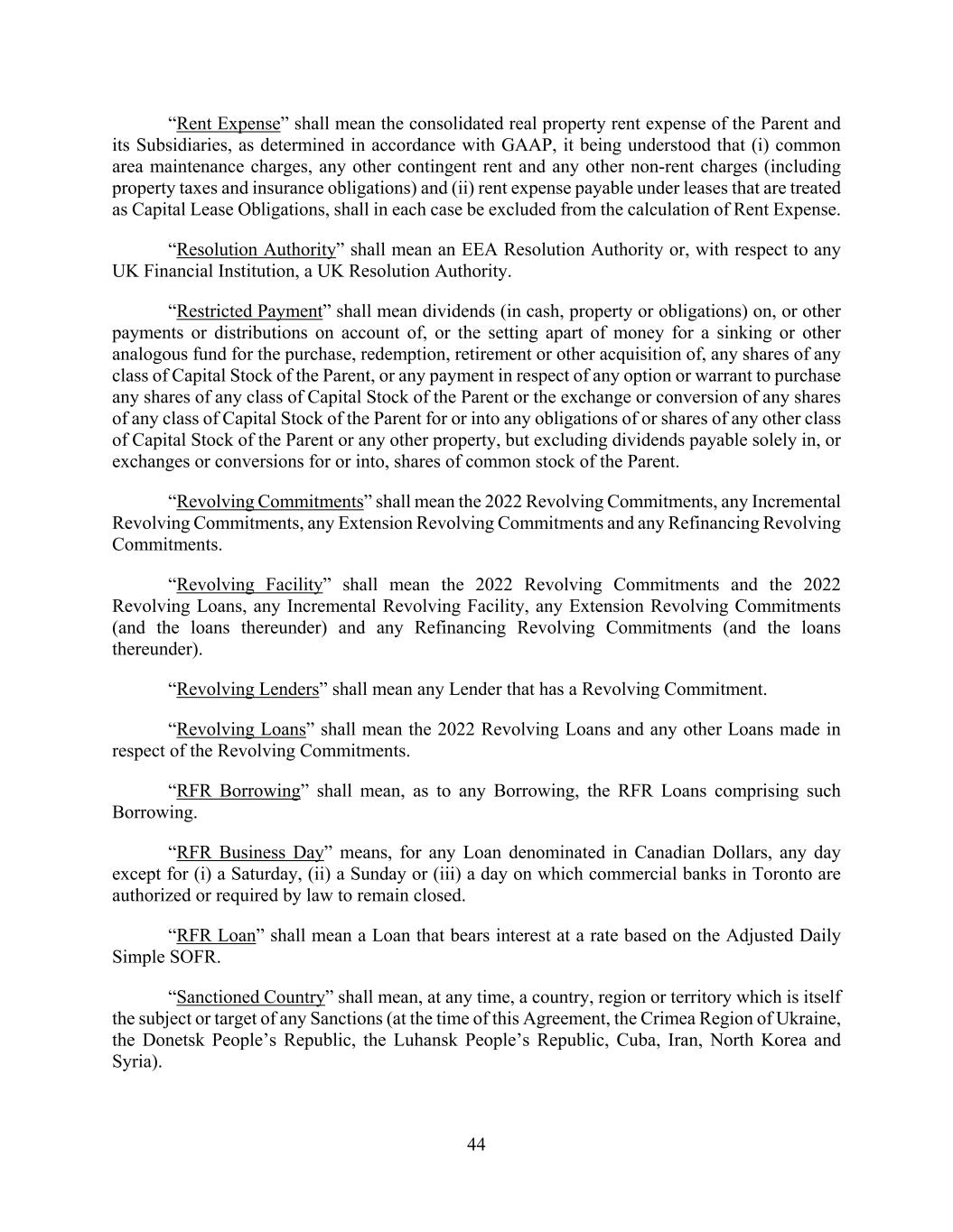 44 “Rent Expense” shall mean the consolidated real property rent expense of the Parent and its Subsidiaries, as determined in accordance with GAAP, it being understood that (i) common area maintenance charges, any other contingent rent and any other non-rent charges (including property taxes and insurance obligations) and (ii) rent expense payable under leases that are treated as Capital Lease Obligations, shall in each case be excluded from the calculation of Rent Expense. “Resolution Authority” shall mean an EEA Resolution Authority or, with respect to any UK Financial Institution, a UK Resolution Authority. “Restricted Payment” shall mean dividends (in cash, property or obligations) on, or other payments or distributions on account of, or the setting apart of money for a sinking or other analogous fund for the purchase, redemption, retirement or other acquisition of, any shares of any class of Capital Stock of the Parent, or any payment in respect of any option or warrant to purchase any shares of any class of Capital Stock of the Parent or the exchange or conversion of any shares of any class of Capital Stock of the Parent for or into any obligations of or shares of any other class of Capital Stock of the Parent or any other property, but excluding dividends payable solely in, or exchanges or conversions for or into, shares of common stock of the Parent. “Revolving Commitments” shall mean the 2022 Revolving Commitments, any Incremental Revolving Commitments, any Extension Revolving Commitments and any Refinancing Revolving Commitments. “Revolving Facility” shall mean the 2022 Revolving Commitments and the 2022 Revolving Loans, any Incremental Revolving Facility, any Extension Revolving Commitments (and the loans thereunder) and any Refinancing Revolving Commitments (and the loans thereunder). “Revolving Lenders” shall mean any Lender that has a Revolving Commitment. “Revolving Loans” shall mean the 2022 Revolving Loans and any other Loans made in respect of the Revolving Commitments. “RFR Borrowing” shall mean, as to any Borrowing, the RFR Loans comprising such Borrowing. “RFR Business Day” means, for any Loan denominated in Canadian Dollars, any day except for (i) a Saturday, (ii) a Sunday or (iii) a day on which commercial banks in Toronto are authorized or required by law to remain closed. “RFR Loan” shall mean a Loan that bears interest at a rate based on the Adjusted Daily Simple SOFR. “Sanctioned Country” shall mean, at any time, a country, region or territory which is itself the subject or target of any Sanctions (at the time of this Agreement, the Crimea Region of Ukraine, the Donetsk People’s Republic, the Luhansk People’s Republic, Cuba, Iran, North Korea and Syria).