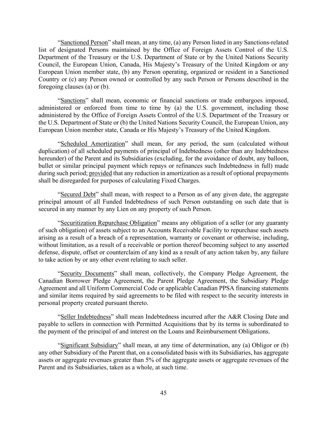 45 “Sanctioned Person” shall mean, at any time, (a) any Person listed in any Sanctions-related list of designated Persons maintained by the Office of Foreign Assets Control of the U.S. Department of the Treasury or the U.S. Department of State or by the United Nations Security Council, the European Union, Canada, His Majesty’s Treasury of the United Kingdom or any European Union member state, (b) any Person operating, organized or resident in a Sanctioned Country or (c) any Person owned or controlled by any such Person or Persons described in the foregoing clauses (a) or (b). “Sanctions” shall mean, economic or financial sanctions or trade embargoes imposed, administered or enforced from time to time by (a) the U.S. government, including those administered by the Office of Foreign Assets Control of the U.S. Department of the Treasury or the U.S. Department of State or (b) the United Nations Security Council, the European Union, any European Union member state, Canada or His Majesty’s Treasury of the United Kingdom. “Scheduled Amortization” shall mean, for any period, the sum (calculated without duplication) of all scheduled payments of principal of Indebtedness (other than any Indebtedness hereunder) of the Parent and its Subsidiaries (excluding, for the avoidance of doubt, any balloon, bullet or similar principal payment which repays or refinances such Indebtedness in full) made during such period; provided that any reduction in amortization as a result of optional prepayments shall be disregarded for purposes of calculating Fixed Charges. “Secured Debt” shall mean, with respect to a Person as of any given date, the aggregate principal amount of all Funded Indebtedness of such Person outstanding on such date that is secured in any manner by any Lien on any property of such Person. “Securitization Repurchase Obligation” means any obligation of a seller (or any guaranty of such obligation) of assets subject to an Accounts Receivable Facility to repurchase such assets arising as a result of a breach of a representation, warranty or covenant or otherwise, including, without limitation, as a result of a receivable or portion thereof becoming subject to any asserted defense, dispute, offset or counterclaim of any kind as a result of any action taken by, any failure to take action by or any other event relating to such seller. “Security Documents” shall mean, collectively, the Company Pledge Agreement, the Canadian Borrower Pledge Agreement, the Parent Pledge Agreement, the Subsidiary Pledge Agreement and all Uniform Commercial Code or applicable Canadian PPSA financing statements and similar items required by said agreements to be filed with respect to the security interests in personal property created pursuant thereto. “Seller Indebtedness” shall mean Indebtedness incurred after the A&R Closing Date and payable to sellers in connection with Permitted Acquisitions that by its terms is subordinated to the payment of the principal of and interest on the Loans and Reimbursement Obligations. “Significant Subsidiary” shall mean, at any time of determination, any (a) Obligor or (b) any other Subsidiary of the Parent that, on a consolidated basis with its Subsidiaries, has aggregate assets or aggregate revenues greater than 5% of the aggregate assets or aggregate revenues of the Parent and its Subsidiaries, taken as a whole, at such time.
