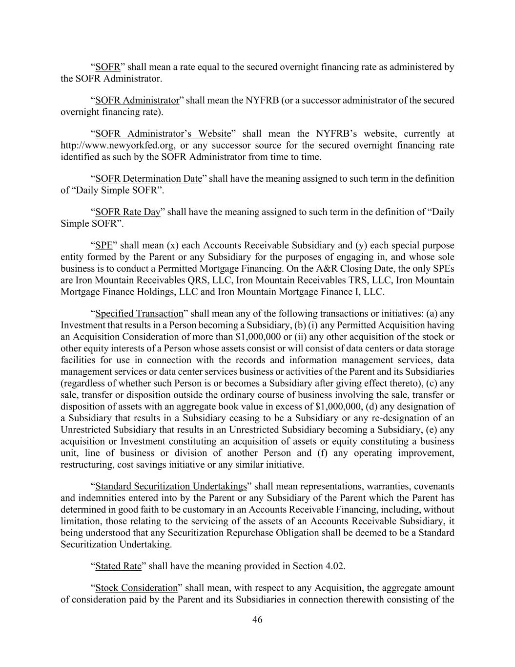 46 “SOFR” shall mean a rate equal to the secured overnight financing rate as administered by the SOFR Administrator. “SOFR Administrator” shall mean the NYFRB (or a successor administrator of the secured overnight financing rate). “SOFR Administrator’s Website” shall mean the NYFRB’s website, currently at http://www.newyorkfed.org, or any successor source for the secured overnight financing rate identified as such by the SOFR Administrator from time to time. “SOFR Determination Date” shall have the meaning assigned to such term in the definition of “Daily Simple SOFR”. “SOFR Rate Day” shall have the meaning assigned to such term in the definition of “Daily Simple SOFR”. “SPE” shall mean (x) each Accounts Receivable Subsidiary and (y) each special purpose entity formed by the Parent or any Subsidiary for the purposes of engaging in, and whose sole business is to conduct a Permitted Mortgage Financing. On the A&R Closing Date, the only SPEs are Iron Mountain Receivables QRS, LLC, Iron Mountain Receivables TRS, LLC, Iron Mountain Mortgage Finance Holdings, LLC and Iron Mountain Mortgage Finance I, LLC. “Specified Transaction” shall mean any of the following transactions or initiatives: (a) any Investment that results in a Person becoming a Subsidiary, (b) (i) any Permitted Acquisition having an Acquisition Consideration of more than $1,000,000 or (ii) any other acquisition of the stock or other equity interests of a Person whose assets consist or will consist of data centers or data storage facilities for use in connection with the records and information management services, data management services or data center services business or activities of the Parent and its Subsidiaries (regardless of whether such Person is or becomes a Subsidiary after giving effect thereto), (c) any sale, transfer or disposition outside the ordinary course of business involving the sale, transfer or disposition of assets with an aggregate book value in excess of $1,000,000, (d) any designation of a Subsidiary that results in a Subsidiary ceasing to be a Subsidiary or any re-designation of an Unrestricted Subsidiary that results in an Unrestricted Subsidiary becoming a Subsidiary, (e) any acquisition or Investment constituting an acquisition of assets or equity constituting a business unit, line of business or division of another Person and (f) any operating improvement, restructuring, cost savings initiative or any similar initiative. “Standard Securitization Undertakings” shall mean representations, warranties, covenants and indemnities entered into by the Parent or any Subsidiary of the Parent which the Parent has determined in good faith to be customary in an Accounts Receivable Financing, including, without limitation, those relating to the servicing of the assets of an Accounts Receivable Subsidiary, it being understood that any Securitization Repurchase Obligation shall be deemed to be a Standard Securitization Undertaking. “Stated Rate” shall have the meaning provided in Section 4.02. “Stock Consideration” shall mean, with respect to any Acquisition, the aggregate amount of consideration paid by the Parent and its Subsidiaries in connection therewith consisting of the