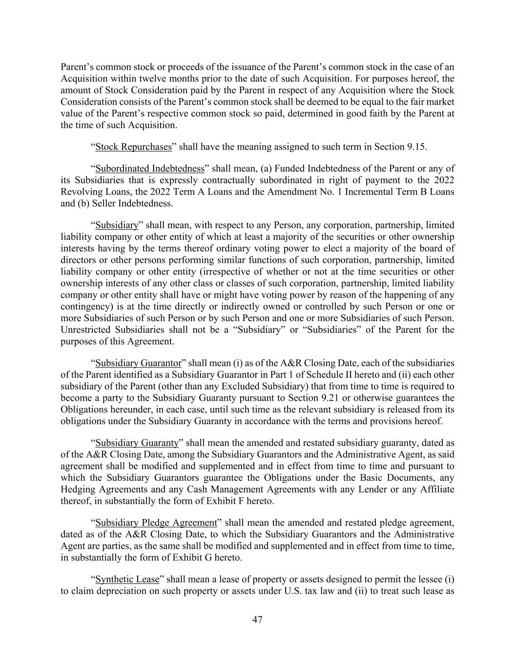 47 Parent’s common stock or proceeds of the issuance of the Parent’s common stock in the case of an Acquisition within twelve months prior to the date of such Acquisition. For purposes hereof, the amount of Stock Consideration paid by the Parent in respect of any Acquisition where the Stock Consideration consists of the Parent’s common stock shall be deemed to be equal to the fair market value of the Parent’s respective common stock so paid, determined in good faith by the Parent at the time of such Acquisition. “Stock Repurchases” shall have the meaning assigned to such term in Section 9.15. “Subordinated Indebtedness” shall mean, (a) Funded Indebtedness of the Parent or any of its Subsidiaries that is expressly contractually subordinated in right of payment to the 2022 Revolving Loans, the 2022 Term A Loans and the Amendment No. 1 Incremental Term B Loans and (b) Seller Indebtedness. “Subsidiary” shall mean, with respect to any Person, any corporation, partnership, limited liability company or other entity of which at least a majority of the securities or other ownership interests having by the terms thereof ordinary voting power to elect a majority of the board of directors or other persons performing similar functions of such corporation, partnership, limited liability company or other entity (irrespective of whether or not at the time securities or other ownership interests of any other class or classes of such corporation, partnership, limited liability company or other entity shall have or might have voting power by reason of the happening of any contingency) is at the time directly or indirectly owned or controlled by such Person or one or more Subsidiaries of such Person or by such Person and one or more Subsidiaries of such Person. Unrestricted Subsidiaries shall not be a “Subsidiary” or “Subsidiaries” of the Parent for the purposes of this Agreement. “Subsidiary Guarantor” shall mean (i) as of the A&R Closing Date, each of the subsidiaries of the Parent identified as a Subsidiary Guarantor in Part 1 of Schedule II hereto and (ii) each other subsidiary of the Parent (other than any Excluded Subsidiary) that from time to time is required to become a party to the Subsidiary Guaranty pursuant to Section 9.21 or otherwise guarantees the Obligations hereunder, in each case, until such time as the relevant subsidiary is released from its obligations under the Subsidiary Guaranty in accordance with the terms and provisions hereof. “Subsidiary Guaranty” shall mean the amended and restated subsidiary guaranty, dated as of the A&R Closing Date, among the Subsidiary Guarantors and the Administrative Agent, as said agreement shall be modified and supplemented and in effect from time to time and pursuant to which the Subsidiary Guarantors guarantee the Obligations under the Basic Documents, any Hedging Agreements and any Cash Management Agreements with any Lender or any Affiliate thereof, in substantially the form of Exhibit F hereto. “Subsidiary Pledge Agreement” shall mean the amended and restated pledge agreement, dated as of the A&R Closing Date, to which the Subsidiary Guarantors and the Administrative Agent are parties, as the same shall be modified and supplemented and in effect from time to time, in substantially the form of Exhibit G hereto. “Synthetic Lease” shall mean a lease of property or assets designed to permit the lessee (i) to claim depreciation on such property or assets under U.S. tax law and (ii) to treat such lease as
