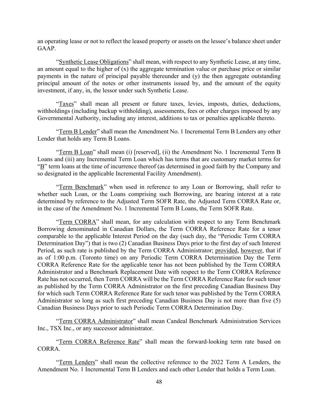 48 an operating lease or not to reflect the leased property or assets on the lessee’s balance sheet under GAAP. “Synthetic Lease Obligations” shall mean, with respect to any Synthetic Lease, at any time, an amount equal to the higher of (x) the aggregate termination value or purchase price or similar payments in the nature of principal payable thereunder and (y) the then aggregate outstanding principal amount of the notes or other instruments issued by, and the amount of the equity investment, if any, in, the lessor under such Synthetic Lease. “Taxes” shall mean all present or future taxes, levies, imposts, duties, deductions, withholdings (including backup withholding), assessments, fees or other charges imposed by any Governmental Authority, including any interest, additions to tax or penalties applicable thereto. “Term B Lender” shall mean the Amendment No. 1 Incremental Term B Lenders any other Lender that holds any Term B Loans. “Term B Loan” shall mean (i) [reserved], (ii) the Amendment No. 1 Incremental Term B Loans and (iii) any Incremental Term Loan which has terms that are customary market terms for “B” term loans at the time of incurrence thereof (as determined in good faith by the Company and so designated in the applicable Incremental Facility Amendment). “Term Benchmark” when used in reference to any Loan or Borrowing, shall refer to whether such Loan, or the Loans comprising such Borrowing, are bearing interest at a rate determined by reference to the Adjusted Term SOFR Rate, the Adjusted Term CORRA Rate or, in the case of the Amendment No. 1 Incremental Term B Loans, the Term SOFR Rate. “Term CORRA” shall mean, for any calculation with respect to any Term Benchmark Borrowing denominated in Canadian Dollars, the Term CORRA Reference Rate for a tenor comparable to the applicable Interest Period on the day (such day, the “Periodic Term CORRA Determination Day”) that is two (2) Canadian Business Days prior to the first day of such Interest Period, as such rate is published by the Term CORRA Administrator; provided, however, that if as of 1:00 p.m. (Toronto time) on any Periodic Term CORRA Determination Day the Term CORRA Reference Rate for the applicable tenor has not been published by the Term CORRA Administrator and a Benchmark Replacement Date with respect to the Term CORRA Reference Rate has not occurred, then Term CORRA will be the Term CORRA Reference Rate for such tenor as published by the Term CORRA Administrator on the first preceding Canadian Business Day for which such Term CORRA Reference Rate for such tenor was published by the Term CORRA Administrator so long as such first preceding Canadian Business Day is not more than five (5) Canadian Business Days prior to such Periodic Term CORRA Determination Day. “Term CORRA Administrator” shall mean Candeal Benchmark Administration Services Inc., TSX Inc., or any successor administrator. “Term CORRA Reference Rate” shall mean the forward-looking term rate based on CORRA. “Term Lenders” shall mean the collective reference to the 2022 Term A Lenders, the Amendment No. 1 Incremental Term B Lenders and each other Lender that holds a Term Loan.