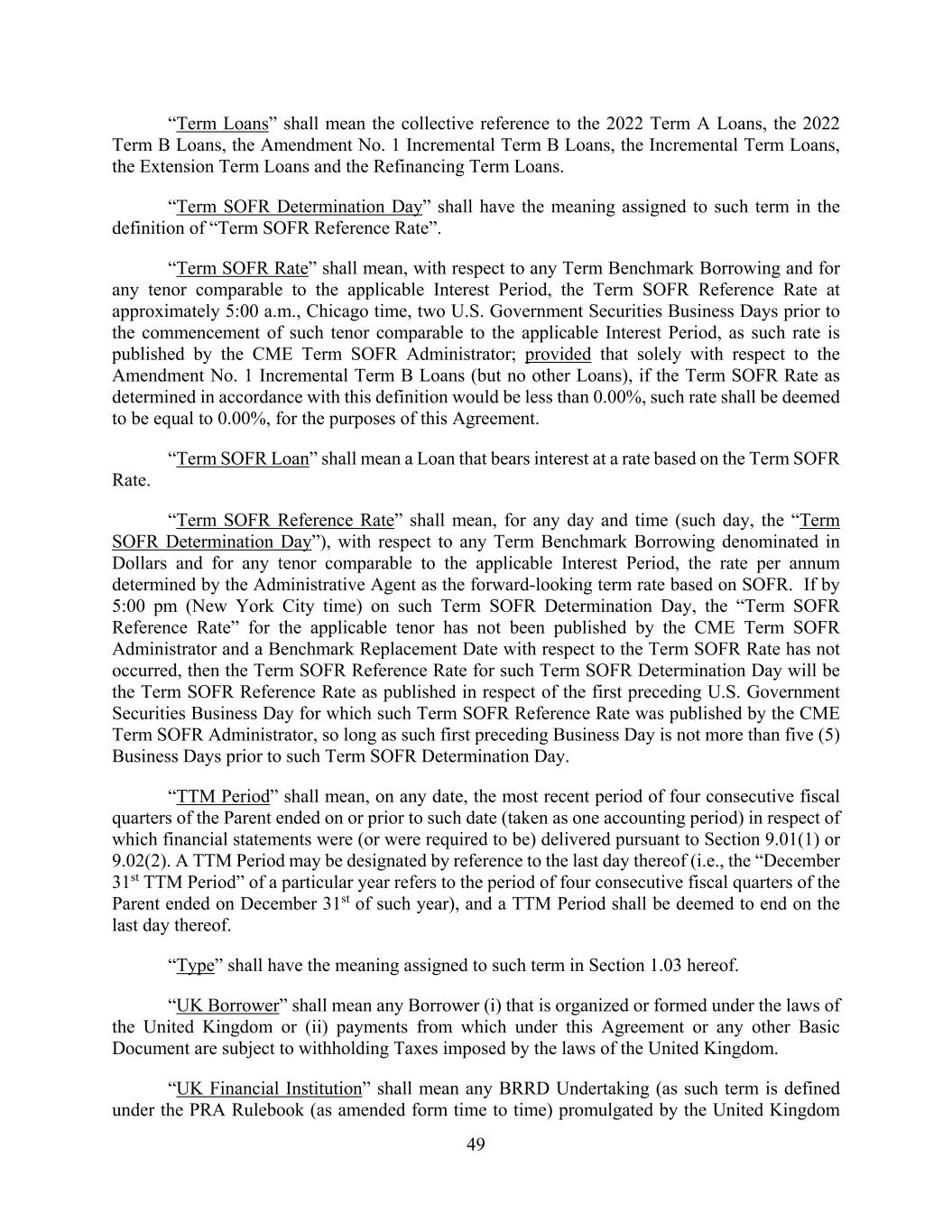 49 “Term Loans” shall mean the collective reference to the 2022 Term A Loans, the 2022 Term B Loans, the Amendment No. 1 Incremental Term B Loans, the Incremental Term Loans, the Extension Term Loans and the Refinancing Term Loans. “Term SOFR Determination Day” shall have the meaning assigned to such term in the definition of “Term SOFR Reference Rate”. “Term SOFR Rate” shall mean, with respect to any Term Benchmark Borrowing and for any tenor comparable to the applicable Interest Period, the Term SOFR Reference Rate at approximately 5:00 a.m., Chicago time, two U.S. Government Securities Business Days prior to the commencement of such tenor comparable to the applicable Interest Period, as such rate is published by the CME Term SOFR Administrator; provided that solely with respect to the Amendment No. 1 Incremental Term B Loans (but no other Loans), if the Term SOFR Rate as determined in accordance with this definition would be less than 0.00%, such rate shall be deemed to be equal to 0.00%, for the purposes of this Agreement. “Term SOFR Loan” shall mean a Loan that bears interest at a rate based on the Term SOFR Rate. “Term SOFR Reference Rate” shall mean, for any day and time (such day, the “Term SOFR Determination Day”), with respect to any Term Benchmark Borrowing denominated in Dollars and for any tenor comparable to the applicable Interest Period, the rate per annum determined by the Administrative Agent as the forward-looking term rate based on SOFR. If by 5:00 pm (New York City time) on such Term SOFR Determination Day, the “Term SOFR Reference Rate” for the applicable tenor has not been published by the CME Term SOFR Administrator and a Benchmark Replacement Date with respect to the Term SOFR Rate has not occurred, then the Term SOFR Reference Rate for such Term SOFR Determination Day will be the Term SOFR Reference Rate as published in respect of the first preceding U.S. Government Securities Business Day for which such Term SOFR Reference Rate was published by the CME Term SOFR Administrator, so long as such first preceding Business Day is not more than five (5) Business Days prior to such Term SOFR Determination Day. “TTM Period” shall mean, on any date, the most recent period of four consecutive fiscal quarters of the Parent ended on or prior to such date (taken as one accounting period) in respect of which financial statements were (or were required to be) delivered pursuant to Section 9.01(1) or 9.02(2). A TTM Period may be designated by reference to the last day thereof (i.e., the “December 31st TTM Period” of a particular year refers to the period of four consecutive fiscal quarters of the Parent ended on December 31st of such year), and a TTM Period shall be deemed to end on the last day thereof. “Type” shall have the meaning assigned to such term in Section 1.03 hereof. “UK Borrower” shall mean any Borrower (i) that is organized or formed under the laws of the United Kingdom or (ii) payments from which under this Agreement or any other Basic Document are subject to withholding Taxes imposed by the laws of the United Kingdom. “UK Financial Institution” shall mean any BRRD Undertaking (as such term is defined under the PRA Rulebook (as amended form time to time) promulgated by the United Kingdom