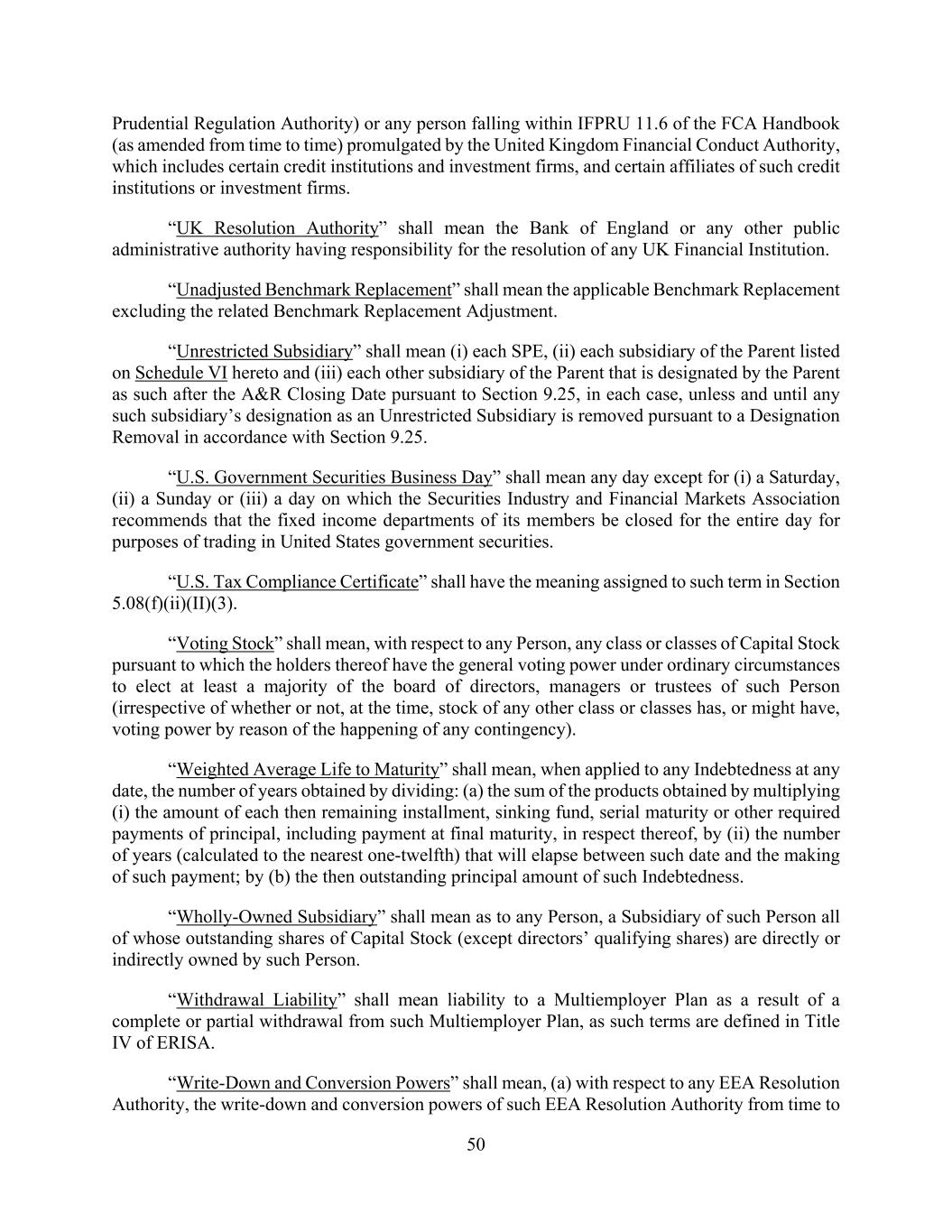 50 Prudential Regulation Authority) or any person falling within IFPRU 11.6 of the FCA Handbook (as amended from time to time) promulgated by the United Kingdom Financial Conduct Authority, which includes certain credit institutions and investment firms, and certain affiliates of such credit institutions or investment firms. “UK Resolution Authority” shall mean the Bank of England or any other public administrative authority having responsibility for the resolution of any UK Financial Institution. “Unadjusted Benchmark Replacement” shall mean the applicable Benchmark Replacement excluding the related Benchmark Replacement Adjustment. “Unrestricted Subsidiary” shall mean (i) each SPE, (ii) each subsidiary of the Parent listed on Schedule VI hereto and (iii) each other subsidiary of the Parent that is designated by the Parent as such after the A&R Closing Date pursuant to Section 9.25, in each case, unless and until any such subsidiary’s designation as an Unrestricted Subsidiary is removed pursuant to a Designation Removal in accordance with Section 9.25. “U.S. Government Securities Business Day” shall mean any day except for (i) a Saturday, (ii) a Sunday or (iii) a day on which the Securities Industry and Financial Markets Association recommends that the fixed income departments of its members be closed for the entire day for purposes of trading in United States government securities. “U.S. Tax Compliance Certificate” shall have the meaning assigned to such term in Section 5.08(f)(ii)(II)(3). “Voting Stock” shall mean, with respect to any Person, any class or classes of Capital Stock pursuant to which the holders thereof have the general voting power under ordinary circumstances to elect at least a majority of the board of directors, managers or trustees of such Person (irrespective of whether or not, at the time, stock of any other class or classes has, or might have, voting power by reason of the happening of any contingency). “Weighted Average Life to Maturity” shall mean, when applied to any Indebtedness at any date, the number of years obtained by dividing: (a) the sum of the products obtained by multiplying (i) the amount of each then remaining installment, sinking fund, serial maturity or other required payments of principal, including payment at final maturity, in respect thereof, by (ii) the number of years (calculated to the nearest one-twelfth) that will elapse between such date and the making of such payment; by (b) the then outstanding principal amount of such Indebtedness. “Wholly-Owned Subsidiary” shall mean as to any Person, a Subsidiary of such Person all of whose outstanding shares of Capital Stock (except directors’ qualifying shares) are directly or indirectly owned by such Person. “Withdrawal Liability” shall mean liability to a Multiemployer Plan as a result of a complete or partial withdrawal from such Multiemployer Plan, as such terms are defined in Title IV of ERISA. “Write-Down and Conversion Powers” shall mean, (a) with respect to any EEA Resolution Authority, the write-down and conversion powers of such EEA Resolution Authority from time to