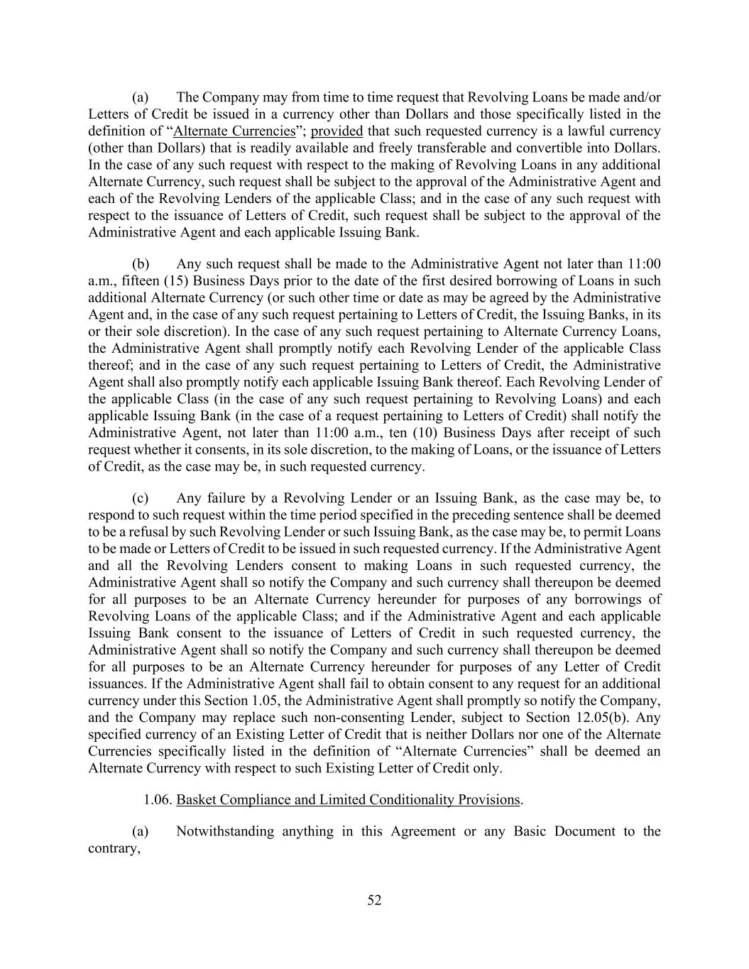 52 (a) The Company may from time to time request that Revolving Loans be made and/or Letters of Credit be issued in a currency other than Dollars and those specifically listed in the definition of “Alternate Currencies”; provided that such requested currency is a lawful currency (other than Dollars) that is readily available and freely transferable and convertible into Dollars. In the case of any such request with respect to the making of Revolving Loans in any additional Alternate Currency, such request shall be subject to the approval of the Administrative Agent and each of the Revolving Lenders of the applicable Class; and in the case of any such request with respect to the issuance of Letters of Credit, such request shall be subject to the approval of the Administrative Agent and each applicable Issuing Bank. (b) Any such request shall be made to the Administrative Agent not later than 11:00 a.m., fifteen (15) Business Days prior to the date of the first desired borrowing of Loans in such additional Alternate Currency (or such other time or date as may be agreed by the Administrative Agent and, in the case of any such request pertaining to Letters of Credit, the Issuing Banks, in its or their sole discretion). In the case of any such request pertaining to Alternate Currency Loans, the Administrative Agent shall promptly notify each Revolving Lender of the applicable Class thereof; and in the case of any such request pertaining to Letters of Credit, the Administrative Agent shall also promptly notify each applicable Issuing Bank thereof. Each Revolving Lender of the applicable Class (in the case of any such request pertaining to Revolving Loans) and each applicable Issuing Bank (in the case of a request pertaining to Letters of Credit) shall notify the Administrative Agent, not later than 11:00 a.m., ten (10) Business Days after receipt of such request whether it consents, in its sole discretion, to the making of Loans, or the issuance of Letters of Credit, as the case may be, in such requested currency. (c) Any failure by a Revolving Lender or an Issuing Bank, as the case may be, to respond to such request within the time period specified in the preceding sentence shall be deemed to be a refusal by such Revolving Lender or such Issuing Bank, as the case may be, to permit Loans to be made or Letters of Credit to be issued in such requested currency. If the Administrative Agent and all the Revolving Lenders consent to making Loans in such requested currency, the Administrative Agent shall so notify the Company and such currency shall thereupon be deemed for all purposes to be an Alternate Currency hereunder for purposes of any borrowings of Revolving Loans of the applicable Class; and if the Administrative Agent and each applicable Issuing Bank consent to the issuance of Letters of Credit in such requested currency, the Administrative Agent shall so notify the Company and such currency shall thereupon be deemed for all purposes to be an Alternate Currency hereunder for purposes of any Letter of Credit issuances. If the Administrative Agent shall fail to obtain consent to any request for an additional currency under this Section 1.05, the Administrative Agent shall promptly so notify the Company, and the Company may replace such non-consenting Lender, subject to Section 12.05(b). Any specified currency of an Existing Letter of Credit that is neither Dollars nor one of the Alternate Currencies specifically listed in the definition of “Alternate Currencies” shall be deemed an Alternate Currency with respect to such Existing Letter of Credit only. 1.06. Basket Compliance and Limited Conditionality Provisions. (a) Notwithstanding anything in this Agreement or any Basic Document to the contrary,