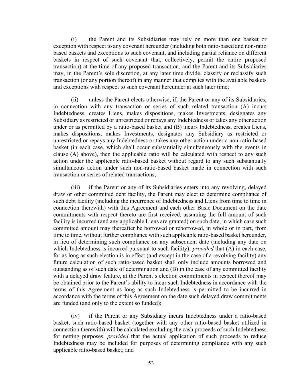 53 (i) the Parent and its Subsidiaries may rely on more than one basket or exception with respect to any covenant hereunder (including both ratio-based and non-ratio based baskets and exceptions to such covenant, and including partial reliance on different baskets in respect of such covenant that, collectively, permit the entire proposed transaction) at the time of any proposed transaction, and the Parent and its Subsidiaries may, in the Parent’s sole discretion, at any later time divide, classify or reclassify such transaction (or any portion thereof) in any manner that complies with the available baskets and exceptions with respect to such covenant hereunder at such later time; (ii) unless the Parent elects otherwise, if, the Parent or any of its Subsidiaries, in connection with any transaction or series of such related transaction (A) incurs Indebtedness, creates Liens, makes dispositions, makes Investments, designates any Subsidiary as restricted or unrestricted or repays any Indebtedness or takes any other action under or as permitted by a ratio-based basket and (B) incurs Indebtedness, creates Liens, makes dispositions, makes Investments, designates any Subsidiary as restricted or unrestricted or repays any Indebtedness or takes any other action under a non-ratio-based basket (in each case, which shall occur substantially simultaneously with the events in clause (A) above), then the applicable ratio will be calculated with respect to any such action under the applicable ratio-based basket without regard to any such substantially simultaneous action under such non-ratio-based basket made in connection with such transaction or series of related transactions; (iii) if the Parent or any of its Subsidiaries enters into any revolving, delayed draw or other committed debt facility, the Parent may elect to determine compliance of such debt facility (including the incurrence of Indebtedness and Liens from time to time in connection therewith) with this Agreement and each other Basic Document on the date commitments with respect thereto are first received, assuming the full amount of such facility is incurred (and any applicable Liens are granted) on such date, in which case such committed amount may thereafter be borrowed or reborrowed, in whole or in part, from time to time, without further compliance with such applicable ratio-based basket hereunder, in lieu of determining such compliance on any subsequent date (including any date on which Indebtedness is incurred pursuant to such facility); provided that (A) in each case, for as long as such election is in effect (and except in the case of a revolving facility) any future calculation of such ratio-based basket shall only include amounts borrowed and outstanding as of such date of determination and (B) in the case of any committed facility with a delayed draw feature, at the Parent’s election commitments in respect thereof may be obtained prior to the Parent’s ability to incur such Indebtedness in accordance with the terms of this Agreement as long as such Indebtedness is permitted to be incurred in accordance with the terms of this Agreement on the date such delayed draw commitments are funded (and only to the extent so funded); (iv) if the Parent or any Subsidiary incurs Indebtedness under a ratio-based basket, such ratio-based basket (together with any other ratio-based basket utilized in connection therewith) will be calculated excluding the cash proceeds of such Indebtedness for netting purposes, provided that the actual application of such proceeds to reduce Indebtedness may be included for purposes of determining compliance with any such applicable ratio-based basket; and