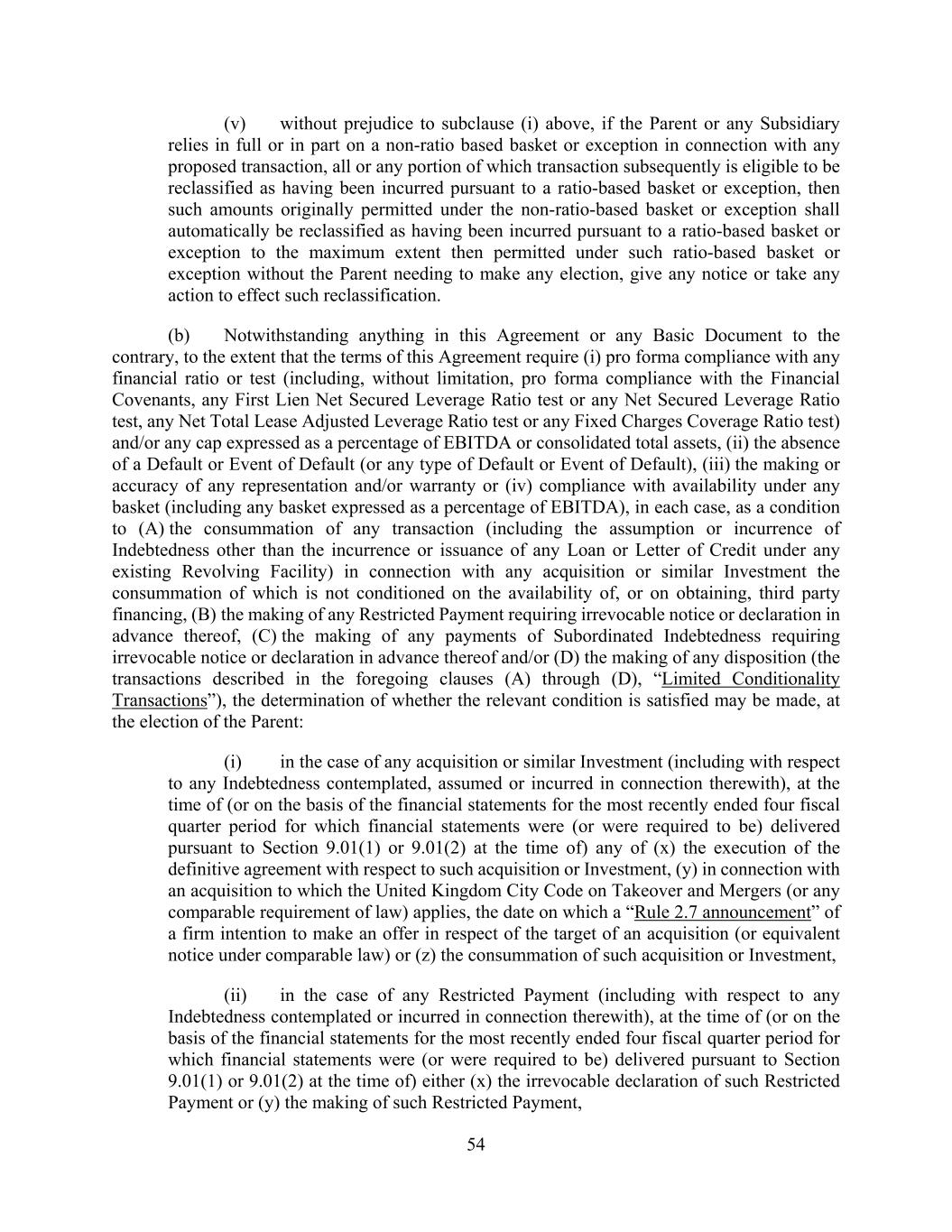 54 (v) without prejudice to subclause (i) above, if the Parent or any Subsidiary relies in full or in part on a non-ratio based basket or exception in connection with any proposed transaction, all or any portion of which transaction subsequently is eligible to be reclassified as having been incurred pursuant to a ratio-based basket or exception, then such amounts originally permitted under the non-ratio-based basket or exception shall automatically be reclassified as having been incurred pursuant to a ratio-based basket or exception to the maximum extent then permitted under such ratio-based basket or exception without the Parent needing to make any election, give any notice or take any action to effect such reclassification. (b) Notwithstanding anything in this Agreement or any Basic Document to the contrary, to the extent that the terms of this Agreement require (i) pro forma compliance with any financial ratio or test (including, without limitation, pro forma compliance with the Financial Covenants, any First Lien Net Secured Leverage Ratio test or any Net Secured Leverage Ratio test, any Net Total Lease Adjusted Leverage Ratio test or any Fixed Charges Coverage Ratio test) and/or any cap expressed as a percentage of EBITDA or consolidated total assets, (ii) the absence of a Default or Event of Default (or any type of Default or Event of Default), (iii) the making or accuracy of any representation and/or warranty or (iv) compliance with availability under any basket (including any basket expressed as a percentage of EBITDA), in each case, as a condition to (A) the consummation of any transaction (including the assumption or incurrence of Indebtedness other than the incurrence or issuance of any Loan or Letter of Credit under any existing Revolving Facility) in connection with any acquisition or similar Investment the consummation of which is not conditioned on the availability of, or on obtaining, third party financing, (B) the making of any Restricted Payment requiring irrevocable notice or declaration in advance thereof, (C) the making of any payments of Subordinated Indebtedness requiring irrevocable notice or declaration in advance thereof and/or (D) the making of any disposition (the transactions described in the foregoing clauses (A) through (D), “Limited Conditionality Transactions”), the determination of whether the relevant condition is satisfied may be made, at the election of the Parent: (i) in the case of any acquisition or similar Investment (including with respect to any Indebtedness contemplated, assumed or incurred in connection therewith), at the time of (or on the basis of the financial statements for the most recently ended four fiscal quarter period for which financial statements were (or were required to be) delivered pursuant to Section 9.01(1) or 9.01(2) at the time of) any of (x) the execution of the definitive agreement with respect to such acquisition or Investment, (y) in connection with an acquisition to which the United Kingdom City Code on Takeover and Mergers (or any comparable requirement of law) applies, the date on which a “Rule 2.7 announcement” of a firm intention to make an offer in respect of the target of an acquisition (or equivalent notice under comparable law) or (z) the consummation of such acquisition or Investment, (ii) in the case of any Restricted Payment (including with respect to any Indebtedness contemplated or incurred in connection therewith), at the time of (or on the basis of the financial statements for the most recently ended four fiscal quarter period for which financial statements were (or were required to be) delivered pursuant to Section 9.01(1) or 9.01(2) at the time of) either (x) the irrevocable declaration of such Restricted Payment or (y) the making of such Restricted Payment,