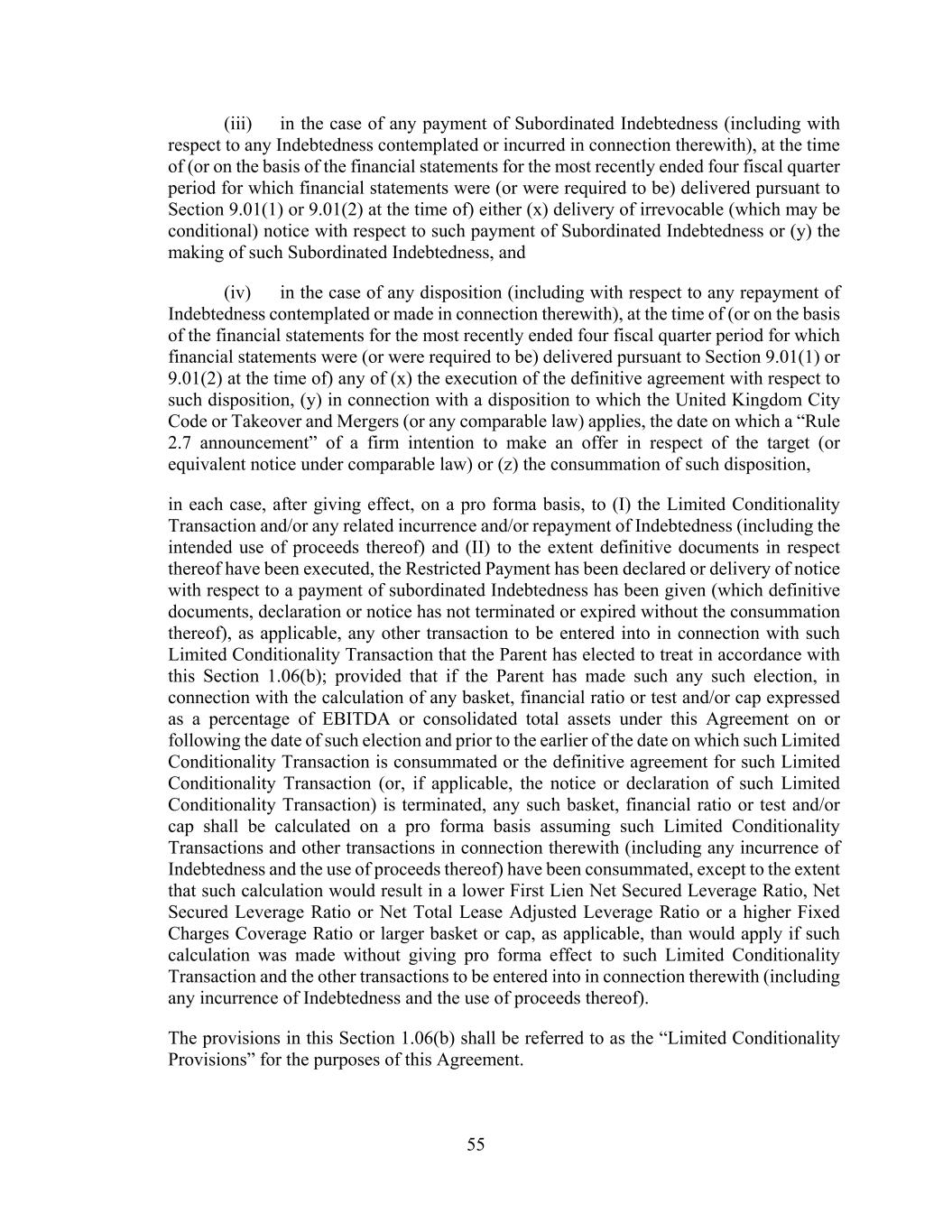 55 (iii) in the case of any payment of Subordinated Indebtedness (including with respect to any Indebtedness contemplated or incurred in connection therewith), at the time of (or on the basis of the financial statements for the most recently ended four fiscal quarter period for which financial statements were (or were required to be) delivered pursuant to Section 9.01(1) or 9.01(2) at the time of) either (x) delivery of irrevocable (which may be conditional) notice with respect to such payment of Subordinated Indebtedness or (y) the making of such Subordinated Indebtedness, and (iv) in the case of any disposition (including with respect to any repayment of Indebtedness contemplated or made in connection therewith), at the time of (or on the basis of the financial statements for the most recently ended four fiscal quarter period for which financial statements were (or were required to be) delivered pursuant to Section 9.01(1) or 9.01(2) at the time of) any of (x) the execution of the definitive agreement with respect to such disposition, (y) in connection with a disposition to which the United Kingdom City Code or Takeover and Mergers (or any comparable law) applies, the date on which a “Rule 2.7 announcement” of a firm intention to make an offer in respect of the target (or equivalent notice under comparable law) or (z) the consummation of such disposition, in each case, after giving effect, on a pro forma basis, to (I) the Limited Conditionality Transaction and/or any related incurrence and/or repayment of Indebtedness (including the intended use of proceeds thereof) and (II) to the extent definitive documents in respect thereof have been executed, the Restricted Payment has been declared or delivery of notice with respect to a payment of subordinated Indebtedness has been given (which definitive documents, declaration or notice has not terminated or expired without the consummation thereof), as applicable, any other transaction to be entered into in connection with such Limited Conditionality Transaction that the Parent has elected to treat in accordance with this Section 1.06(b); provided that if the Parent has made such any such election, in connection with the calculation of any basket, financial ratio or test and/or cap expressed as a percentage of EBITDA or consolidated total assets under this Agreement on or following the date of such election and prior to the earlier of the date on which such Limited Conditionality Transaction is consummated or the definitive agreement for such Limited Conditionality Transaction (or, if applicable, the notice or declaration of such Limited Conditionality Transaction) is terminated, any such basket, financial ratio or test and/or cap shall be calculated on a pro forma basis assuming such Limited Conditionality Transactions and other transactions in connection therewith (including any incurrence of Indebtedness and the use of proceeds thereof) have been consummated, except to the extent that such calculation would result in a lower First Lien Net Secured Leverage Ratio, Net Secured Leverage Ratio or Net Total Lease Adjusted Leverage Ratio or a higher Fixed Charges Coverage Ratio or larger basket or cap, as applicable, than would apply if such calculation was made without giving pro forma effect to such Limited Conditionality Transaction and the other transactions to be entered into in connection therewith (including any incurrence of Indebtedness and the use of proceeds thereof). The provisions in this Section 1.06(b) shall be referred to as the “Limited Conditionality Provisions” for the purposes of this Agreement.