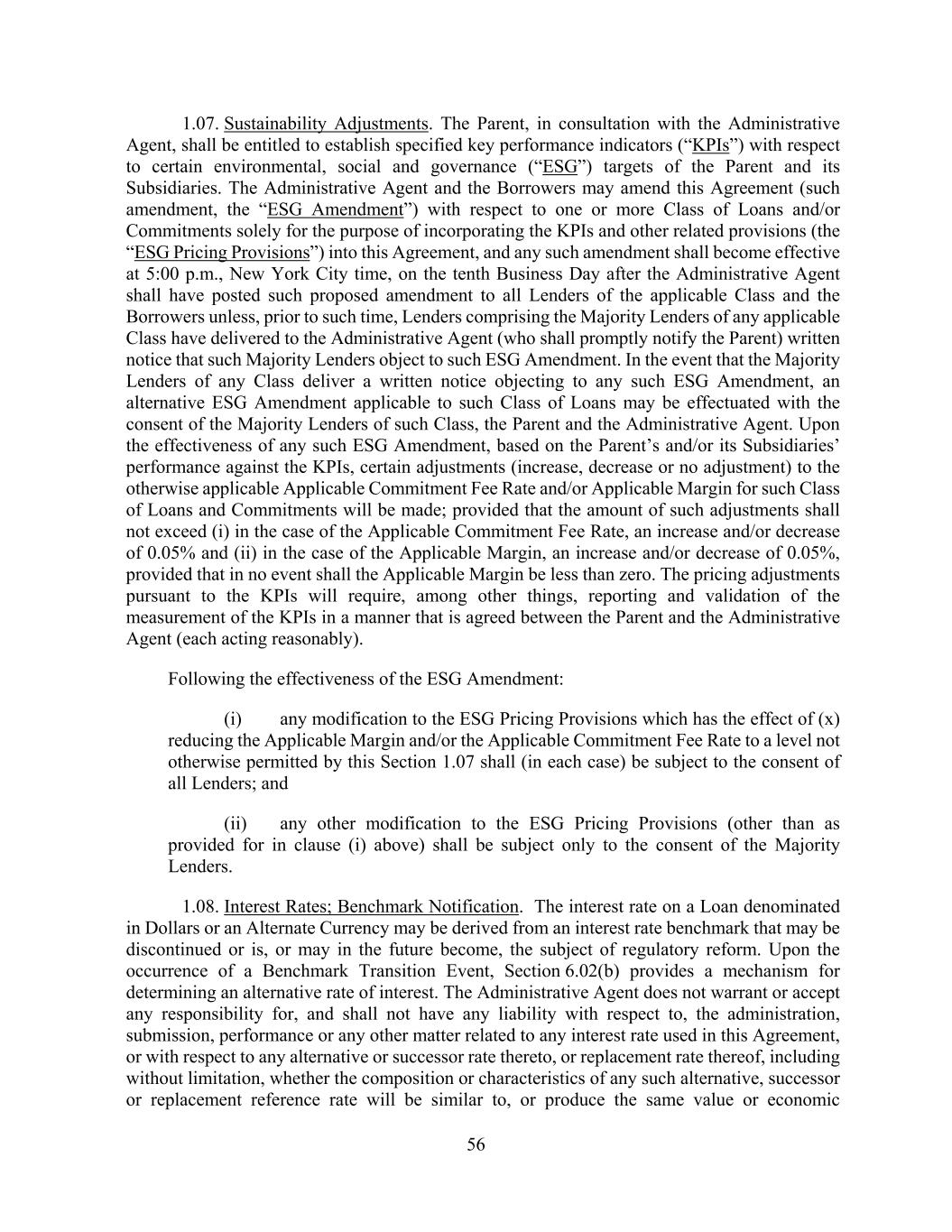 56 1.07. Sustainability Adjustments. The Parent, in consultation with the Administrative Agent, shall be entitled to establish specified key performance indicators (“KPIs”) with respect to certain environmental, social and governance (“ESG”) targets of the Parent and its Subsidiaries. The Administrative Agent and the Borrowers may amend this Agreement (such amendment, the “ESG Amendment”) with respect to one or more Class of Loans and/or Commitments solely for the purpose of incorporating the KPIs and other related provisions (the “ESG Pricing Provisions”) into this Agreement, and any such amendment shall become effective at 5:00 p.m., New York City time, on the tenth Business Day after the Administrative Agent shall have posted such proposed amendment to all Lenders of the applicable Class and the Borrowers unless, prior to such time, Lenders comprising the Majority Lenders of any applicable Class have delivered to the Administrative Agent (who shall promptly notify the Parent) written notice that such Majority Lenders object to such ESG Amendment. In the event that the Majority Lenders of any Class deliver a written notice objecting to any such ESG Amendment, an alternative ESG Amendment applicable to such Class of Loans may be effectuated with the consent of the Majority Lenders of such Class, the Parent and the Administrative Agent. Upon the effectiveness of any such ESG Amendment, based on the Parent’s and/or its Subsidiaries’ performance against the KPIs, certain adjustments (increase, decrease or no adjustment) to the otherwise applicable Applicable Commitment Fee Rate and/or Applicable Margin for such Class of Loans and Commitments will be made; provided that the amount of such adjustments shall not exceed (i) in the case of the Applicable Commitment Fee Rate, an increase and/or decrease of 0.05% and (ii) in the case of the Applicable Margin, an increase and/or decrease of 0.05%, provided that in no event shall the Applicable Margin be less than zero. The pricing adjustments pursuant to the KPIs will require, among other things, reporting and validation of the measurement of the KPIs in a manner that is agreed between the Parent and the Administrative Agent (each acting reasonably). Following the effectiveness of the ESG Amendment: (i) any modification to the ESG Pricing Provisions which has the effect of (x) reducing the Applicable Margin and/or the Applicable Commitment Fee Rate to a level not otherwise permitted by this Section 1.07 shall (in each case) be subject to the consent of all Lenders; and (ii) any other modification to the ESG Pricing Provisions (other than as provided for in clause (i) above) shall be subject only to the consent of the Majority Lenders. 1.08. Interest Rates; Benchmark Notification. The interest rate on a Loan denominated in Dollars or an Alternate Currency may be derived from an interest rate benchmark that may be discontinued or is, or may in the future become, the subject of regulatory reform. Upon the occurrence of a Benchmark Transition Event, Section 6.02(b) provides a mechanism for determining an alternative rate of interest. The Administrative Agent does not warrant or accept any responsibility for, and shall not have any liability with respect to, the administration, submission, performance or any other matter related to any interest rate used in this Agreement, or with respect to any alternative or successor rate thereto, or replacement rate thereof, including without limitation, whether the composition or characteristics of any such alternative, successor or replacement reference rate will be similar to, or produce the same value or economic