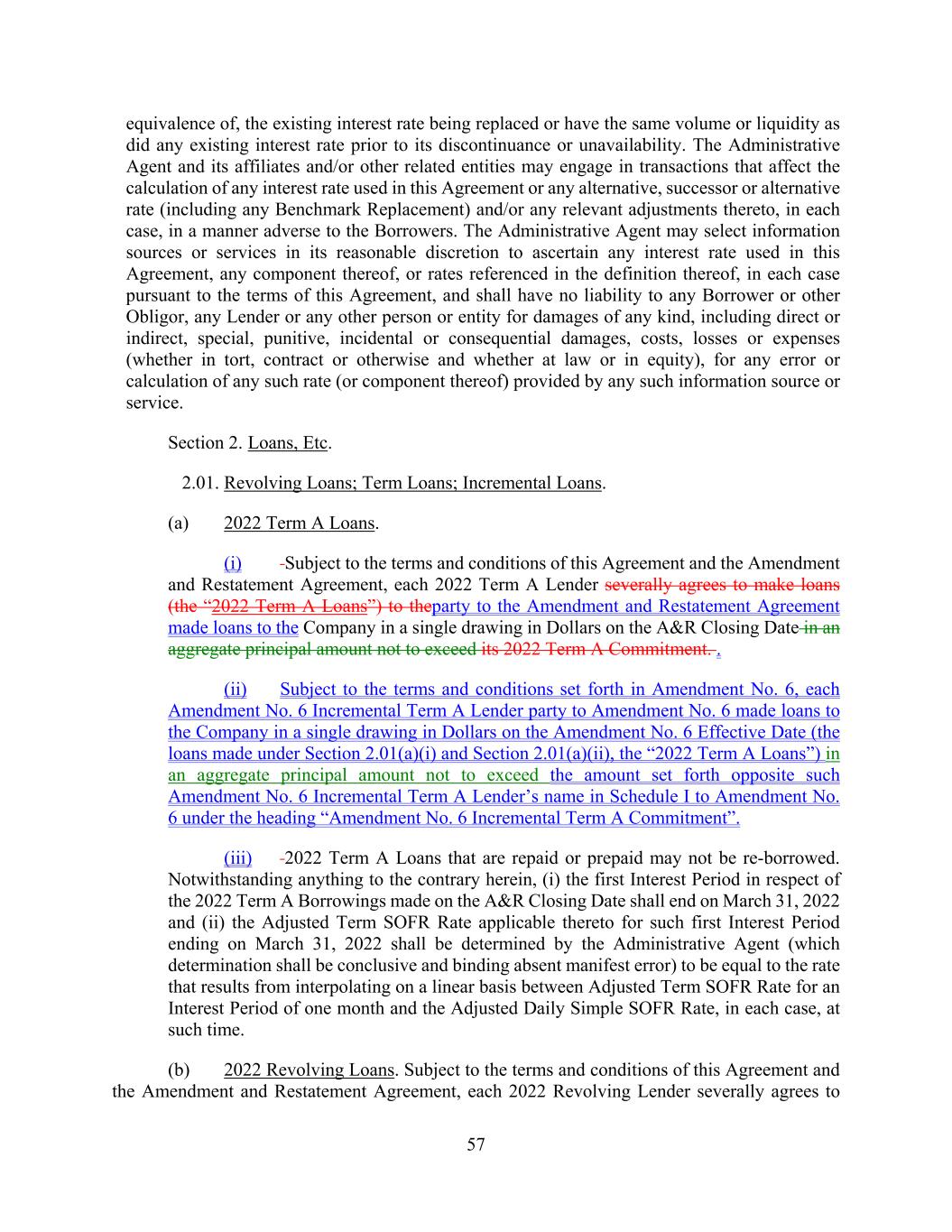 57 equivalence of, the existing interest rate being replaced or have the same volume or liquidity as did any existing interest rate prior to its discontinuance or unavailability. The Administrative Agent and its affiliates and/or other related entities may engage in transactions that affect the calculation of any interest rate used in this Agreement or any alternative, successor or alternative rate (including any Benchmark Replacement) and/or any relevant adjustments thereto, in each case, in a manner adverse to the Borrowers. The Administrative Agent may select information sources or services in its reasonable discretion to ascertain any interest rate used in this Agreement, any component thereof, or rates referenced in the definition thereof, in each case pursuant to the terms of this Agreement, and shall have no liability to any Borrower or other Obligor, any Lender or any other person or entity for damages of any kind, including direct or indirect, special, punitive, incidental or consequential damages, costs, losses or expenses (whether in tort, contract or otherwise and whether at law or in equity), for any error or calculation of any such rate (or component thereof) provided by any such information source or service. Section 2. Loans, Etc. 2.01. Revolving Loans; Term Loans; Incremental Loans. (a) 2022 Term A Loans. (i) Subject to the terms and conditions of this Agreement and the Amendment and Restatement Agreement, each 2022 Term A Lender severally agrees to make loans (the “2022 Term A Loans”) to theparty to the Amendment and Restatement Agreement made loans to the Company in a single drawing in Dollars on the A&R Closing Date in an aggregate principal amount not to exceed its 2022 Term A Commitment. . (ii) Subject to the terms and conditions set forth in Amendment No. 6, each Amendment No. 6 Incremental Term A Lender party to Amendment No. 6 made loans to the Company in a single drawing in Dollars on the Amendment No. 6 Effective Date (the loans made under Section 2.01(a)(i) and Section 2.01(a)(ii), the “2022 Term A Loans”) in an aggregate principal amount not to exceed the amount set forth opposite such Amendment No. 6 Incremental Term A Lender’s name in Schedule I to Amendment No. 6 under the heading “Amendment No. 6 Incremental Term A Commitment”. (iii) 2022 Term A Loans that are repaid or prepaid may not be re-borrowed. Notwithstanding anything to the contrary herein, (i) the first Interest Period in respect of the 2022 Term A Borrowings made on the A&R Closing Date shall end on March 31, 2022 and (ii) the Adjusted Term SOFR Rate applicable thereto for such first Interest Period ending on March 31, 2022 shall be determined by the Administrative Agent (which determination shall be conclusive and binding absent manifest error) to be equal to the rate that results from interpolating on a linear basis between Adjusted Term SOFR Rate for an Interest Period of one month and the Adjusted Daily Simple SOFR Rate, in each case, at such time. (b) 2022 Revolving Loans. Subject to the terms and conditions of this Agreement and the Amendment and Restatement Agreement, each 2022 Revolving Lender severally agrees to