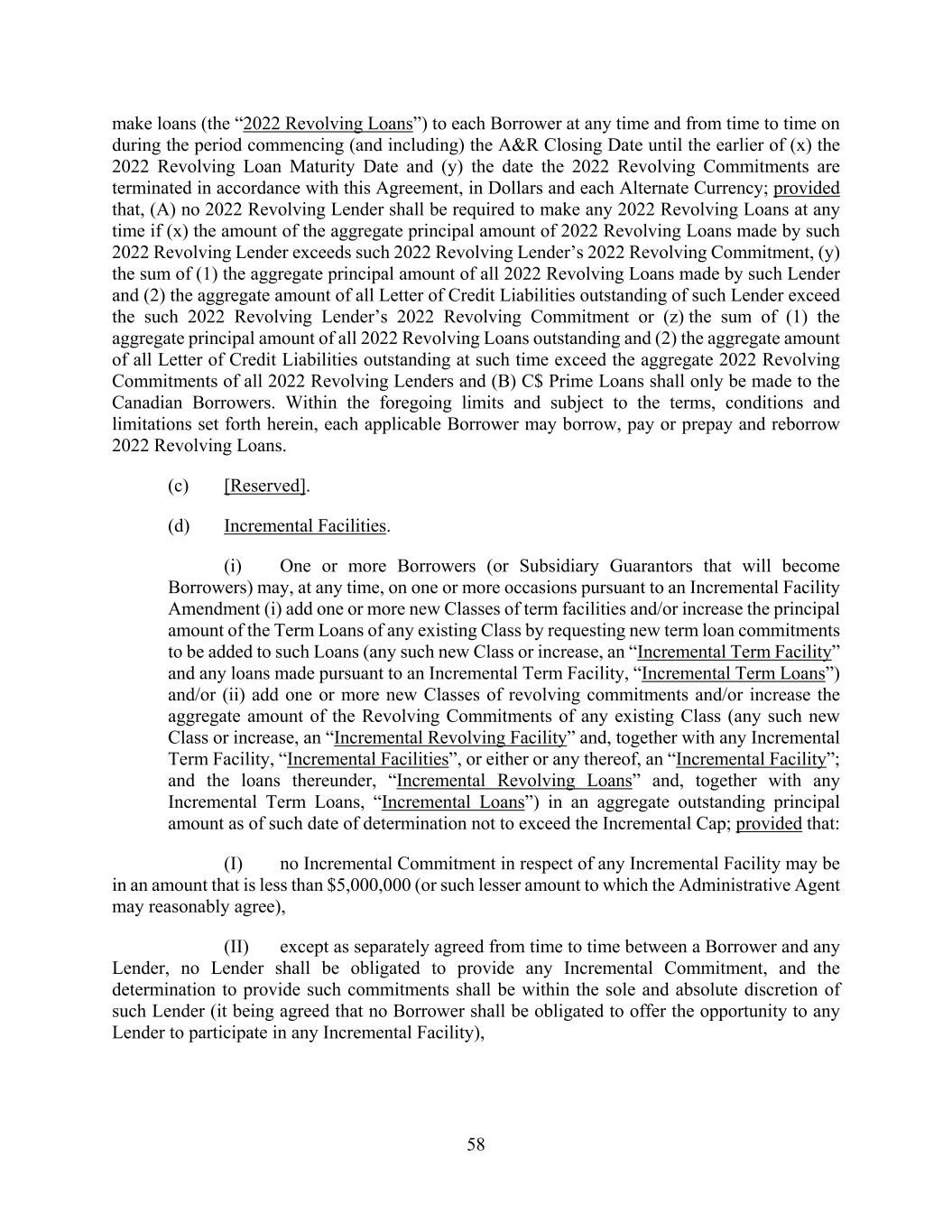 58 make loans (the “2022 Revolving Loans”) to each Borrower at any time and from time to time on during the period commencing (and including) the A&R Closing Date until the earlier of (x) the 2022 Revolving Loan Maturity Date and (y) the date the 2022 Revolving Commitments are terminated in accordance with this Agreement, in Dollars and each Alternate Currency; provided that, (A) no 2022 Revolving Lender shall be required to make any 2022 Revolving Loans at any time if (x) the amount of the aggregate principal amount of 2022 Revolving Loans made by such 2022 Revolving Lender exceeds such 2022 Revolving Lender’s 2022 Revolving Commitment, (y) the sum of (1) the aggregate principal amount of all 2022 Revolving Loans made by such Lender and (2) the aggregate amount of all Letter of Credit Liabilities outstanding of such Lender exceed the such 2022 Revolving Lender’s 2022 Revolving Commitment or (z) the sum of (1) the aggregate principal amount of all 2022 Revolving Loans outstanding and (2) the aggregate amount of all Letter of Credit Liabilities outstanding at such time exceed the aggregate 2022 Revolving Commitments of all 2022 Revolving Lenders and (B) C$ Prime Loans shall only be made to the Canadian Borrowers. Within the foregoing limits and subject to the terms, conditions and limitations set forth herein, each applicable Borrower may borrow, pay or prepay and reborrow 2022 Revolving Loans. (c) [Reserved]. (d) Incremental Facilities. (i) One or more Borrowers (or Subsidiary Guarantors that will become Borrowers) may, at any time, on one or more occasions pursuant to an Incremental Facility Amendment (i) add one or more new Classes of term facilities and/or increase the principal amount of the Term Loans of any existing Class by requesting new term loan commitments to be added to such Loans (any such new Class or increase, an “Incremental Term Facility” and any loans made pursuant to an Incremental Term Facility, “Incremental Term Loans”) and/or (ii) add one or more new Classes of revolving commitments and/or increase the aggregate amount of the Revolving Commitments of any existing Class (any such new Class or increase, an “Incremental Revolving Facility” and, together with any Incremental Term Facility, “Incremental Facilities”, or either or any thereof, an “Incremental Facility”; and the loans thereunder, “Incremental Revolving Loans” and, together with any Incremental Term Loans, “Incremental Loans”) in an aggregate outstanding principal amount as of such date of determination not to exceed the Incremental Cap; provided that: (I) no Incremental Commitment in respect of any Incremental Facility may be in an amount that is less than $5,000,000 (or such lesser amount to which the Administrative Agent may reasonably agree), (II) except as separately agreed from time to time between a Borrower and any Lender, no Lender shall be obligated to provide any Incremental Commitment, and the determination to provide such commitments shall be within the sole and absolute discretion of such Lender (it being agreed that no Borrower shall be obligated to offer the opportunity to any Lender to participate in any Incremental Facility),