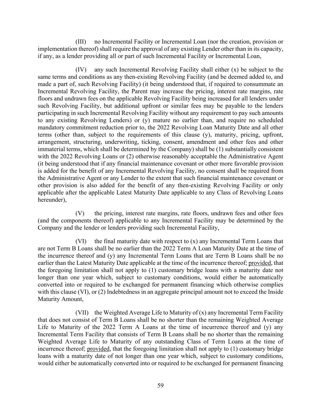 59 (III) no Incremental Facility or Incremental Loan (nor the creation, provision or implementation thereof) shall require the approval of any existing Lender other than in its capacity, if any, as a lender providing all or part of such Incremental Facility or Incremental Loan, (IV) any such Incremental Revolving Facility shall either (x) be subject to the same terms and conditions as any then-existing Revolving Facility (and be deemed added to, and made a part of, such Revolving Facility) (it being understood that, if required to consummate an Incremental Revolving Facility, the Parent may increase the pricing, interest rate margins, rate floors and undrawn fees on the applicable Revolving Facility being increased for all lenders under such Revolving Facility, but additional upfront or similar fees may be payable to the lenders participating in such Incremental Revolving Facility without any requirement to pay such amounts to any existing Revolving Lenders) or (y) mature no earlier than, and require no scheduled mandatory commitment reduction prior to, the 2022 Revolving Loan Maturity Date and all other terms (other than, subject to the requirements of this clause (y), maturity, pricing, upfront, arrangement, structuring, underwriting, ticking, consent, amendment and other fees and other immaterial terms, which shall be determined by the Company) shall be (1) substantially consistent with the 2022 Revolving Loans or (2) otherwise reasonably acceptable the Administrative Agent (it being understood that if any financial maintenance covenant or other more favorable provision is added for the benefit of any Incremental Revolving Facility, no consent shall be required from the Administrative Agent or any Lender to the extent that such financial maintenance covenant or other provision is also added for the benefit of any then-existing Revolving Facility or only applicable after the applicable Latest Maturity Date applicable to any Class of Revolving Loans hereunder), (V) the pricing, interest rate margins, rate floors, undrawn fees and other fees (and the components thereof) applicable to any Incremental Facility may be determined by the Company and the lender or lenders providing such Incremental Facility, (VI) the final maturity date with respect to (x) any Incremental Term Loans that are not Term B Loans shall be no earlier than the 2022 Term A Loan Maturity Date at the time of the incurrence thereof and (y) any Incremental Term Loans that are Term B Loans shall be no earlier than the Latest Maturity Date applicable at the time of the incurrence thereof; provided, that the foregoing limitation shall not apply to (1) customary bridge loans with a maturity date not longer than one year which, subject to customary conditions, would either be automatically converted into or required to be exchanged for permanent financing which otherwise complies with this clause (VI), or (2) Indebtedness in an aggregate principal amount not to exceed the Inside Maturity Amount, (VII) the Weighted Average Life to Maturity of (x) any Incremental Term Facility that does not consist of Term B Loans shall be no shorter than the remaining Weighted Average Life to Maturity of the 2022 Term A Loans at the time of incurrence thereof and (y) any Incremental Term Facility that consists of Term B Loans shall be no shorter than the remaining Weighted Average Life to Maturity of any outstanding Class of Term Loans at the time of incurrence thereof; provided, that the foregoing limitation shall not apply to (1) customary bridge loans with a maturity date of not longer than one year which, subject to customary conditions, would either be automatically converted into or required to be exchanged for permanent financing