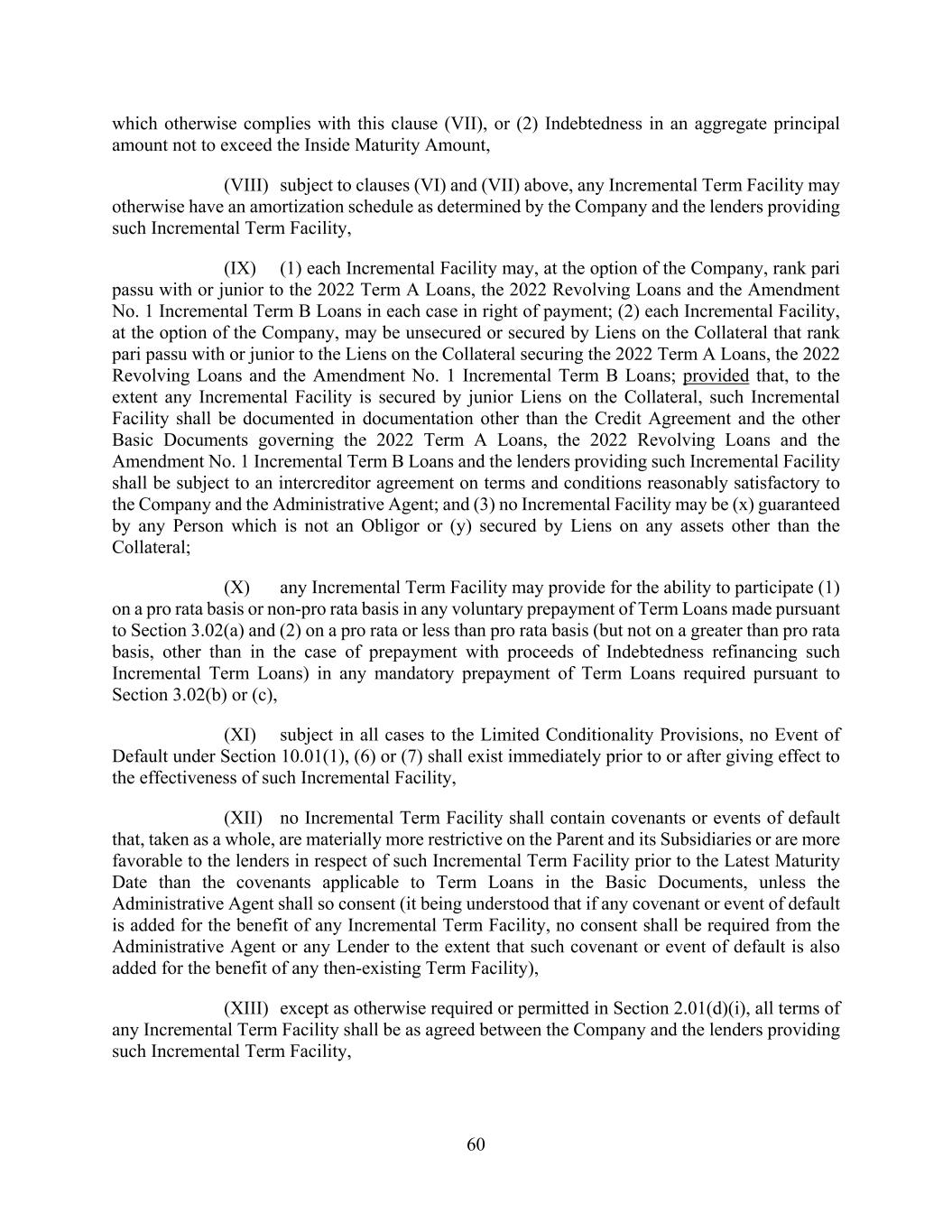 60 which otherwise complies with this clause (VII), or (2) Indebtedness in an aggregate principal amount not to exceed the Inside Maturity Amount, (VIII) subject to clauses (VI) and (VII) above, any Incremental Term Facility may otherwise have an amortization schedule as determined by the Company and the lenders providing such Incremental Term Facility, (IX) (1) each Incremental Facility may, at the option of the Company, rank pari passu with or junior to the 2022 Term A Loans, the 2022 Revolving Loans and the Amendment No. 1 Incremental Term B Loans in each case in right of payment; (2) each Incremental Facility, at the option of the Company, may be unsecured or secured by Liens on the Collateral that rank pari passu with or junior to the Liens on the Collateral securing the 2022 Term A Loans, the 2022 Revolving Loans and the Amendment No. 1 Incremental Term B Loans; provided that, to the extent any Incremental Facility is secured by junior Liens on the Collateral, such Incremental Facility shall be documented in documentation other than the Credit Agreement and the other Basic Documents governing the 2022 Term A Loans, the 2022 Revolving Loans and the Amendment No. 1 Incremental Term B Loans and the lenders providing such Incremental Facility shall be subject to an intercreditor agreement on terms and conditions reasonably satisfactory to the Company and the Administrative Agent; and (3) no Incremental Facility may be (x) guaranteed by any Person which is not an Obligor or (y) secured by Liens on any assets other than the Collateral; (X) any Incremental Term Facility may provide for the ability to participate (1) on a pro rata basis or non-pro rata basis in any voluntary prepayment of Term Loans made pursuant to Section 3.02(a) and (2) on a pro rata or less than pro rata basis (but not on a greater than pro rata basis, other than in the case of prepayment with proceeds of Indebtedness refinancing such Incremental Term Loans) in any mandatory prepayment of Term Loans required pursuant to Section 3.02(b) or (c), (XI) subject in all cases to the Limited Conditionality Provisions, no Event of Default under Section 10.01(1), (6) or (7) shall exist immediately prior to or after giving effect to the effectiveness of such Incremental Facility, (XII) no Incremental Term Facility shall contain covenants or events of default that, taken as a whole, are materially more restrictive on the Parent and its Subsidiaries or are more favorable to the lenders in respect of such Incremental Term Facility prior to the Latest Maturity Date than the covenants applicable to Term Loans in the Basic Documents, unless the Administrative Agent shall so consent (it being understood that if any covenant or event of default is added for the benefit of any Incremental Term Facility, no consent shall be required from the Administrative Agent or any Lender to the extent that such covenant or event of default is also added for the benefit of any then-existing Term Facility), (XIII) except as otherwise required or permitted in Section 2.01(d)(i), all terms of any Incremental Term Facility shall be as agreed between the Company and the lenders providing such Incremental Term Facility,