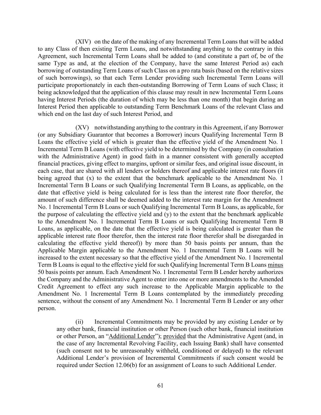 61 (XIV) on the date of the making of any Incremental Term Loans that will be added to any Class of then existing Term Loans, and notwithstanding anything to the contrary in this Agreement, such Incremental Term Loans shall be added to (and constitute a part of, be of the same Type as and, at the election of the Company, have the same Interest Period as) each borrowing of outstanding Term Loans of such Class on a pro rata basis (based on the relative sizes of such borrowings), so that each Term Lender providing such Incremental Term Loans will participate proportionately in each then-outstanding Borrowing of Term Loans of such Class; it being acknowledged that the application of this clause may result in new Incremental Term Loans having Interest Periods (the duration of which may be less than one month) that begin during an Interest Period then applicable to outstanding Term Benchmark Loans of the relevant Class and which end on the last day of such Interest Period, and (XV) notwithstanding anything to the contrary in this Agreement, if any Borrower (or any Subsidiary Guarantor that becomes a Borrower) incurs Qualifying Incremental Term B Loans the effective yield of which is greater than the effective yield of the Amendment No. 1 Incremental Term B Loans (with effective yield to be determined by the Company (in consultation with the Administrative Agent) in good faith in a manner consistent with generally accepted financial practices, giving effect to margins, upfront or similar fees, and original issue discount, in each case, that are shared with all lenders or holders thereof and applicable interest rate floors (it being agreed that (x) to the extent that the benchmark applicable to the Amendment No. 1 Incremental Term B Loans or such Qualifying Incremental Term B Loans, as applicable, on the date that effective yield is being calculated for is less than the interest rate floor therefor, the amount of such difference shall be deemed added to the interest rate margin for the Amendment No. 1 Incremental Term B Loans or such Qualifying Incremental Term B Loans, as applicable, for the purpose of calculating the effective yield and (y) to the extent that the benchmark applicable to the Amendment No. 1 Incremental Term B Loans or such Qualifying Incremental Term B Loans, as applicable, on the date that the effective yield is being calculated is greater than the applicable interest rate floor therefor, then the interest rate floor therefor shall be disregarded in calculating the effective yield thereof)) by more than 50 basis points per annum, than the Applicable Margin applicable to the Amendment No. 1 Incremental Term B Loans will be increased to the extent necessary so that the effective yield of the Amendment No. 1 Incremental Term B Loans is equal to the effective yield for such Qualifying Incremental Term B Loans minus 50 basis points per annum. Each Amendment No. 1 Incremental Term B Lender hereby authorizes the Company and the Administrative Agent to enter into one or more amendments to the Amended Credit Agreement to effect any such increase to the Applicable Margin applicable to the Amendment No. 1 Incremental Term B Loans contemplated by the immediately preceding sentence, without the consent of any Amendment No. 1 Incremental Term B Lender or any other person. (ii) Incremental Commitments may be provided by any existing Lender or by any other bank, financial institution or other Person (such other bank, financial institution or other Person, an “Additional Lender”); provided that the Administrative Agent (and, in the case of any Incremental Revolving Facility, each Issuing Bank) shall have consented (such consent not to be unreasonably withheld, conditioned or delayed) to the relevant Additional Lender’s provision of Incremental Commitments if such consent would be required under Section 12.06(b) for an assignment of Loans to such Additional Lender.