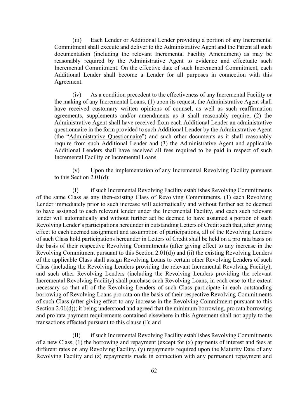 62 (iii) Each Lender or Additional Lender providing a portion of any Incremental Commitment shall execute and deliver to the Administrative Agent and the Parent all such documentation (including the relevant Incremental Facility Amendment) as may be reasonably required by the Administrative Agent to evidence and effectuate such Incremental Commitment. On the effective date of such Incremental Commitment, each Additional Lender shall become a Lender for all purposes in connection with this Agreement. (iv) As a condition precedent to the effectiveness of any Incremental Facility or the making of any Incremental Loans, (1) upon its request, the Administrative Agent shall have received customary written opinions of counsel, as well as such reaffirmation agreements, supplements and/or amendments as it shall reasonably require, (2) the Administrative Agent shall have received from each Additional Lender an administrative questionnaire in the form provided to such Additional Lender by the Administrative Agent (the “Administrative Questionnaire”) and such other documents as it shall reasonably require from such Additional Lender and (3) the Administrative Agent and applicable Additional Lenders shall have received all fees required to be paid in respect of such Incremental Facility or Incremental Loans. (v) Upon the implementation of any Incremental Revolving Facility pursuant to this Section 2.01(d): (I) if such Incremental Revolving Facility establishes Revolving Commitments of the same Class as any then-existing Class of Revolving Commitments, (1) each Revolving Lender immediately prior to such increase will automatically and without further act be deemed to have assigned to each relevant lender under the Incremental Facility, and each such relevant lender will automatically and without further act be deemed to have assumed a portion of such Revolving Lender’s participations hereunder in outstanding Letters of Credit such that, after giving effect to each deemed assignment and assumption of participations, all of the Revolving Lenders of such Class hold participations hereunder in Letters of Credit shall be held on a pro rata basis on the basis of their respective Revolving Commitments (after giving effect to any increase in the Revolving Commitment pursuant to this Section 2.01(d)) and (ii) the existing Revolving Lenders of the applicable Class shall assign Revolving Loans to certain other Revolving Lenders of such Class (including the Revolving Lenders providing the relevant Incremental Revolving Facility), and such other Revolving Lenders (including the Revolving Lenders providing the relevant Incremental Revolving Facility) shall purchase such Revolving Loans, in each case to the extent necessary so that all of the Revolving Lenders of such Class participate in each outstanding borrowing of Revolving Loans pro rata on the basis of their respective Revolving Commitments of such Class (after giving effect to any increase in the Revolving Commitment pursuant to this Section 2.01(d)); it being understood and agreed that the minimum borrowing, pro rata borrowing and pro rata payment requirements contained elsewhere in this Agreement shall not apply to the transactions effected pursuant to this clause (I); and (II) if such Incremental Revolving Facility establishes Revolving Commitments of a new Class, (1) the borrowing and repayment (except for (x) payments of interest and fees at different rates on any Revolving Facility, (y) repayments required upon the Maturity Date of any Revolving Facility and (z) repayments made in connection with any permanent repayment and