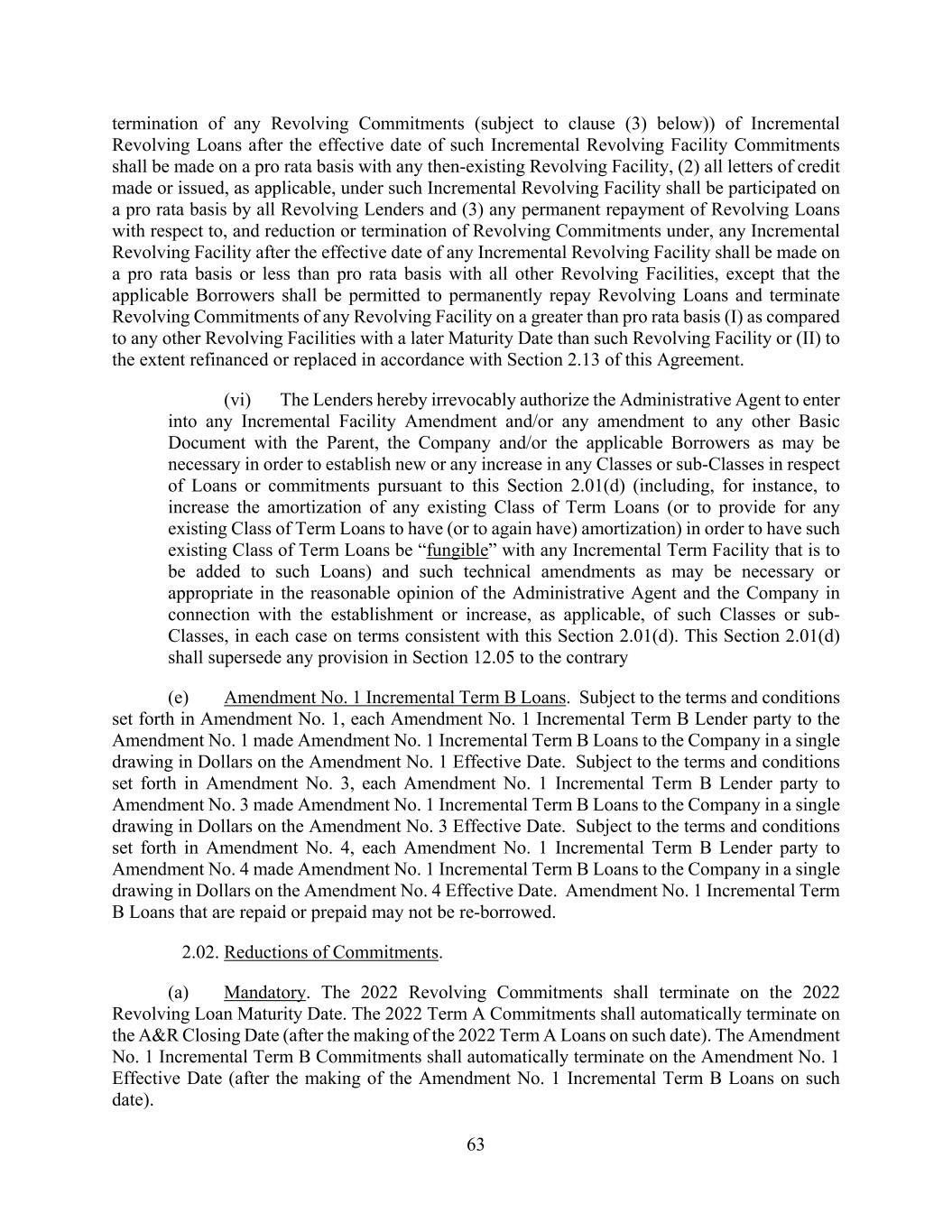 63 termination of any Revolving Commitments (subject to clause (3) below)) of Incremental Revolving Loans after the effective date of such Incremental Revolving Facility Commitments shall be made on a pro rata basis with any then-existing Revolving Facility, (2) all letters of credit made or issued, as applicable, under such Incremental Revolving Facility shall be participated on a pro rata basis by all Revolving Lenders and (3) any permanent repayment of Revolving Loans with respect to, and reduction or termination of Revolving Commitments under, any Incremental Revolving Facility after the effective date of any Incremental Revolving Facility shall be made on a pro rata basis or less than pro rata basis with all other Revolving Facilities, except that the applicable Borrowers shall be permitted to permanently repay Revolving Loans and terminate Revolving Commitments of any Revolving Facility on a greater than pro rata basis (I) as compared to any other Revolving Facilities with a later Maturity Date than such Revolving Facility or (II) to the extent refinanced or replaced in accordance with Section 2.13 of this Agreement. (vi) The Lenders hereby irrevocably authorize the Administrative Agent to enter into any Incremental Facility Amendment and/or any amendment to any other Basic Document with the Parent, the Company and/or the applicable Borrowers as may be necessary in order to establish new or any increase in any Classes or sub-Classes in respect of Loans or commitments pursuant to this Section 2.01(d) (including, for instance, to increase the amortization of any existing Class of Term Loans (or to provide for any existing Class of Term Loans to have (or to again have) amortization) in order to have such existing Class of Term Loans be “fungible” with any Incremental Term Facility that is to be added to such Loans) and such technical amendments as may be necessary or appropriate in the reasonable opinion of the Administrative Agent and the Company in connection with the establishment or increase, as applicable, of such Classes or sub- Classes, in each case on terms consistent with this Section 2.01(d). This Section 2.01(d) shall supersede any provision in Section 12.05 to the contrary (e) Amendment No. 1 Incremental Term B Loans. Subject to the terms and conditions set forth in Amendment No. 1, each Amendment No. 1 Incremental Term B Lender party to the Amendment No. 1 made Amendment No. 1 Incremental Term B Loans to the Company in a single drawing in Dollars on the Amendment No. 1 Effective Date. Subject to the terms and conditions set forth in Amendment No. 3, each Amendment No. 1 Incremental Term B Lender party to Amendment No. 3 made Amendment No. 1 Incremental Term B Loans to the Company in a single drawing in Dollars on the Amendment No. 3 Effective Date. Subject to the terms and conditions set forth in Amendment No. 4, each Amendment No. 1 Incremental Term B Lender party to Amendment No. 4 made Amendment No. 1 Incremental Term B Loans to the Company in a single drawing in Dollars on the Amendment No. 4 Effective Date. Amendment No. 1 Incremental Term B Loans that are repaid or prepaid may not be re-borrowed. 2.02. Reductions of Commitments. (a) Mandatory. The 2022 Revolving Commitments shall terminate on the 2022 Revolving Loan Maturity Date. The 2022 Term A Commitments shall automatically terminate on the A&R Closing Date (after the making of the 2022 Term A Loans on such date). The Amendment No. 1 Incremental Term B Commitments shall automatically terminate on the Amendment No. 1 Effective Date (after the making of the Amendment No. 1 Incremental Term B Loans on such date).