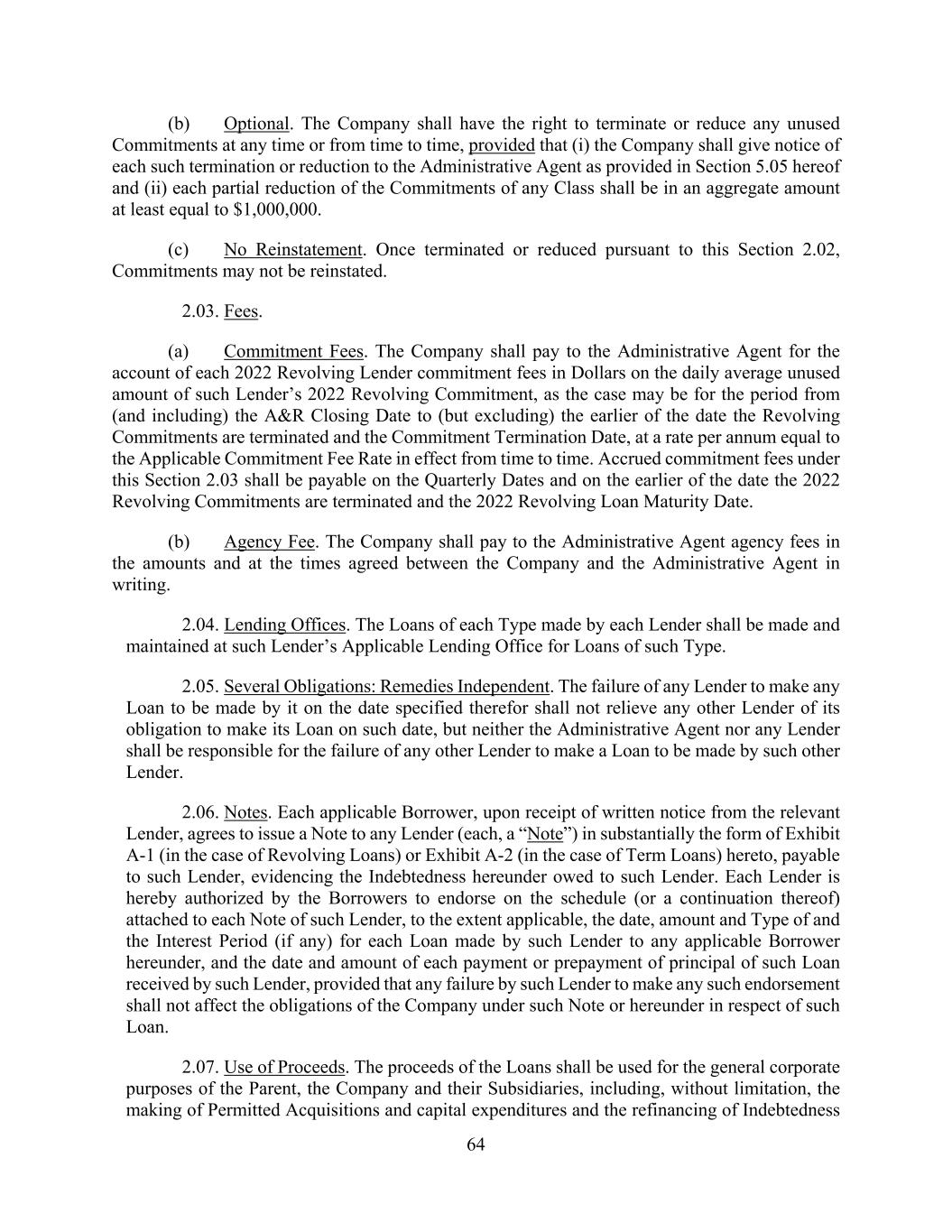 64 (b) Optional. The Company shall have the right to terminate or reduce any unused Commitments at any time or from time to time, provided that (i) the Company shall give notice of each such termination or reduction to the Administrative Agent as provided in Section 5.05 hereof and (ii) each partial reduction of the Commitments of any Class shall be in an aggregate amount at least equal to $1,000,000. (c) No Reinstatement. Once terminated or reduced pursuant to this Section 2.02, Commitments may not be reinstated. 2.03. Fees. (a) Commitment Fees. The Company shall pay to the Administrative Agent for the account of each 2022 Revolving Lender commitment fees in Dollars on the daily average unused amount of such Lender’s 2022 Revolving Commitment, as the case may be for the period from (and including) the A&R Closing Date to (but excluding) the earlier of the date the Revolving Commitments are terminated and the Commitment Termination Date, at a rate per annum equal to the Applicable Commitment Fee Rate in effect from time to time. Accrued commitment fees under this Section 2.03 shall be payable on the Quarterly Dates and on the earlier of the date the 2022 Revolving Commitments are terminated and the 2022 Revolving Loan Maturity Date. (b) Agency Fee. The Company shall pay to the Administrative Agent agency fees in the amounts and at the times agreed between the Company and the Administrative Agent in writing. 2.04. Lending Offices. The Loans of each Type made by each Lender shall be made and maintained at such Lender’s Applicable Lending Office for Loans of such Type. 2.05. Several Obligations: Remedies Independent. The failure of any Lender to make any Loan to be made by it on the date specified therefor shall not relieve any other Lender of its obligation to make its Loan on such date, but neither the Administrative Agent nor any Lender shall be responsible for the failure of any other Lender to make a Loan to be made by such other Lender. 2.06. Notes. Each applicable Borrower, upon receipt of written notice from the relevant Lender, agrees to issue a Note to any Lender (each, a “Note”) in substantially the form of Exhibit A-1 (in the case of Revolving Loans) or Exhibit A-2 (in the case of Term Loans) hereto, payable to such Lender, evidencing the Indebtedness hereunder owed to such Lender. Each Lender is hereby authorized by the Borrowers to endorse on the schedule (or a continuation thereof) attached to each Note of such Lender, to the extent applicable, the date, amount and Type of and the Interest Period (if any) for each Loan made by such Lender to any applicable Borrower hereunder, and the date and amount of each payment or prepayment of principal of such Loan received by such Lender, provided that any failure by such Lender to make any such endorsement shall not affect the obligations of the Company under such Note or hereunder in respect of such Loan. 2.07. Use of Proceeds. The proceeds of the Loans shall be used for the general corporate purposes of the Parent, the Company and their Subsidiaries, including, without limitation, the making of Permitted Acquisitions and capital expenditures and the refinancing of Indebtedness