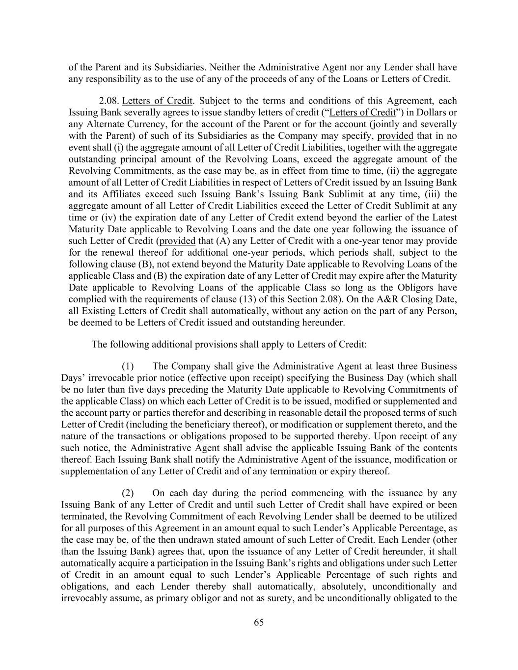 65 of the Parent and its Subsidiaries. Neither the Administrative Agent nor any Lender shall have any responsibility as to the use of any of the proceeds of any of the Loans or Letters of Credit. 2.08. Letters of Credit. Subject to the terms and conditions of this Agreement, each Issuing Bank severally agrees to issue standby letters of credit (“Letters of Credit”) in Dollars or any Alternate Currency, for the account of the Parent or for the account (jointly and severally with the Parent) of such of its Subsidiaries as the Company may specify, provided that in no event shall (i) the aggregate amount of all Letter of Credit Liabilities, together with the aggregate outstanding principal amount of the Revolving Loans, exceed the aggregate amount of the Revolving Commitments, as the case may be, as in effect from time to time, (ii) the aggregate amount of all Letter of Credit Liabilities in respect of Letters of Credit issued by an Issuing Bank and its Affiliates exceed such Issuing Bank’s Issuing Bank Sublimit at any time, (iii) the aggregate amount of all Letter of Credit Liabilities exceed the Letter of Credit Sublimit at any time or (iv) the expiration date of any Letter of Credit extend beyond the earlier of the Latest Maturity Date applicable to Revolving Loans and the date one year following the issuance of such Letter of Credit (provided that (A) any Letter of Credit with a one-year tenor may provide for the renewal thereof for additional one-year periods, which periods shall, subject to the following clause (B), not extend beyond the Maturity Date applicable to Revolving Loans of the applicable Class and (B) the expiration date of any Letter of Credit may expire after the Maturity Date applicable to Revolving Loans of the applicable Class so long as the Obligors have complied with the requirements of clause (13) of this Section 2.08). On the A&R Closing Date, all Existing Letters of Credit shall automatically, without any action on the part of any Person, be deemed to be Letters of Credit issued and outstanding hereunder. The following additional provisions shall apply to Letters of Credit: (1) The Company shall give the Administrative Agent at least three Business Days’ irrevocable prior notice (effective upon receipt) specifying the Business Day (which shall be no later than five days preceding the Maturity Date applicable to Revolving Commitments of the applicable Class) on which each Letter of Credit is to be issued, modified or supplemented and the account party or parties therefor and describing in reasonable detail the proposed terms of such Letter of Credit (including the beneficiary thereof), or modification or supplement thereto, and the nature of the transactions or obligations proposed to be supported thereby. Upon receipt of any such notice, the Administrative Agent shall advise the applicable Issuing Bank of the contents thereof. Each Issuing Bank shall notify the Administrative Agent of the issuance, modification or supplementation of any Letter of Credit and of any termination or expiry thereof. (2) On each day during the period commencing with the issuance by any Issuing Bank of any Letter of Credit and until such Letter of Credit shall have expired or been terminated, the Revolving Commitment of each Revolving Lender shall be deemed to be utilized for all purposes of this Agreement in an amount equal to such Lender’s Applicable Percentage, as the case may be, of the then undrawn stated amount of such Letter of Credit. Each Lender (other than the Issuing Bank) agrees that, upon the issuance of any Letter of Credit hereunder, it shall automatically acquire a participation in the Issuing Bank’s rights and obligations under such Letter of Credit in an amount equal to such Lender’s Applicable Percentage of such rights and obligations, and each Lender thereby shall automatically, absolutely, unconditionally and irrevocably assume, as primary obligor and not as surety, and be unconditionally obligated to the
