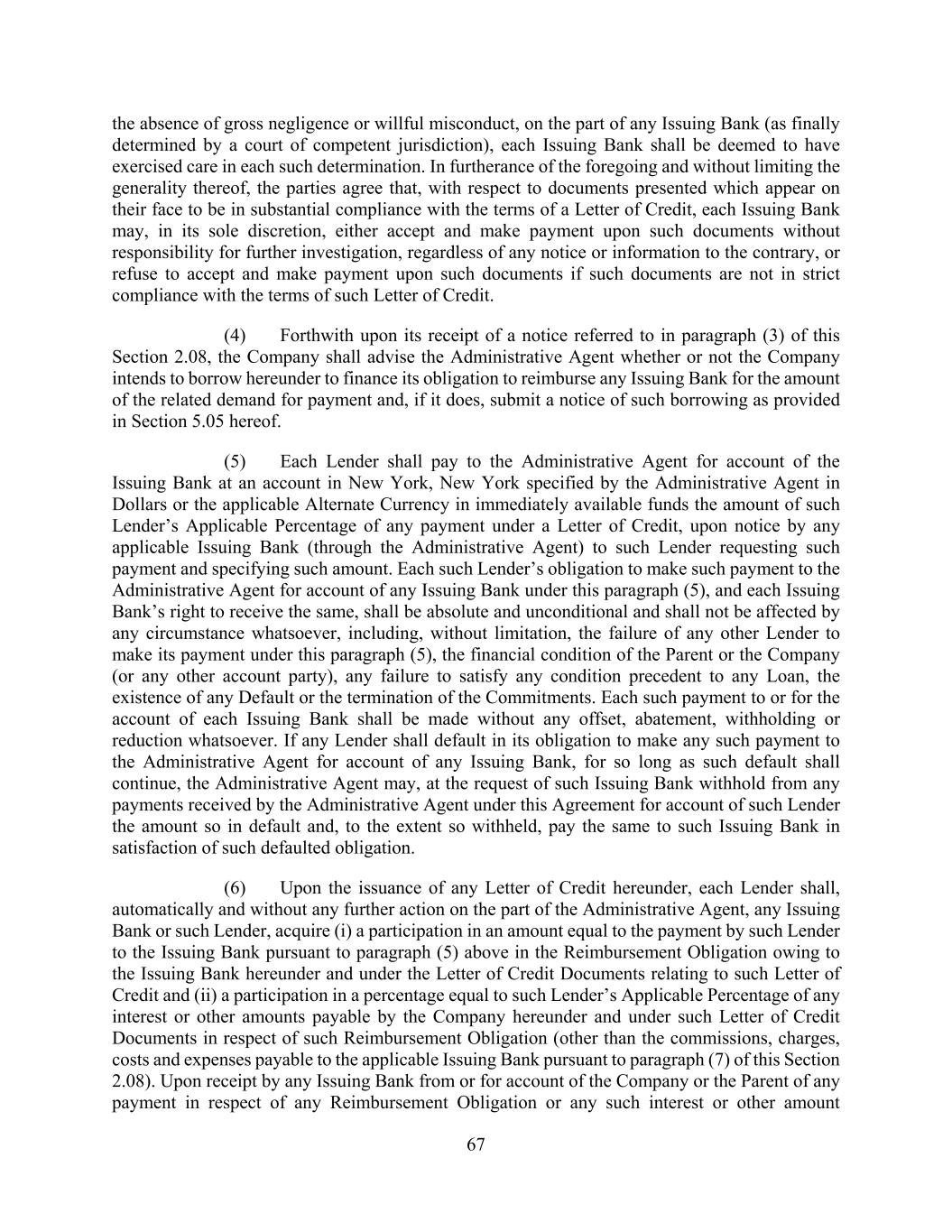 67 the absence of gross negligence or willful misconduct, on the part of any Issuing Bank (as finally determined by a court of competent jurisdiction), each Issuing Bank shall be deemed to have exercised care in each such determination. In furtherance of the foregoing and without limiting the generality thereof, the parties agree that, with respect to documents presented which appear on their face to be in substantial compliance with the terms of a Letter of Credit, each Issuing Bank may, in its sole discretion, either accept and make payment upon such documents without responsibility for further investigation, regardless of any notice or information to the contrary, or refuse to accept and make payment upon such documents if such documents are not in strict compliance with the terms of such Letter of Credit. (4) Forthwith upon its receipt of a notice referred to in paragraph (3) of this Section 2.08, the Company shall advise the Administrative Agent whether or not the Company intends to borrow hereunder to finance its obligation to reimburse any Issuing Bank for the amount of the related demand for payment and, if it does, submit a notice of such borrowing as provided in Section 5.05 hereof. (5) Each Lender shall pay to the Administrative Agent for account of the Issuing Bank at an account in New York, New York specified by the Administrative Agent in Dollars or the applicable Alternate Currency in immediately available funds the amount of such Lender’s Applicable Percentage of any payment under a Letter of Credit, upon notice by any applicable Issuing Bank (through the Administrative Agent) to such Lender requesting such payment and specifying such amount. Each such Lender’s obligation to make such payment to the Administrative Agent for account of any Issuing Bank under this paragraph (5), and each Issuing Bank’s right to receive the same, shall be absolute and unconditional and shall not be affected by any circumstance whatsoever, including, without limitation, the failure of any other Lender to make its payment under this paragraph (5), the financial condition of the Parent or the Company (or any other account party), any failure to satisfy any condition precedent to any Loan, the existence of any Default or the termination of the Commitments. Each such payment to or for the account of each Issuing Bank shall be made without any offset, abatement, withholding or reduction whatsoever. If any Lender shall default in its obligation to make any such payment to the Administrative Agent for account of any Issuing Bank, for so long as such default shall continue, the Administrative Agent may, at the request of such Issuing Bank withhold from any payments received by the Administrative Agent under this Agreement for account of such Lender the amount so in default and, to the extent so withheld, pay the same to such Issuing Bank in satisfaction of such defaulted obligation. (6) Upon the issuance of any Letter of Credit hereunder, each Lender shall, automatically and without any further action on the part of the Administrative Agent, any Issuing Bank or such Lender, acquire (i) a participation in an amount equal to the payment by such Lender to the Issuing Bank pursuant to paragraph (5) above in the Reimbursement Obligation owing to the Issuing Bank hereunder and under the Letter of Credit Documents relating to such Letter of Credit and (ii) a participation in a percentage equal to such Lender’s Applicable Percentage of any interest or other amounts payable by the Company hereunder and under such Letter of Credit Documents in respect of such Reimbursement Obligation (other than the commissions, charges, costs and expenses payable to the applicable Issuing Bank pursuant to paragraph (7) of this Section 2.08). Upon receipt by any Issuing Bank from or for account of the Company or the Parent of any payment in respect of any Reimbursement Obligation or any such interest or other amount