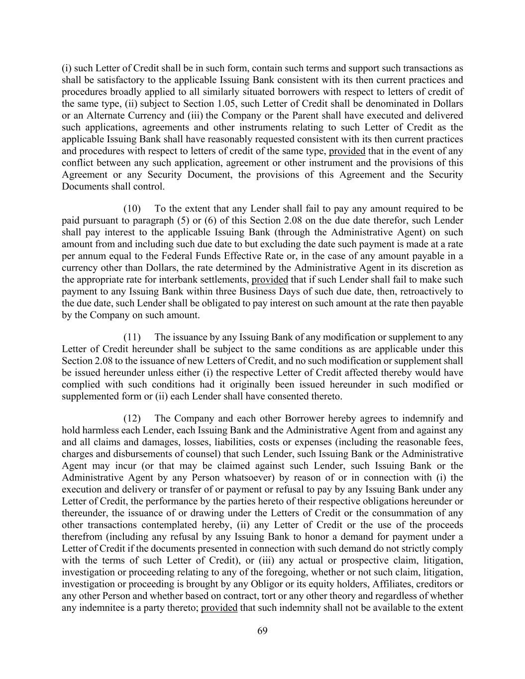 69 (i) such Letter of Credit shall be in such form, contain such terms and support such transactions as shall be satisfactory to the applicable Issuing Bank consistent with its then current practices and procedures broadly applied to all similarly situated borrowers with respect to letters of credit of the same type, (ii) subject to Section 1.05, such Letter of Credit shall be denominated in Dollars or an Alternate Currency and (iii) the Company or the Parent shall have executed and delivered such applications, agreements and other instruments relating to such Letter of Credit as the applicable Issuing Bank shall have reasonably requested consistent with its then current practices and procedures with respect to letters of credit of the same type, provided that in the event of any conflict between any such application, agreement or other instrument and the provisions of this Agreement or any Security Document, the provisions of this Agreement and the Security Documents shall control. (10) To the extent that any Lender shall fail to pay any amount required to be paid pursuant to paragraph (5) or (6) of this Section 2.08 on the due date therefor, such Lender shall pay interest to the applicable Issuing Bank (through the Administrative Agent) on such amount from and including such due date to but excluding the date such payment is made at a rate per annum equal to the Federal Funds Effective Rate or, in the case of any amount payable in a currency other than Dollars, the rate determined by the Administrative Agent in its discretion as the appropriate rate for interbank settlements, provided that if such Lender shall fail to make such payment to any Issuing Bank within three Business Days of such due date, then, retroactively to the due date, such Lender shall be obligated to pay interest on such amount at the rate then payable by the Company on such amount. (11) The issuance by any Issuing Bank of any modification or supplement to any Letter of Credit hereunder shall be subject to the same conditions as are applicable under this Section 2.08 to the issuance of new Letters of Credit, and no such modification or supplement shall be issued hereunder unless either (i) the respective Letter of Credit affected thereby would have complied with such conditions had it originally been issued hereunder in such modified or supplemented form or (ii) each Lender shall have consented thereto. (12) The Company and each other Borrower hereby agrees to indemnify and hold harmless each Lender, each Issuing Bank and the Administrative Agent from and against any and all claims and damages, losses, liabilities, costs or expenses (including the reasonable fees, charges and disbursements of counsel) that such Lender, such Issuing Bank or the Administrative Agent may incur (or that may be claimed against such Lender, such Issuing Bank or the Administrative Agent by any Person whatsoever) by reason of or in connection with (i) the execution and delivery or transfer of or payment or refusal to pay by any Issuing Bank under any Letter of Credit, the performance by the parties hereto of their respective obligations hereunder or thereunder, the issuance of or drawing under the Letters of Credit or the consummation of any other transactions contemplated hereby, (ii) any Letter of Credit or the use of the proceeds therefrom (including any refusal by any Issuing Bank to honor a demand for payment under a Letter of Credit if the documents presented in connection with such demand do not strictly comply with the terms of such Letter of Credit), or (iii) any actual or prospective claim, litigation, investigation or proceeding relating to any of the foregoing, whether or not such claim, litigation, investigation or proceeding is brought by any Obligor or its equity holders, Affiliates, creditors or any other Person and whether based on contract, tort or any other theory and regardless of whether any indemnitee is a party thereto; provided that such indemnity shall not be available to the extent