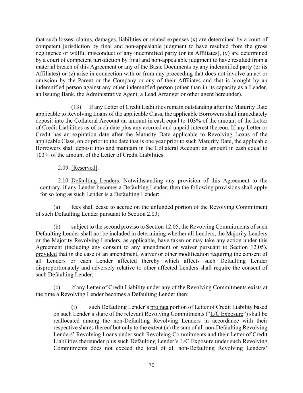 70 that such losses, claims, damages, liabilities or related expenses (x) are determined by a court of competent jurisdiction by final and non-appealable judgment to have resulted from the gross negligence or willful misconduct of any indemnified party (or its Affiliates), (y) are determined by a court of competent jurisdiction by final and non-appealable judgment to have resulted from a material breach of this Agreement or any of the Basic Documents by any indemnified party (or its Affiliates) or (z) arise in connection with or from any proceeding that does not involve an act or omission by the Parent or the Company or any of their Affiliates and that is brought by an indemnified person against any other indemnified person (other than in its capacity as a Lender, an Issuing Bank, the Administrative Agent, a Lead Arranger or other agent hereunder). (13) If any Letter of Credit Liabilities remain outstanding after the Maturity Date applicable to Revolving Loans of the applicable Class, the applicable Borrowers shall immediately deposit into the Collateral Account an amount in cash equal to 103% of the amount of the Letter of Credit Liabilities as of such date plus any accrued and unpaid interest thereon. If any Letter or Credit has an expiration date after the Maturity Date applicable to Revolving Loans of the applicable Class, on or prior to the date that is one year prior to such Maturity Date, the applicable Borrowers shall deposit into and maintain in the Collateral Account an amount in cash equal to 103% of the amount of the Letter of Credit Liabilities. 2.09. [Reserved]. 2.10. Defaulting Lenders. Notwithstanding any provision of this Agreement to the contrary, if any Lender becomes a Defaulting Lender, then the following provisions shall apply for so long as such Lender is a Defaulting Lender: (a) fees shall cease to accrue on the unfunded portion of the Revolving Commitment of such Defaulting Lender pursuant to Section 2.03; (b) subject to the second proviso to Section 12.05, the Revolving Commitments of such Defaulting Lender shall not be included in determining whether all Lenders, the Majority Lenders or the Majority Revolving Lenders, as applicable, have taken or may take any action under this Agreement (including any consent to any amendment or waiver pursuant to Section 12.05), provided that in the case of an amendment, waiver or other modification requiring the consent of all Lenders or each Lender affected thereby which affects such Defaulting Lender disproportionately and adversely relative to other affected Lenders shall require the consent of such Defaulting Lender; (c) if any Letter of Credit Liability under any of the Revolving Commitments exists at the time a Revolving Lender becomes a Defaulting Lender then: (i) such Defaulting Lender’s pro rata portion of Letter of Credit Liability based on such Lender’s share of the relevant Revolving Commitments (“L/C Exposure”) shall be reallocated among the non-Defaulting Revolving Lenders in accordance with their respective shares thereof but only to the extent (x) the sum of all non-Defaulting Revolving Lenders’ Revolving Loans under such Revolving Commitments and their Letter of Credit Liabilities thereunder plus such Defaulting Lender’s L/C Exposure under such Revolving Commitments does not exceed the total of all non-Defaulting Revolving Lenders’