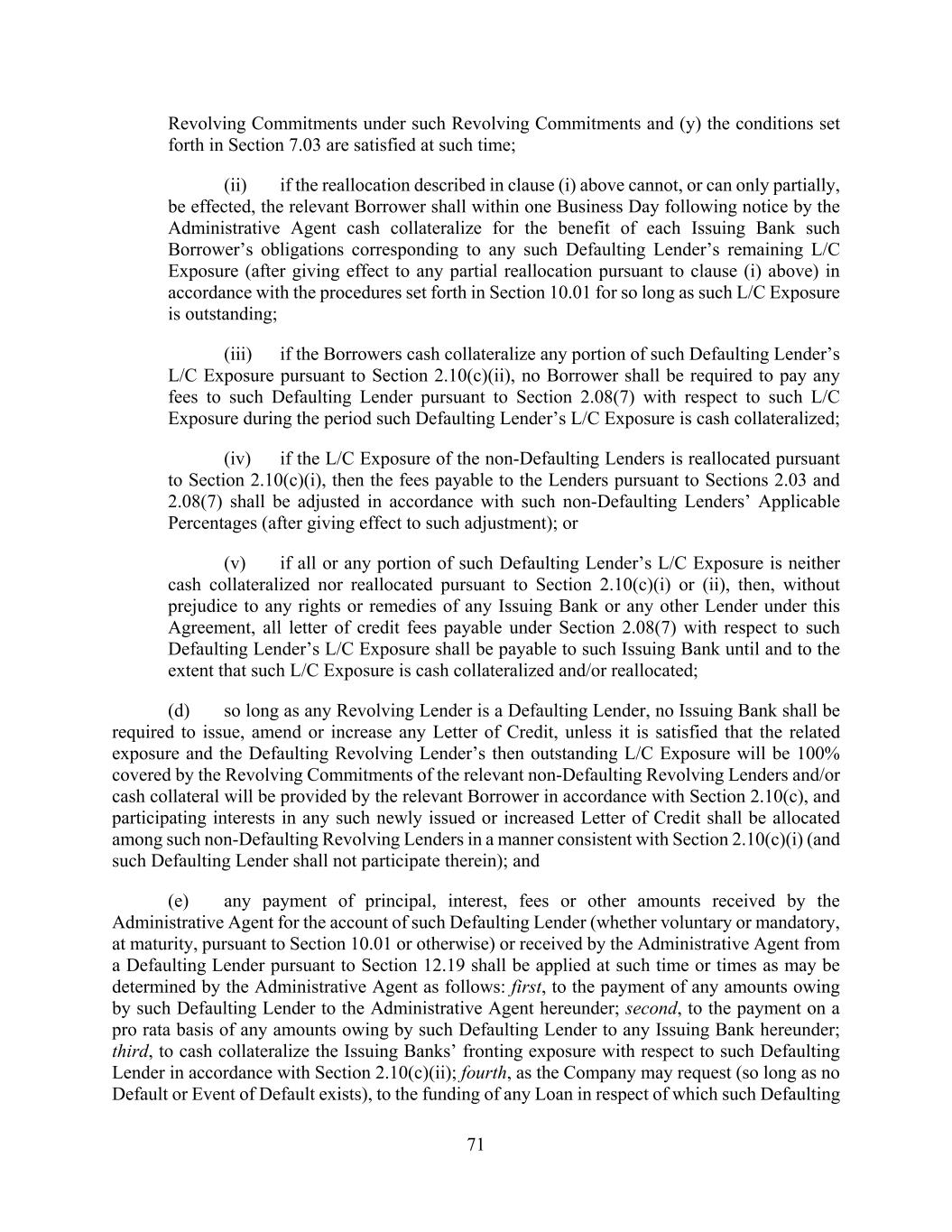 71 Revolving Commitments under such Revolving Commitments and (y) the conditions set forth in Section 7.03 are satisfied at such time; (ii) if the reallocation described in clause (i) above cannot, or can only partially, be effected, the relevant Borrower shall within one Business Day following notice by the Administrative Agent cash collateralize for the benefit of each Issuing Bank such Borrower’s obligations corresponding to any such Defaulting Lender’s remaining L/C Exposure (after giving effect to any partial reallocation pursuant to clause (i) above) in accordance with the procedures set forth in Section 10.01 for so long as such L/C Exposure is outstanding; (iii) if the Borrowers cash collateralize any portion of such Defaulting Lender’s L/C Exposure pursuant to Section 2.10(c)(ii), no Borrower shall be required to pay any fees to such Defaulting Lender pursuant to Section 2.08(7) with respect to such L/C Exposure during the period such Defaulting Lender’s L/C Exposure is cash collateralized; (iv) if the L/C Exposure of the non-Defaulting Lenders is reallocated pursuant to Section 2.10(c)(i), then the fees payable to the Lenders pursuant to Sections 2.03 and 2.08(7) shall be adjusted in accordance with such non-Defaulting Lenders’ Applicable Percentages (after giving effect to such adjustment); or (v) if all or any portion of such Defaulting Lender’s L/C Exposure is neither cash collateralized nor reallocated pursuant to Section 2.10(c)(i) or (ii), then, without prejudice to any rights or remedies of any Issuing Bank or any other Lender under this Agreement, all letter of credit fees payable under Section 2.08(7) with respect to such Defaulting Lender’s L/C Exposure shall be payable to such Issuing Bank until and to the extent that such L/C Exposure is cash collateralized and/or reallocated; (d) so long as any Revolving Lender is a Defaulting Lender, no Issuing Bank shall be required to issue, amend or increase any Letter of Credit, unless it is satisfied that the related exposure and the Defaulting Revolving Lender’s then outstanding L/C Exposure will be 100% covered by the Revolving Commitments of the relevant non-Defaulting Revolving Lenders and/or cash collateral will be provided by the relevant Borrower in accordance with Section 2.10(c), and participating interests in any such newly issued or increased Letter of Credit shall be allocated among such non-Defaulting Revolving Lenders in a manner consistent with Section 2.10(c)(i) (and such Defaulting Lender shall not participate therein); and (e) any payment of principal, interest, fees or other amounts received by the Administrative Agent for the account of such Defaulting Lender (whether voluntary or mandatory, at maturity, pursuant to Section 10.01 or otherwise) or received by the Administrative Agent from a Defaulting Lender pursuant to Section 12.19 shall be applied at such time or times as may be determined by the Administrative Agent as follows: first, to the payment of any amounts owing by such Defaulting Lender to the Administrative Agent hereunder; second, to the payment on a pro rata basis of any amounts owing by such Defaulting Lender to any Issuing Bank hereunder; third, to cash collateralize the Issuing Banks’ fronting exposure with respect to such Defaulting Lender in accordance with Section 2.10(c)(ii); fourth, as the Company may request (so long as no Default or Event of Default exists), to the funding of any Loan in respect of which such Defaulting