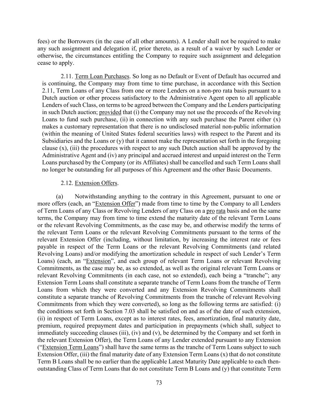 73 fees) or the Borrowers (in the case of all other amounts). A Lender shall not be required to make any such assignment and delegation if, prior thereto, as a result of a waiver by such Lender or otherwise, the circumstances entitling the Company to require such assignment and delegation cease to apply. 2.11. Term Loan Purchases. So long as no Default or Event of Default has occurred and is continuing, the Company may from time to time purchase, in accordance with this Section 2.11, Term Loans of any Class from one or more Lenders on a non-pro rata basis pursuant to a Dutch auction or other process satisfactory to the Administrative Agent open to all applicable Lenders of such Class, on terms to be agreed between the Company and the Lenders participating in such Dutch auction; provided that (i) the Company may not use the proceeds of the Revolving Loans to fund such purchase, (ii) in connection with any such purchase the Parent either (x) makes a customary representation that there is no undisclosed material non-public information (within the meaning of United States federal securities laws) with respect to the Parent and its Subsidiaries and the Loans or (y) that it cannot make the representation set forth in the foregoing clause (x), (iii) the procedures with respect to any such Dutch auction shall be approved by the Administrative Agent and (iv) any principal and accrued interest and unpaid interest on the Term Loans purchased by the Company (or its Affiliates) shall be cancelled and such Term Loans shall no longer be outstanding for all purposes of this Agreement and the other Basic Documents. 2.12. Extension Offers. (a) Notwithstanding anything to the contrary in this Agreement, pursuant to one or more offers (each, an “Extension Offer”) made from time to time by the Company to all Lenders of Term Loans of any Class or Revolving Lenders of any Class on a pro rata basis and on the same terms, the Company may from time to time extend the maturity date of the relevant Term Loans or the relevant Revolving Commitments, as the case may be, and otherwise modify the terms of the relevant Term Loans or the relevant Revolving Commitments pursuant to the terms of the relevant Extension Offer (including, without limitation, by increasing the interest rate or fees payable in respect of the Term Loans or the relevant Revolving Commitments (and related Revolving Loans) and/or modifying the amortization schedule in respect of such Lender’s Term Loans) (each, an “Extension”, and each group of relevant Term Loans or relevant Revolving Commitments, as the case may be, as so extended, as well as the original relevant Term Loans or relevant Revolving Commitments (in each case, not so extended), each being a “tranche”; any Extension Term Loans shall constitute a separate tranche of Term Loans from the tranche of Term Loans from which they were converted and any Extension Revolving Commitments shall constitute a separate tranche of Revolving Commitments from the tranche of relevant Revolving Commitments from which they were converted), so long as the following terms are satisfied: (i) the conditions set forth in Section 7.03 shall be satisfied on and as of the date of such extension, (ii) in respect of Term Loans, except as to interest rates, fees, amortization, final maturity date, premium, required prepayment dates and participation in prepayments (which shall, subject to immediately succeeding clauses (iii), (iv) and (v), be determined by the Company and set forth in the relevant Extension Offer), the Term Loans of any Lender extended pursuant to any Extension (“Extension Term Loans”) shall have the same terms as the tranche of Term Loans subject to such Extension Offer, (iii) the final maturity date of any Extension Term Loans (x) that do not constitute Term B Loans shall be no earlier than the applicable Latest Maturity Date applicable to each then- outstanding Class of Term Loans that do not constitute Term B Loans and (y) that constitute Term